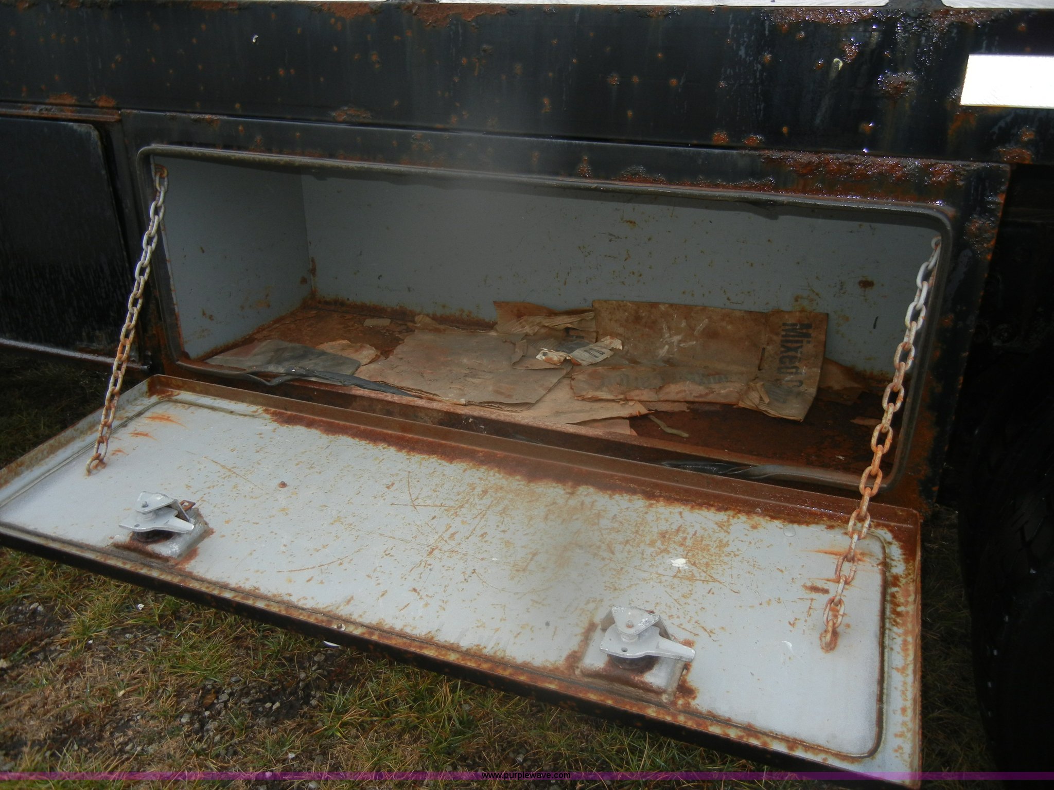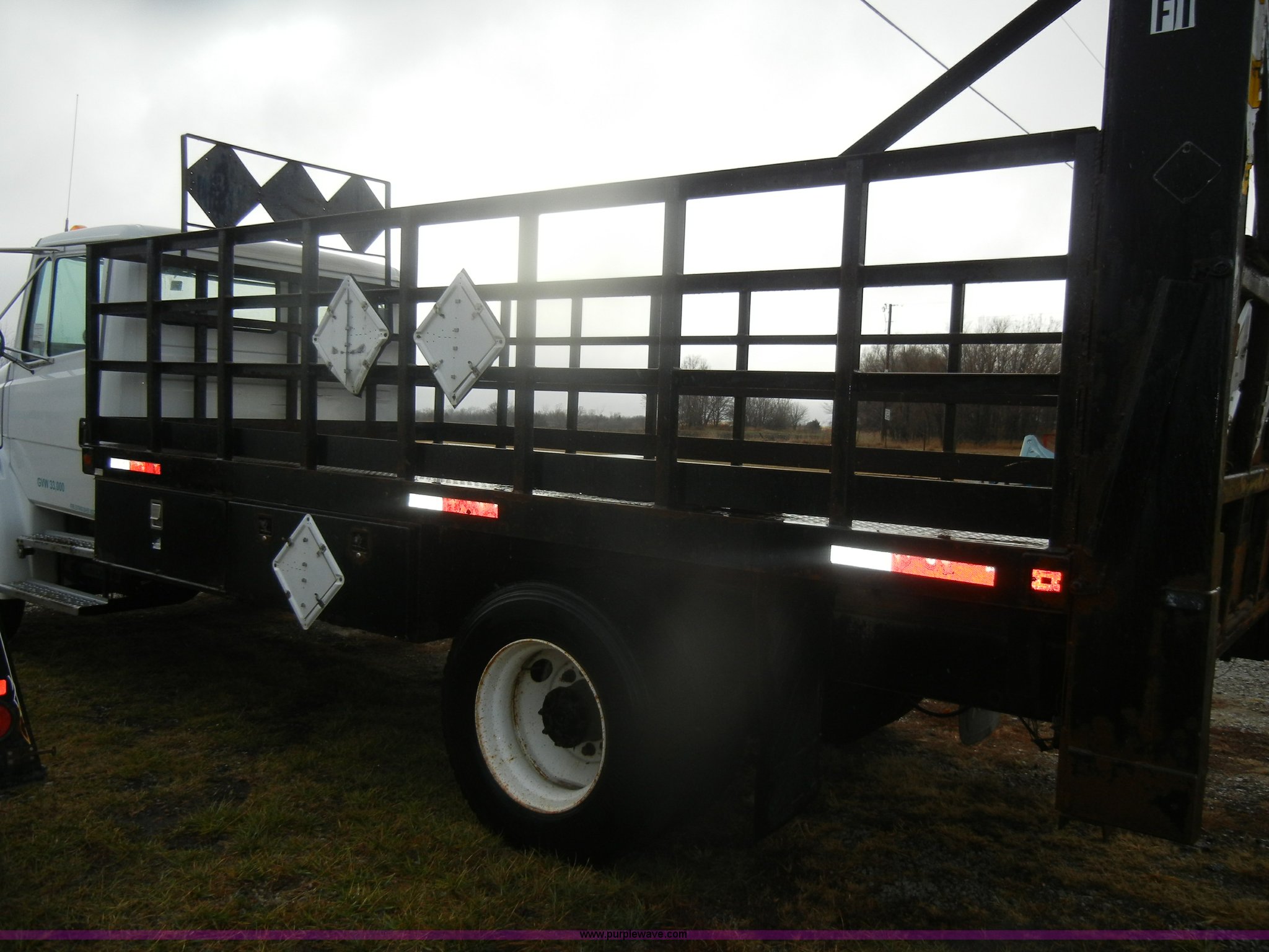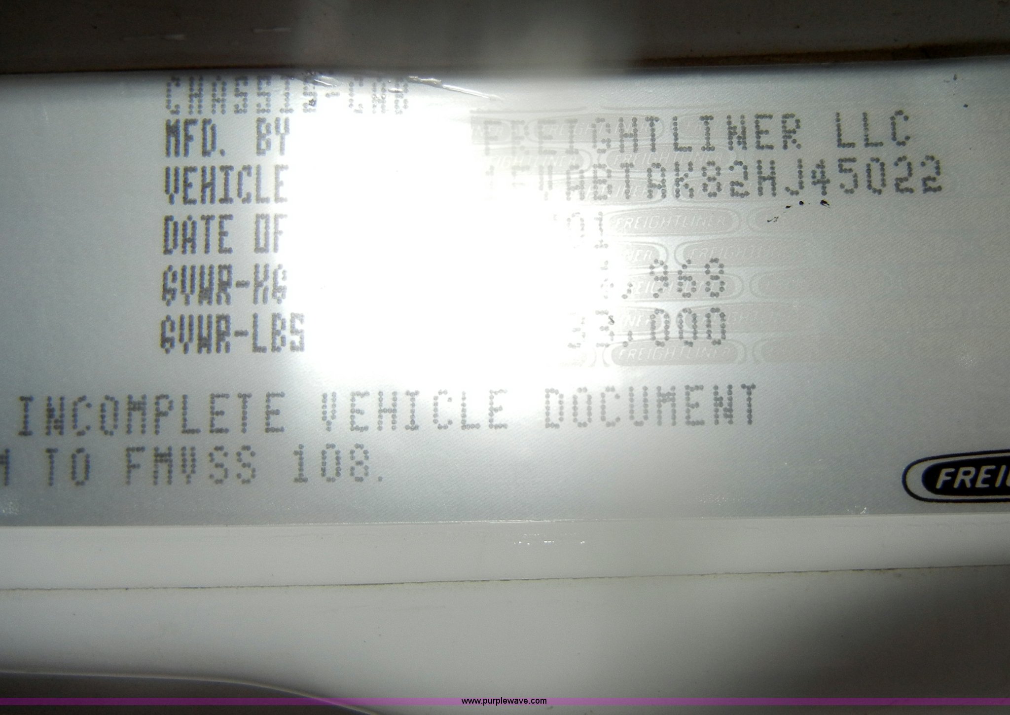 2002 Freightliner FL70. 199,708 miles on odometer, Caterpillar 3126 7.2L L6 diesel engine, Eaton Fuller automatic transmission, AC and heat, Tilt, Telescopic steering wheel, Cruise, AM/FM, Manual windows and locks, Power mirrors, Air suspension seat, Cloth interior, Dual rear windows, Heated mirrors, block heater, 75 gallon fuel tank, (4) toolboxes Some rusted, Maibar 16'L x 8' bed Steel plated, 40" sides, Air suspension over spring, Air brakes, 3,500 lbs capacity lift gate, 275/80R22.5 tires, GVWR 33,000 lbs, FAWR 12,000 lbs, RAWR 21,000 lbs, Paint peeling on front grill, Manuals included. 1FVABTAK82HJ45022. View equipment video. Shipping quotes available. 6124 NW Jennings Road. Topeka, KS 66618