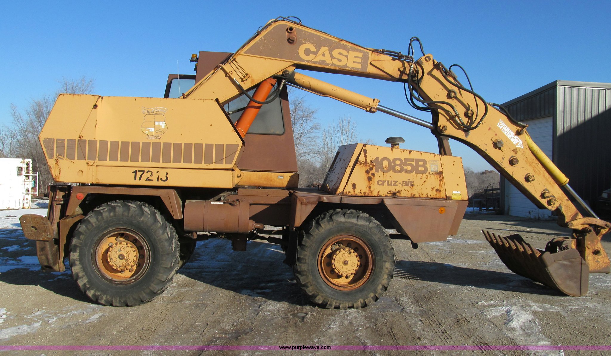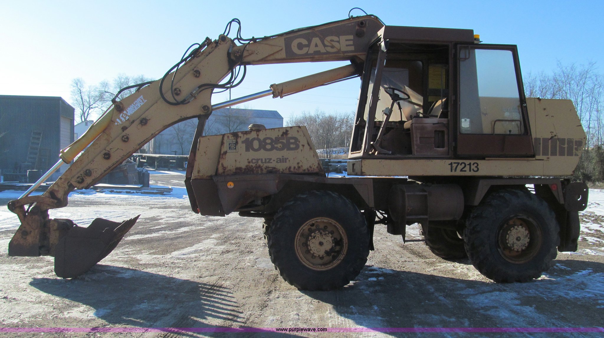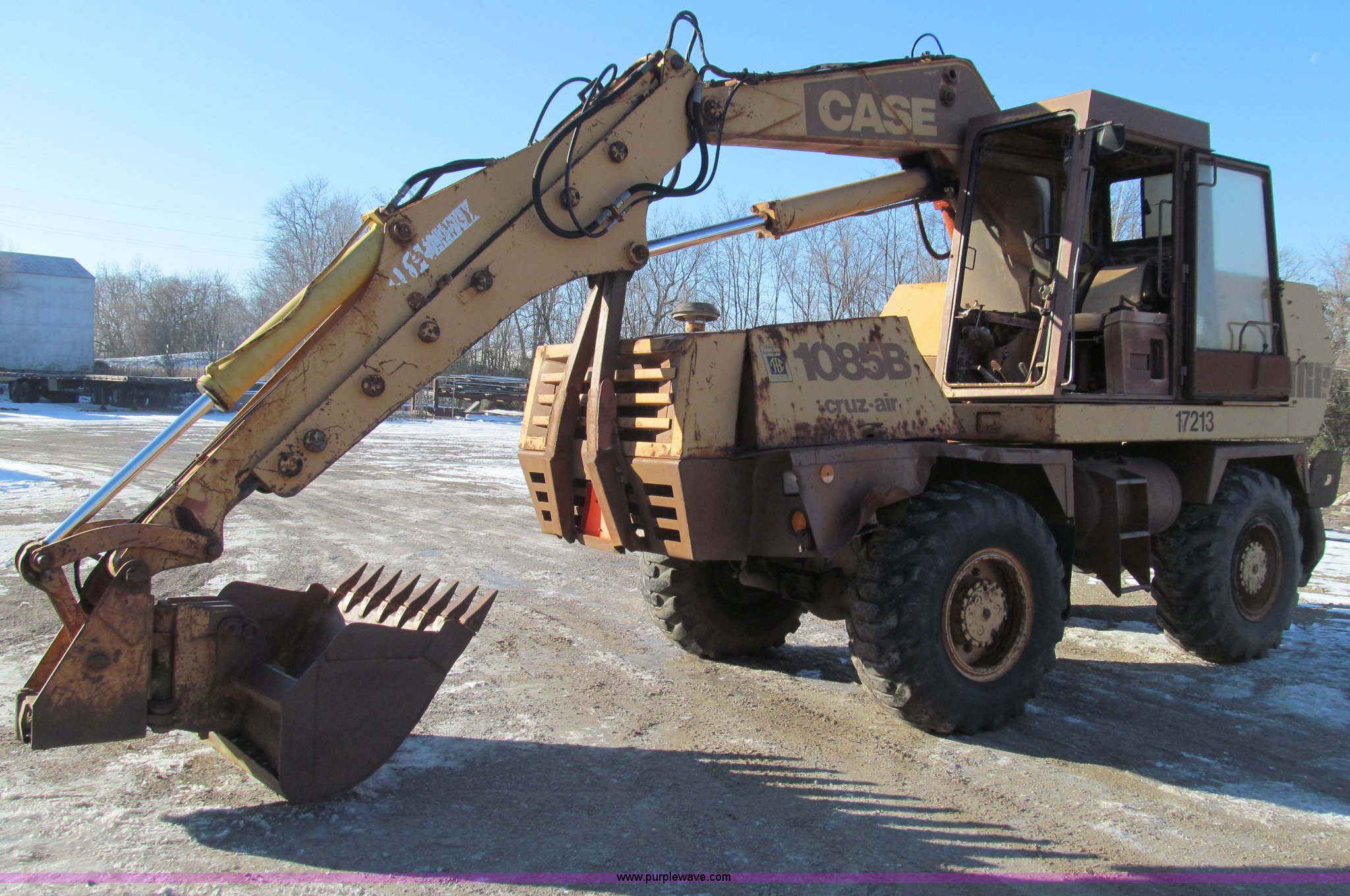 Purple Wave is selling a used Rubber Tired Excavator in Missouri. This item is a 1985 Case 1085B Cruz-Air mobile excavator with the following: 4,079 hours on meter, Cummins 938 six cylinder diesel engine, Clark transmission, Three speed forward and reverse, Four wheel drive, 25' reach, 36"W bucket, 17.5-25 tires, Manuals included, Unattached front windshield available, 38,870 lbs. base operating weight, Serial 6293775