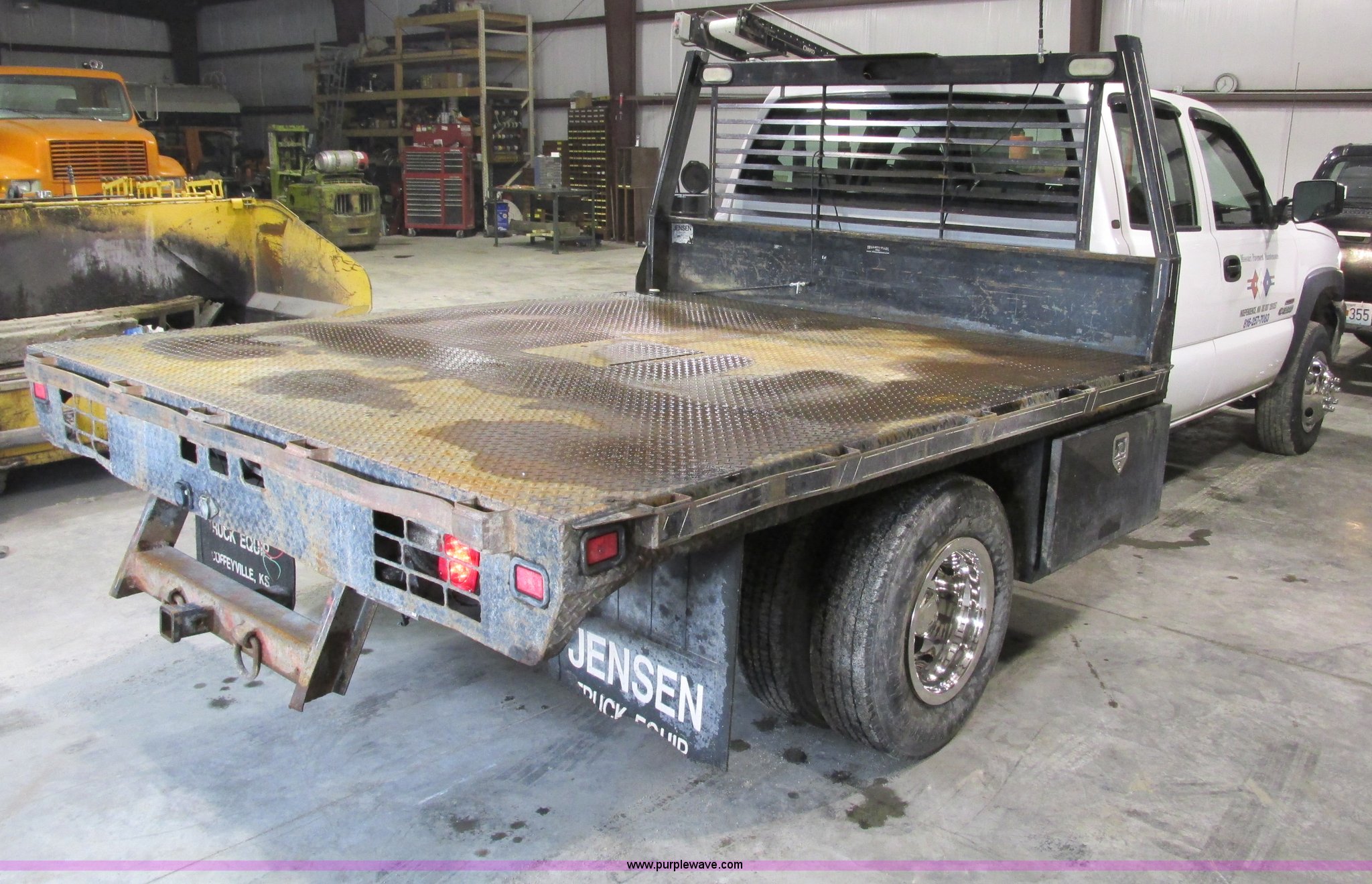 Purple Wave is selling a used Passenger Vehicle in Missouri. This item is a 2004 Chevrolet Silverado 3500 Crew Cab flatbed pickup truck with the following: Duramax 6.6L V8 OHV 32V diesel engine, Allison automatic transmission, AC and heat, Tilt, Cruise, AM/FM/CD, Manual windows and locks, Vinyl interior, Draw-Tite trailer brake system, Jensen 9'L x 94"W flatbed, Model FB, (5) stake pockets per side, (5) stake pockets on rear, Headache rack, Toolbox, Serial 200612009, Mud flaps, Rain guards, Adjustable tow mirrors, Receiver hitch, Trailer wiring, 215/85R16 tires, Interior/exterior cosmetic damage, Cracked windshield, Engine runs rough, Gear shifter is loose