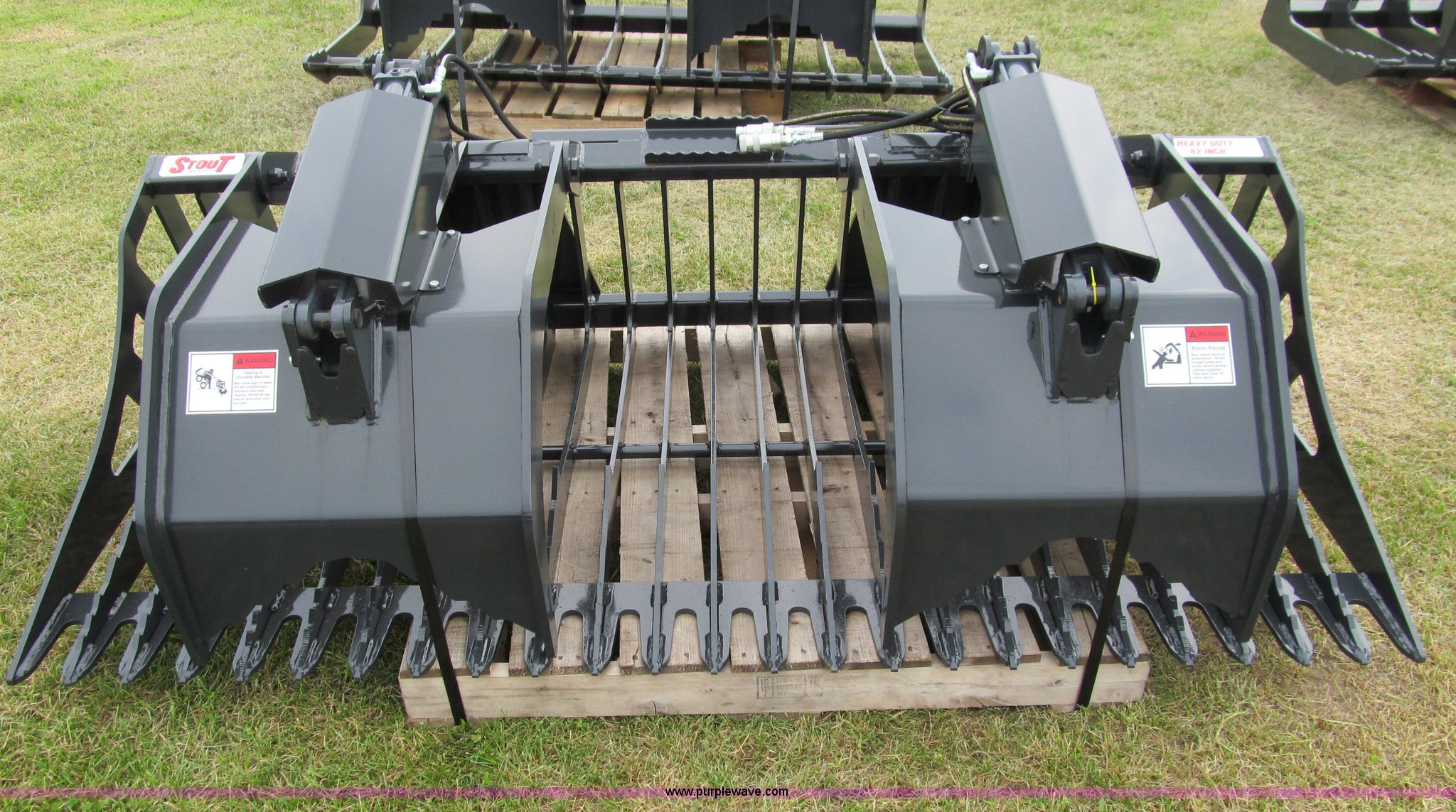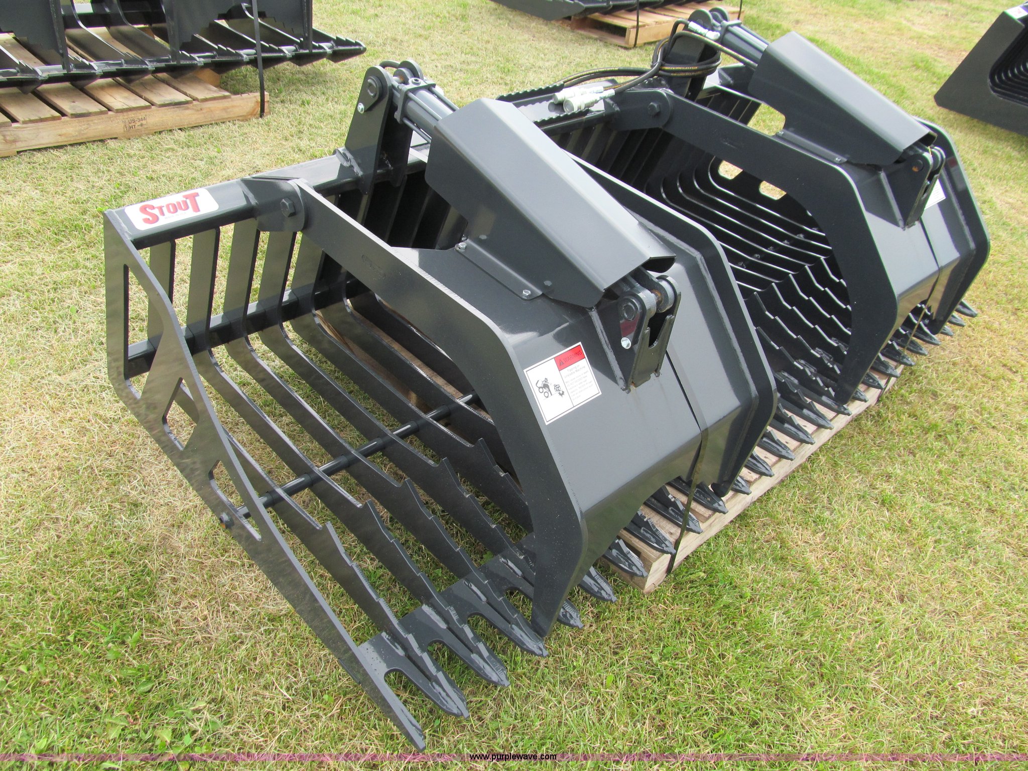 Purple Wave is selling a used Other Attach. or Equip. in Wisconsin. This item is a Stout XHD82 rock bucket grapple attachment with the following: High strength 1/2" and 3/8" steel, Universal quick attach plate, 82" x 43" x 30", 3" tine spacing, 39" grapple opening, 3,045 psi hydraulic lines, NPT 1/2" hydraulic flat-faced couplers, Cylinder guards, Unused