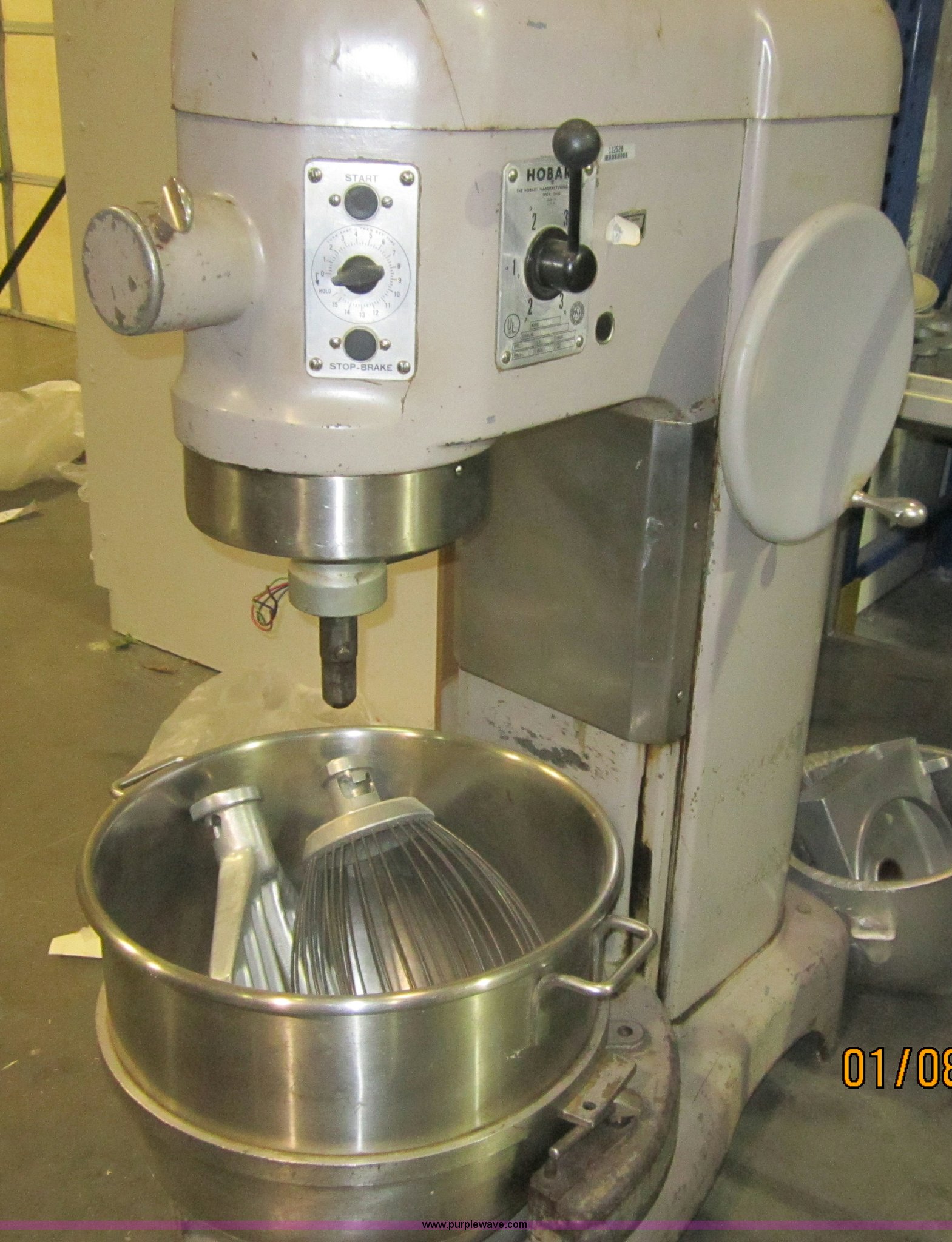 Purple Wave is selling a used Restaurant Equip. in Kansas. This item is a Hobart L-800 mixer with the following: Three phase, 208V, Attachments, Serial 1628553