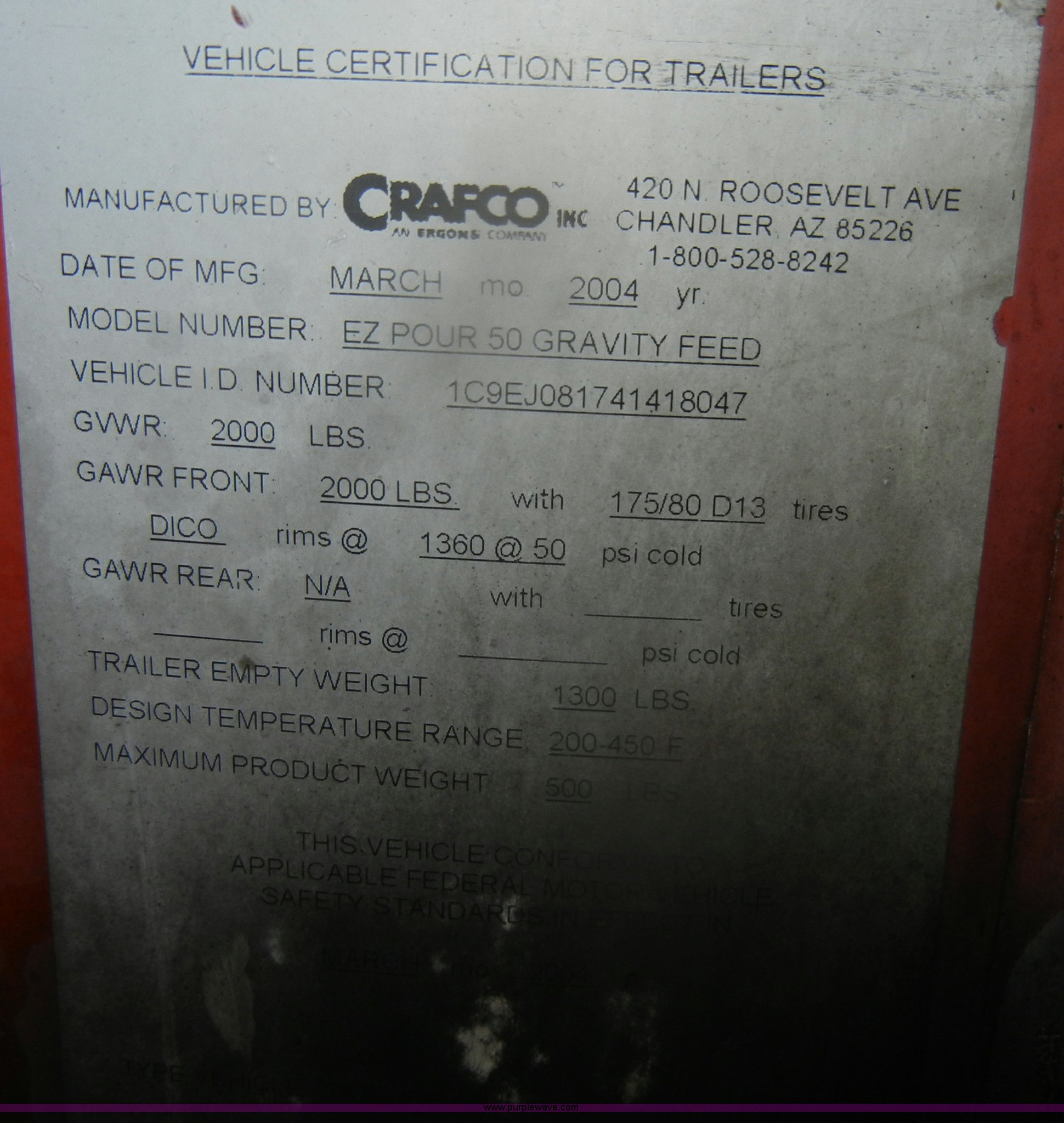 Craft Co EZ Pour 50 melter/applicator. Honda GX160 engine, 2" ball, lights, chains, jack, 175/80D13 tires, GVWR 2,000 lbs. 1C9EJ081741418047. Shipping quotes available. City of Minneapolis. 218 N Rock. Minneapolis, KS 67467