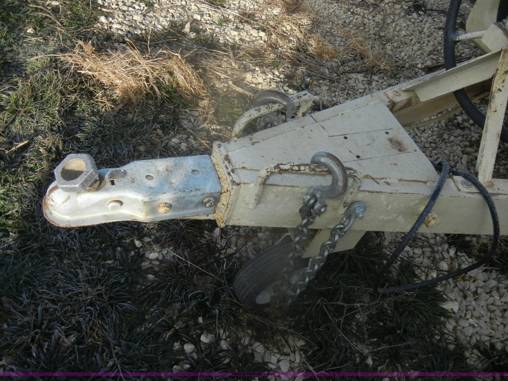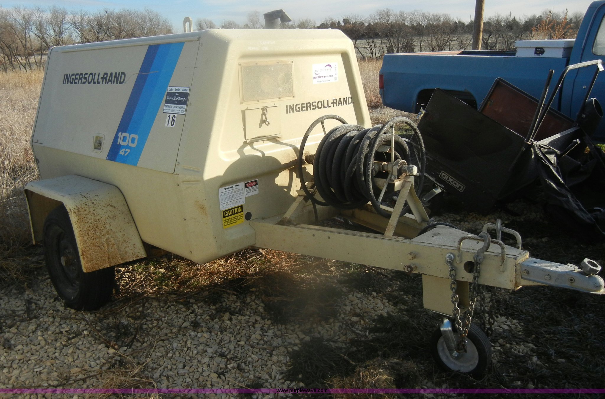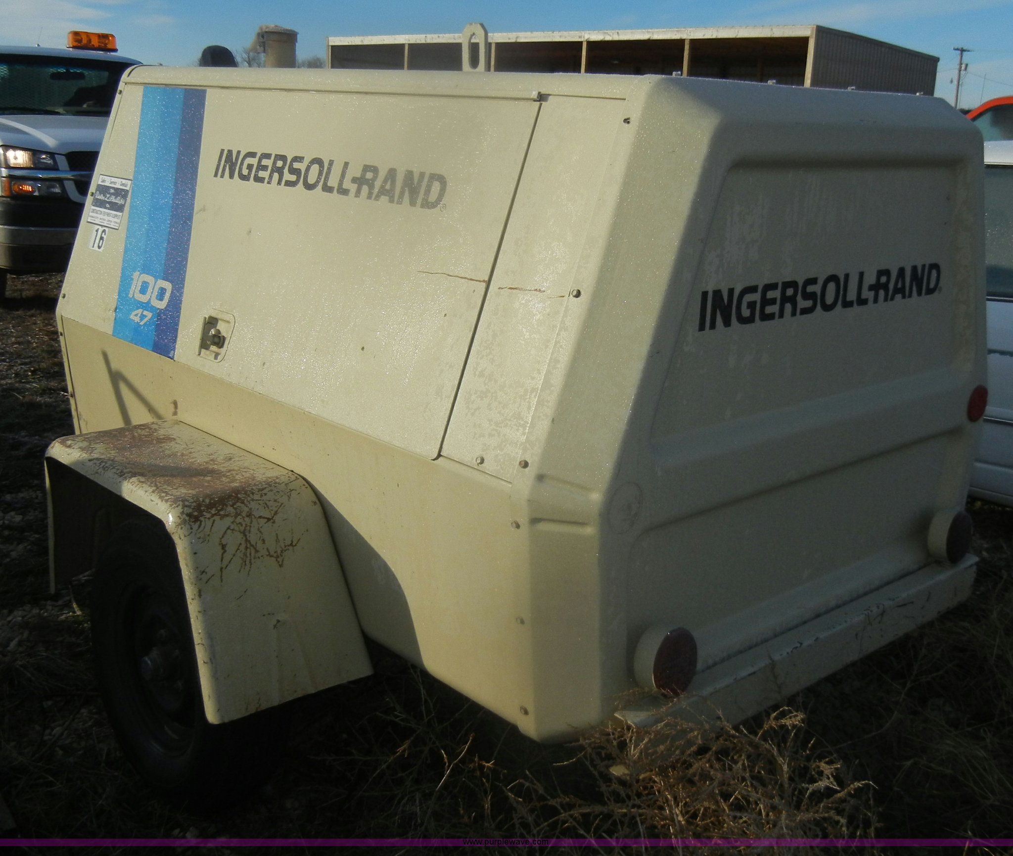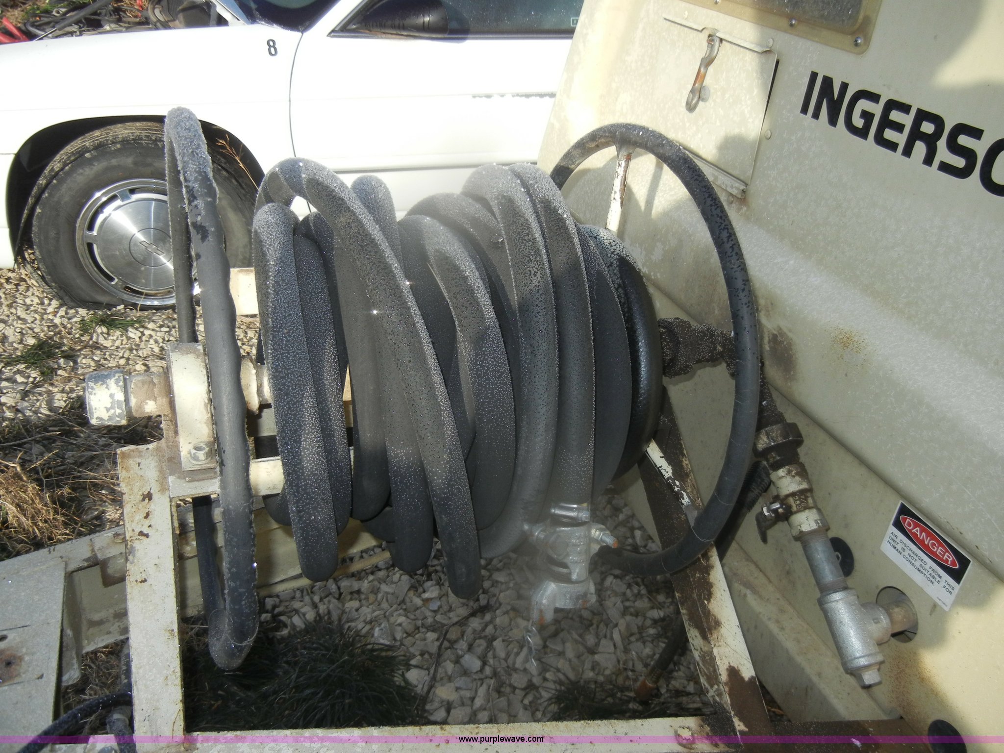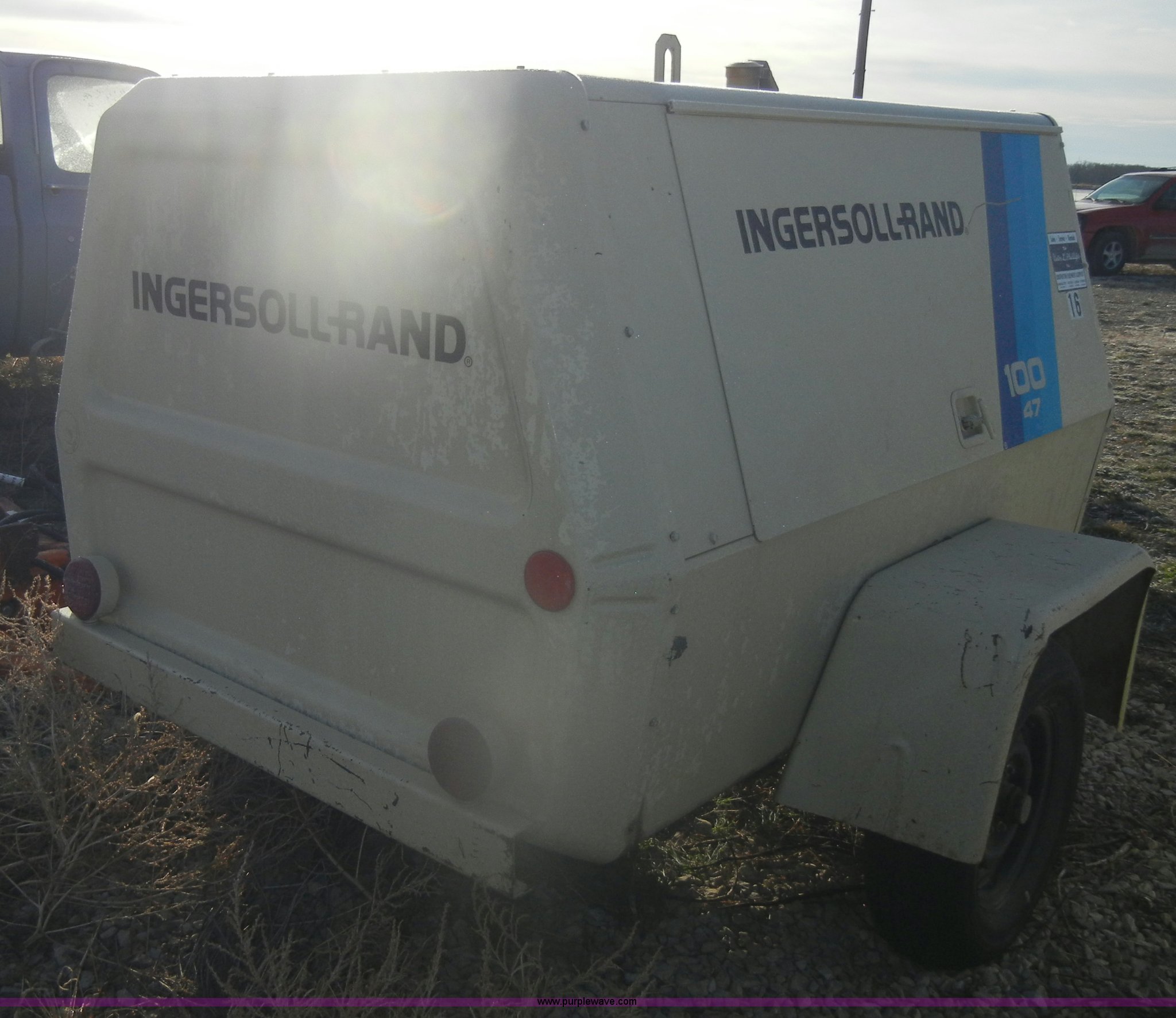 Purple Wave is selling a used Air Compressor in Kansas. This item is a 1984 Ingersoll Rand air compressor with the following: 621 hours on meter, Model P100BWW, White gas engine, Model G1600, Serial AD4922537G1600, 2" ball, chains, and lights, Approx. 50' air hose, 185/80B13, Serial 138803U84133