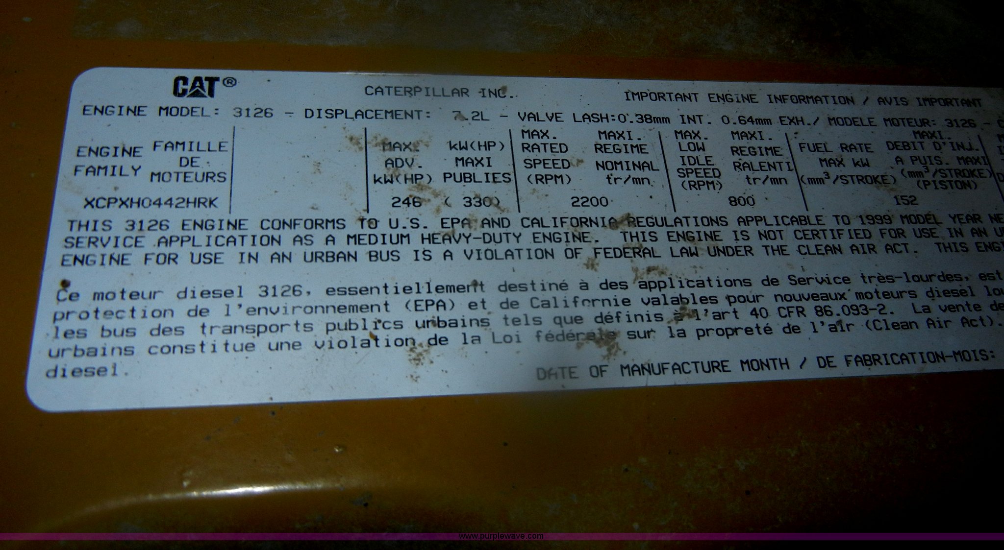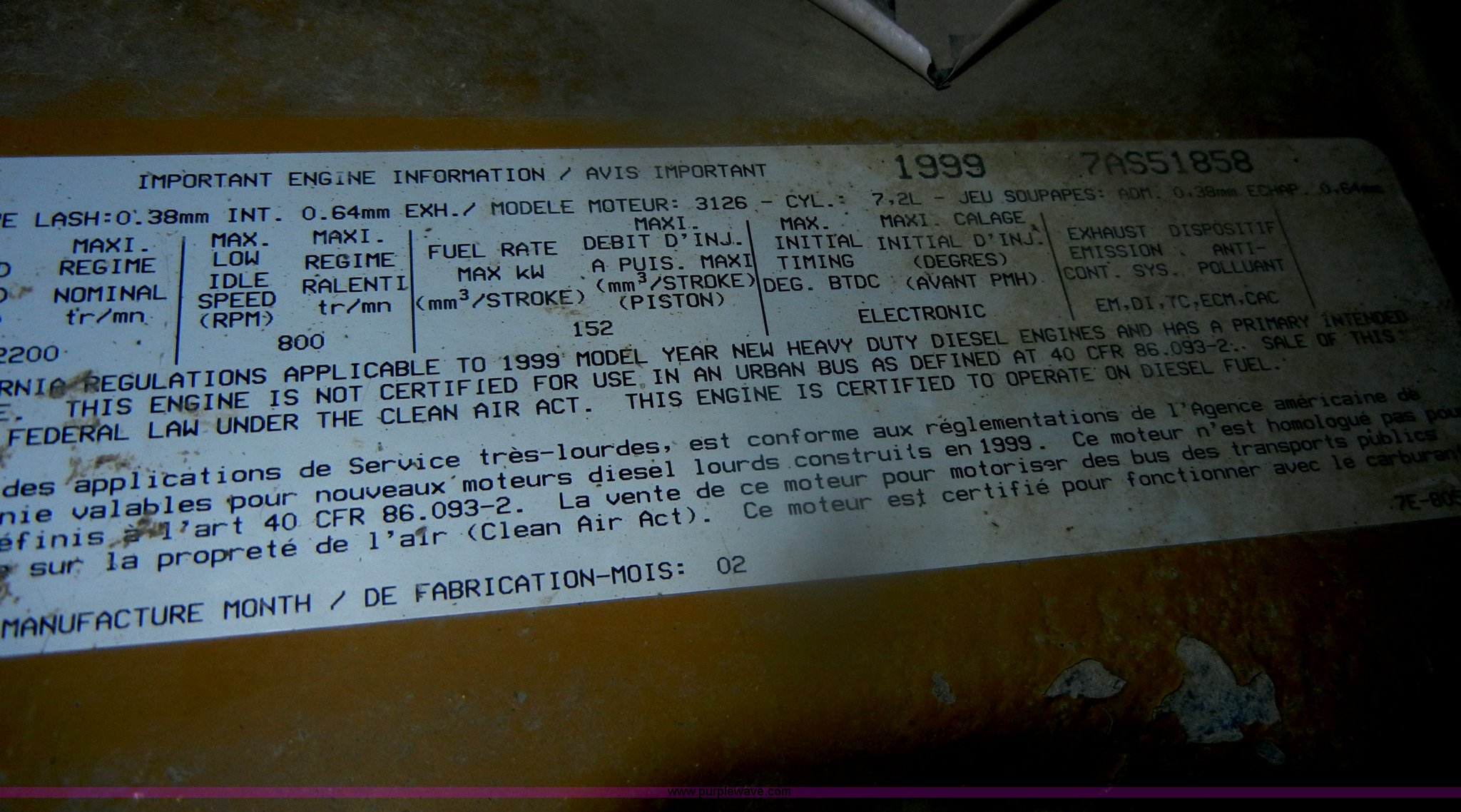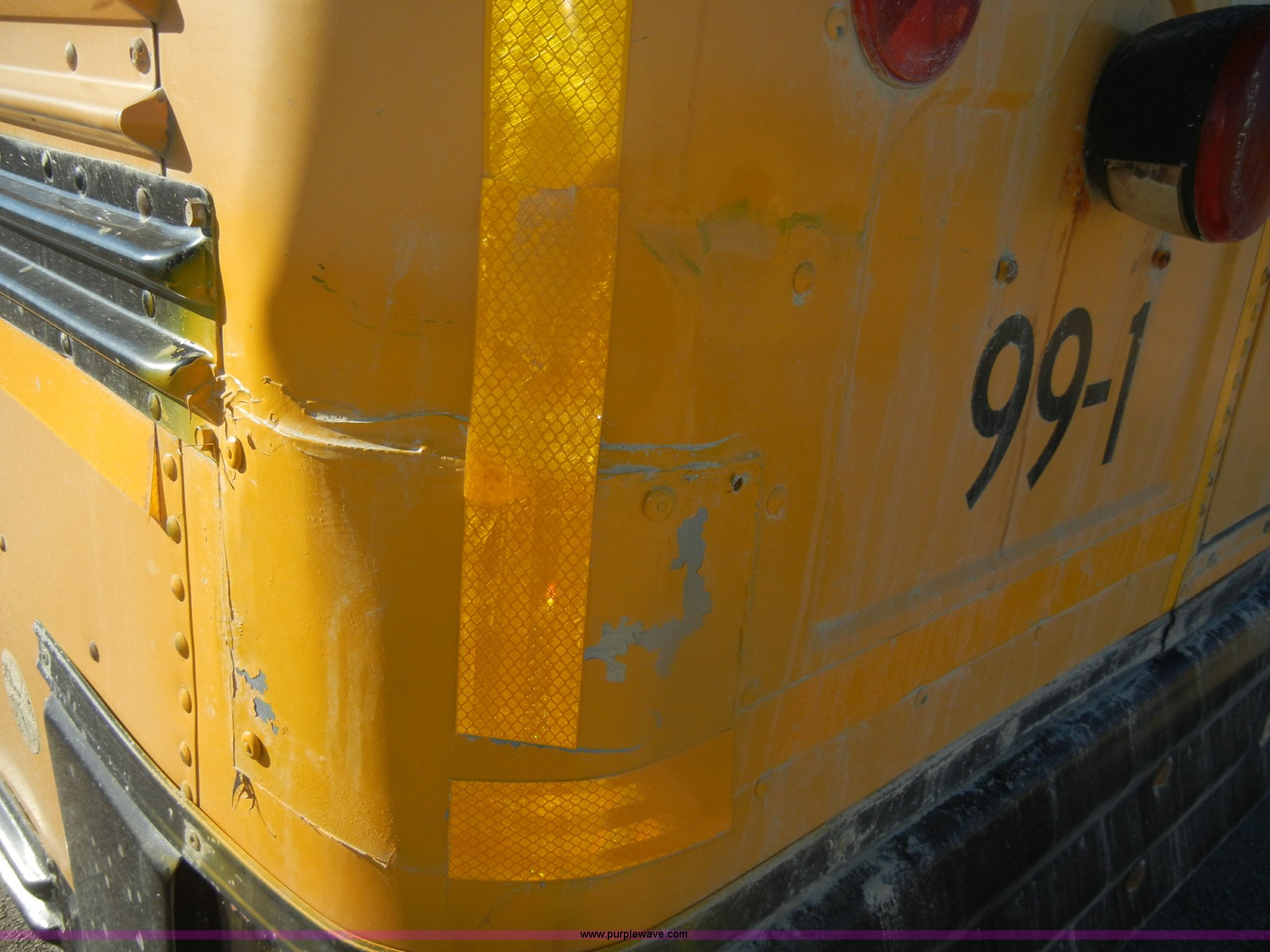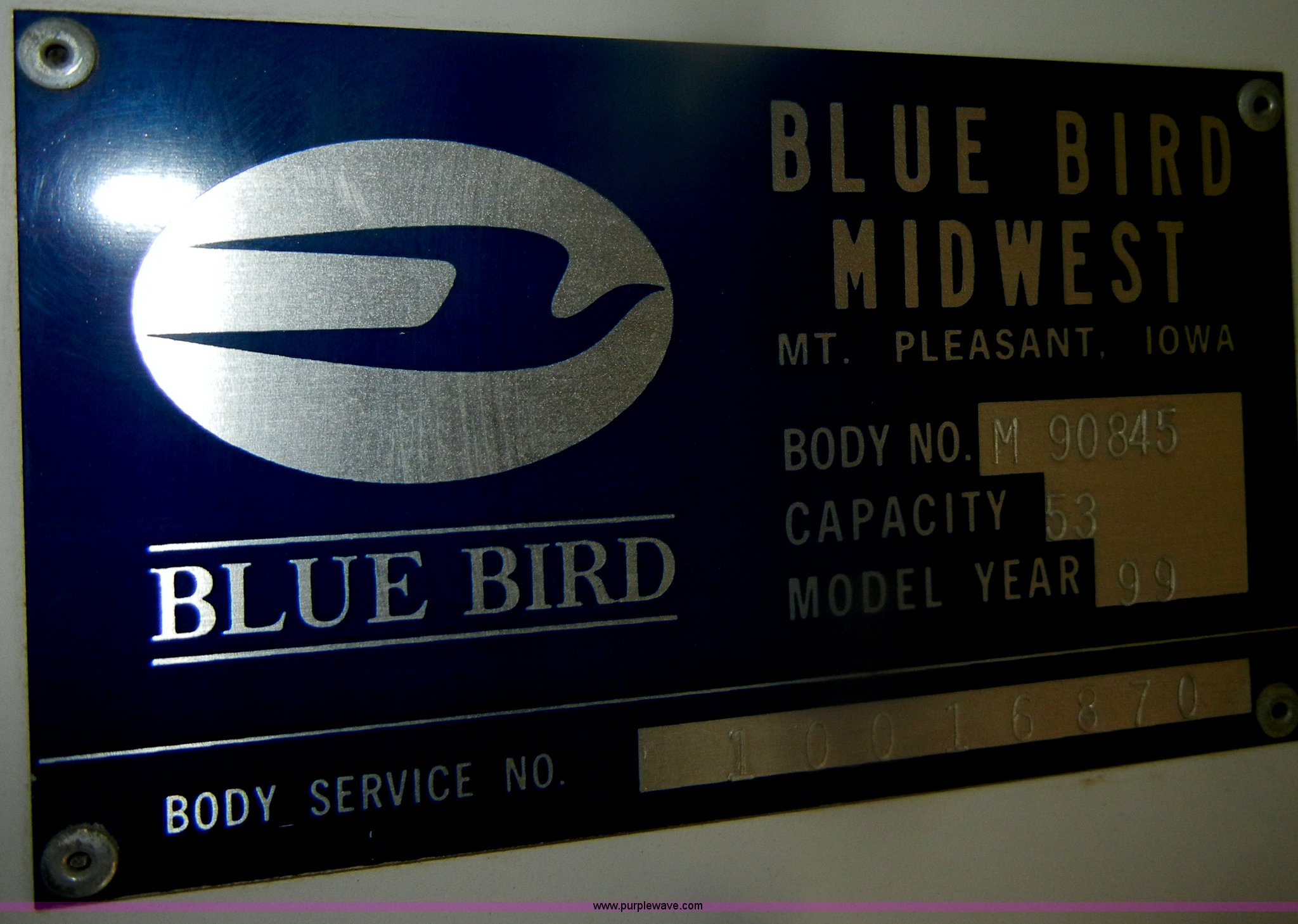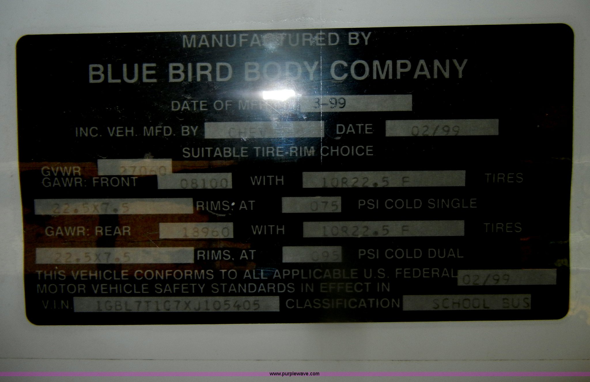 Purple Wave is selling a used Bus in Kansas. This item is a 1999 Chevrolet Blue Bird school bus with the following: 181,105 miles on odometer, Caterpillar 3126 7.2L L6 diesel engine, 142 HP, Serial 7A551858, Automatic transmission, Heat, AM/FM, Manual windows, Vinyl interior, Heated mirrors, 53 passenger capacity, Body no. M90845, 10R22.5 tires, GVWR 27,060 lbs, FAWR 8,100 lbs, RAWR 18,960 lbs, Exterior cosmetic damage, Paint peeling