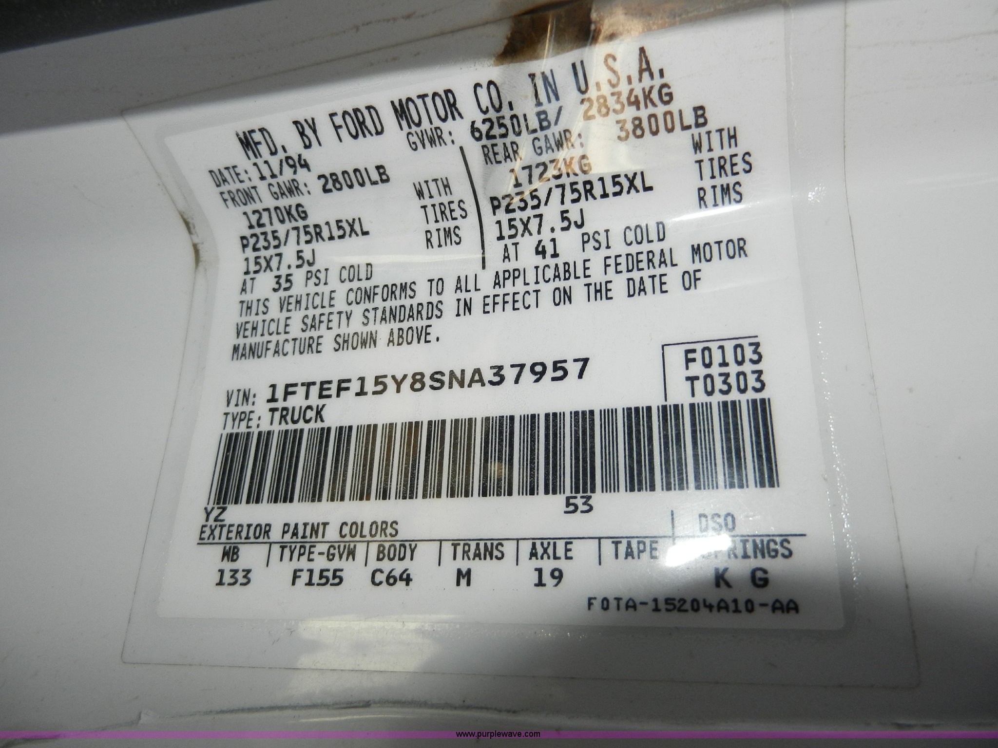 1995 Ford F150 XL pickup truck. 76,118 last known mileage, 4.9L L6 OHV 12V gas engine Overheats, Five speed manual transmission, AC and heat, AM/FM, Manual windows and locks, Cloth interior, Long bed, Toolbox, Receiver hitch, Trailer wiring, 235/75R15 tires, Service records available, Interior/exterior cosmetic damage, Dents and scratches, Body rust, Dead battery, Engine overheats, Non-operational, must be towed. 1FTEF15Y8SNA37957. Shipping quotes available. City of Ottawa. 324 Beech. Ottawa, KS 66067