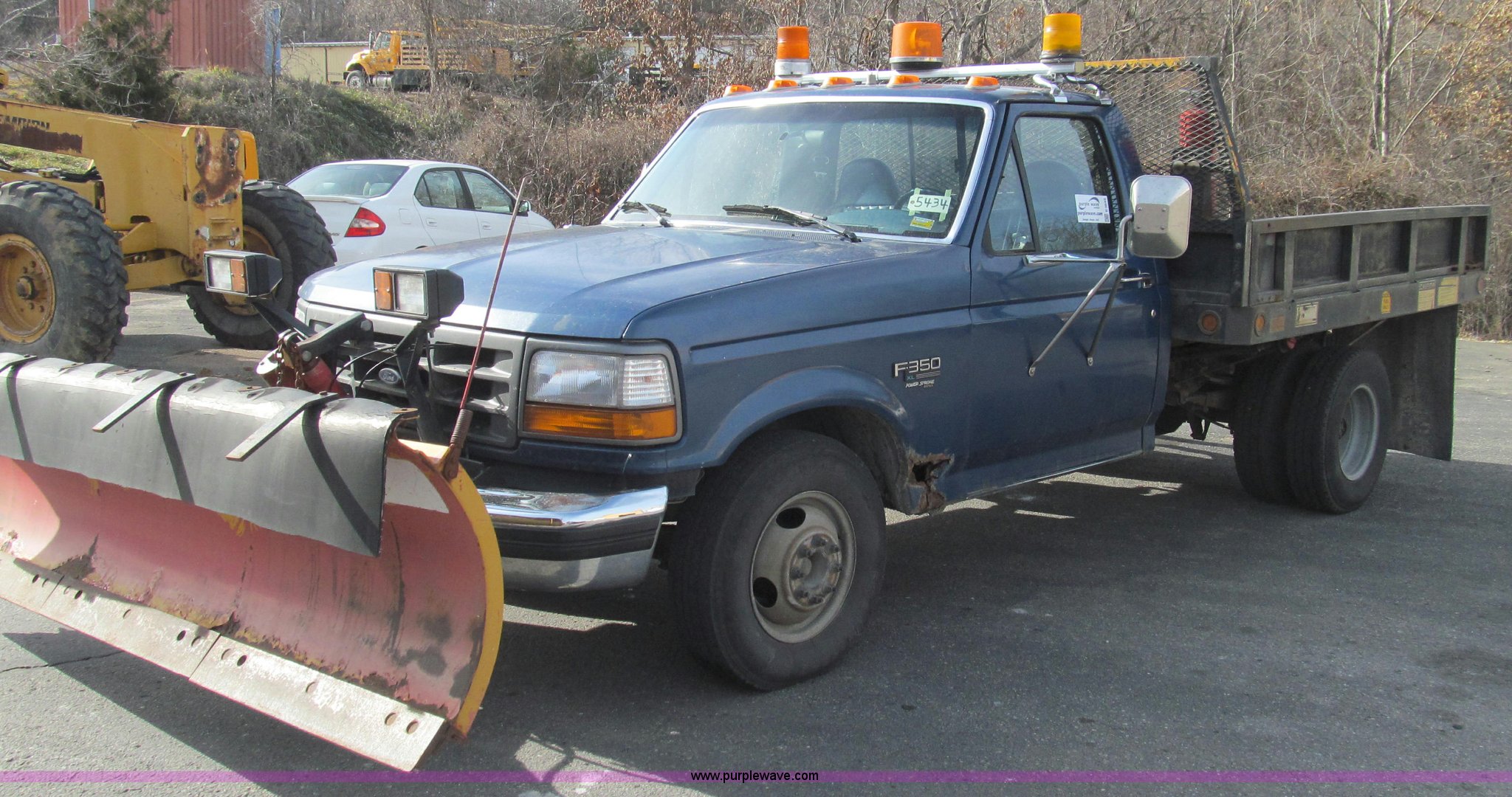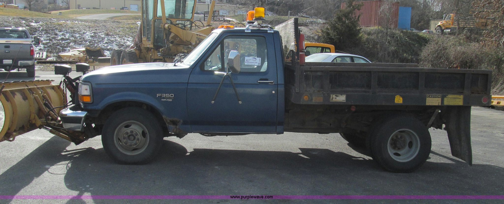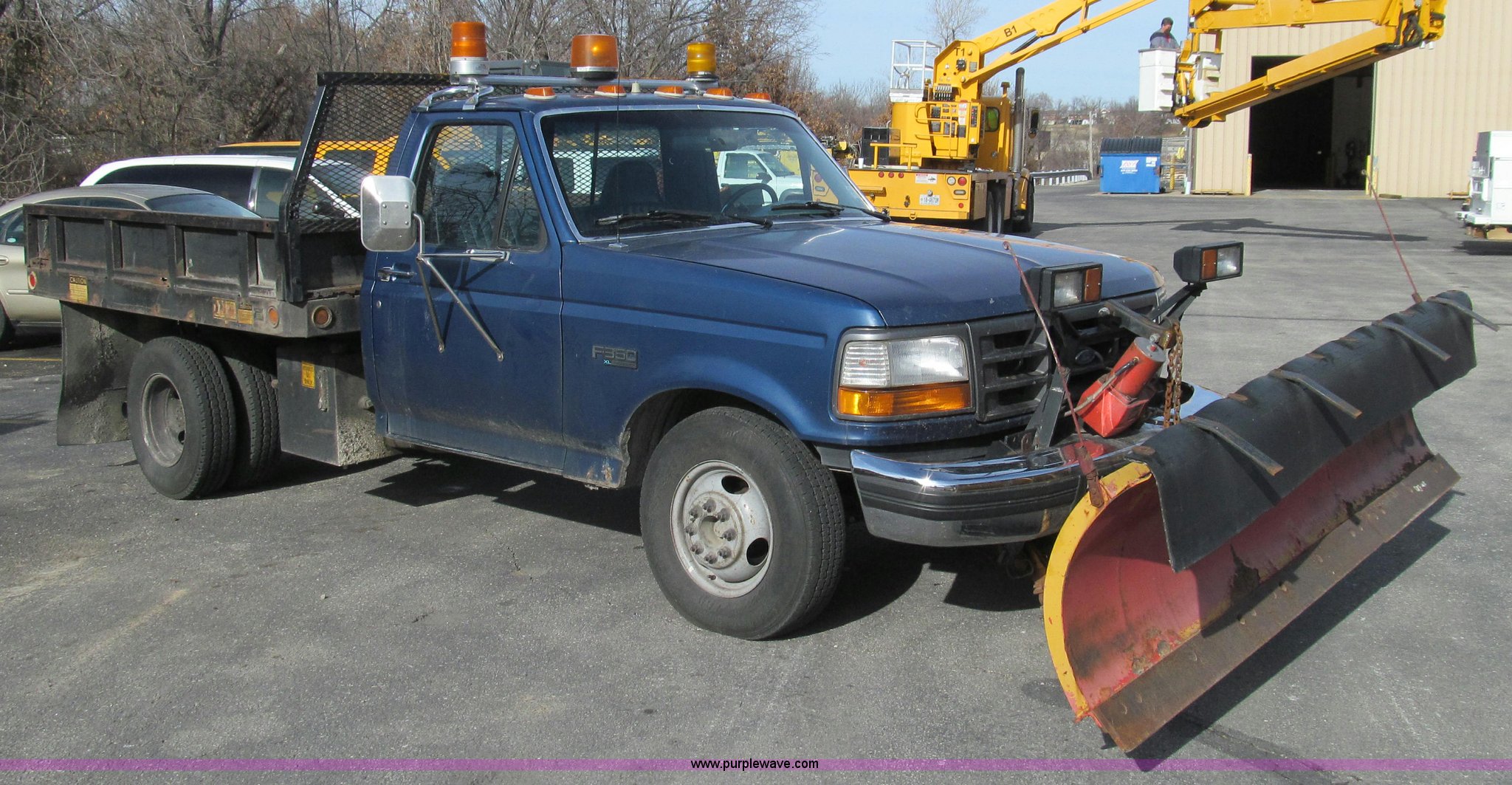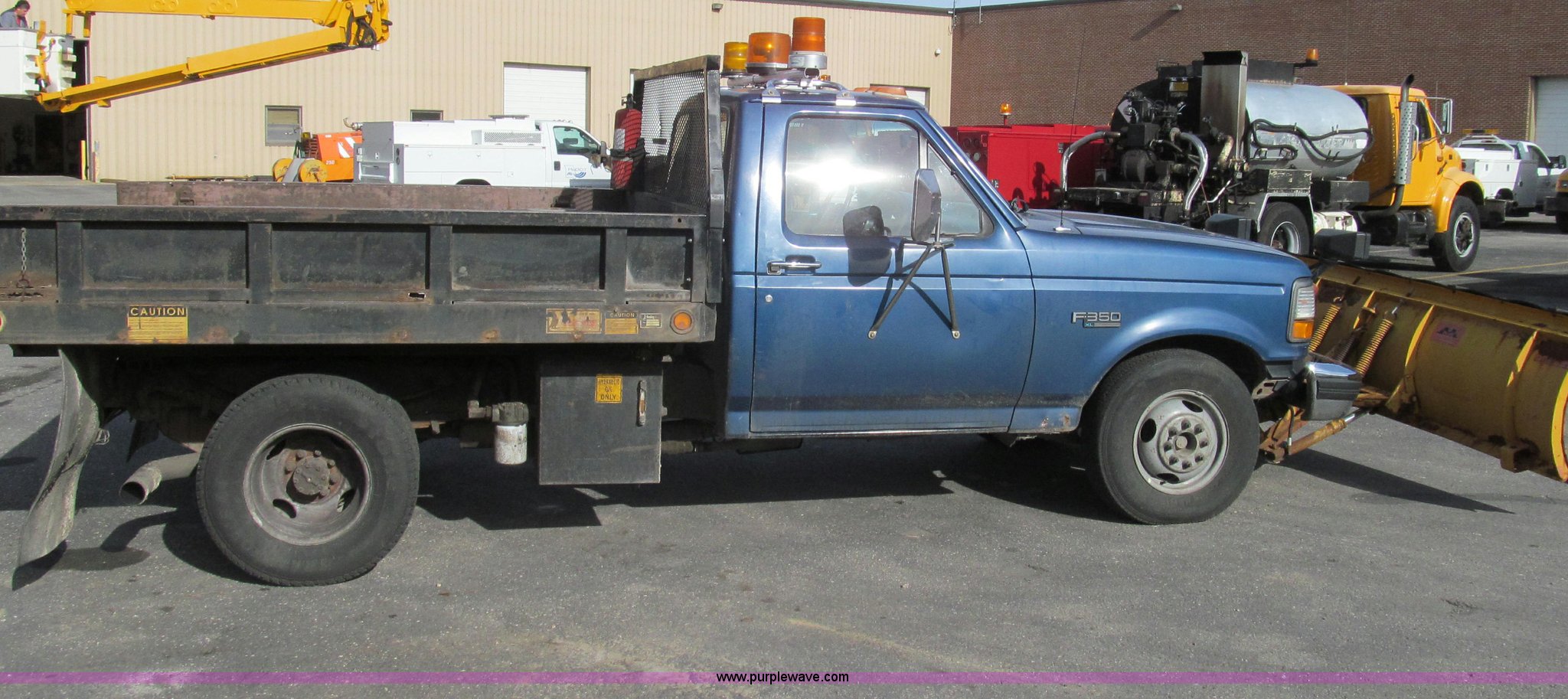 Purple Wave is selling a used Passenger Vehicle in Missouri. This item is a 1995 Ford F350 XL flatbed truck with the following: 191,468 miles on odometer, 7.3L V8 OHV 16V turbo diesel engine, Automatic transmission, AC and heat, AM/FM, Manual windows and locks, Vinyl interior, Reading 8' flat bed with hoist, Rear hydraulic outlets, Western 9' front mounted snow plow, Raise and lower inoperable, Sliding rear window, LT215/85R16 tires, Exterior cosmetic damage, Front fenders are rusted, Chip in windshield, Unit# 5434