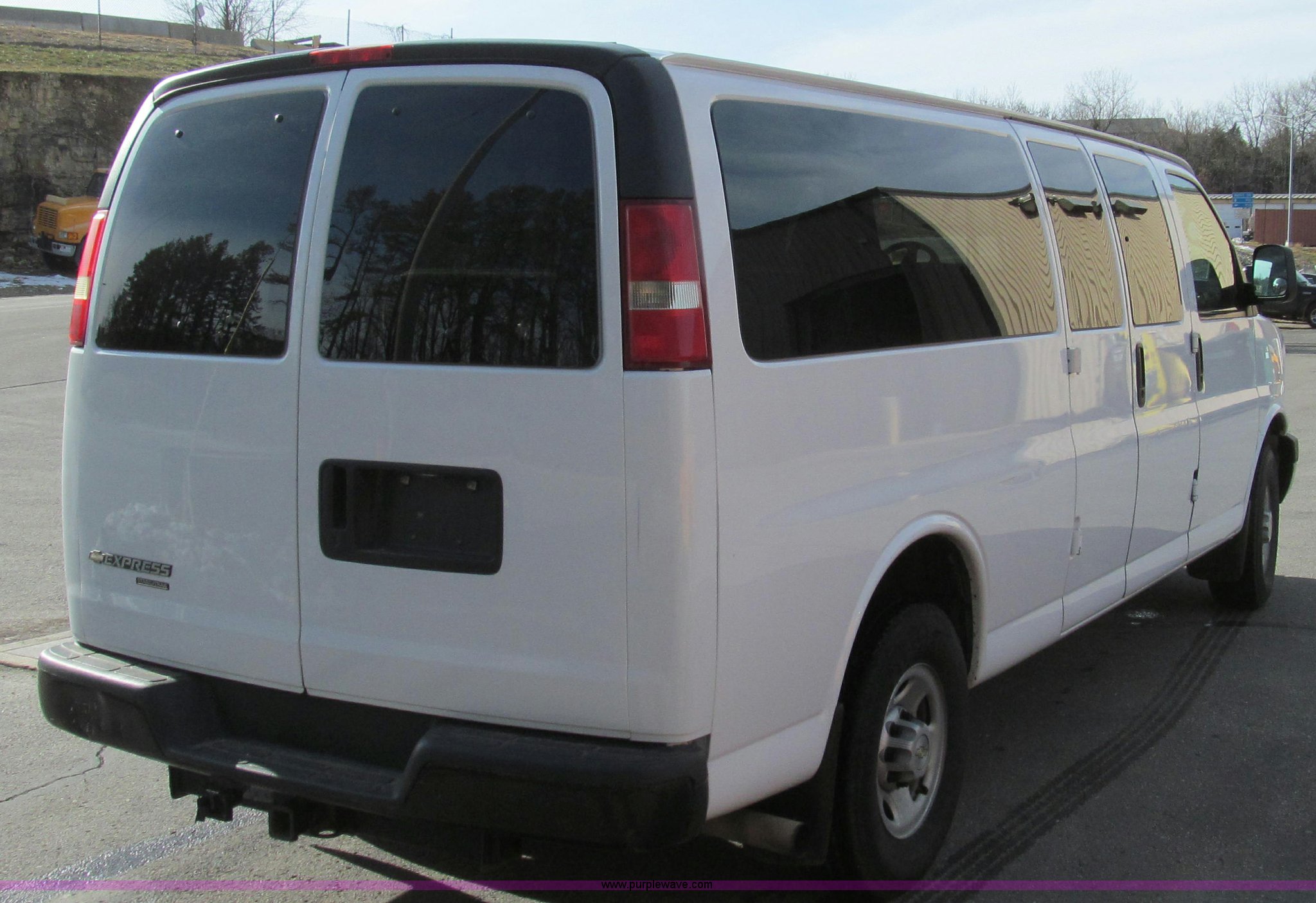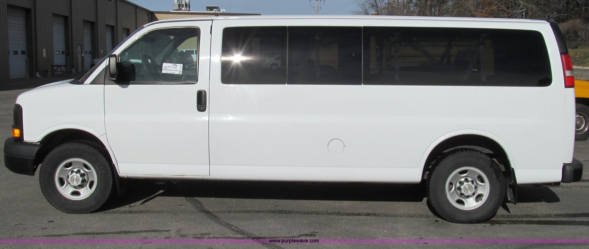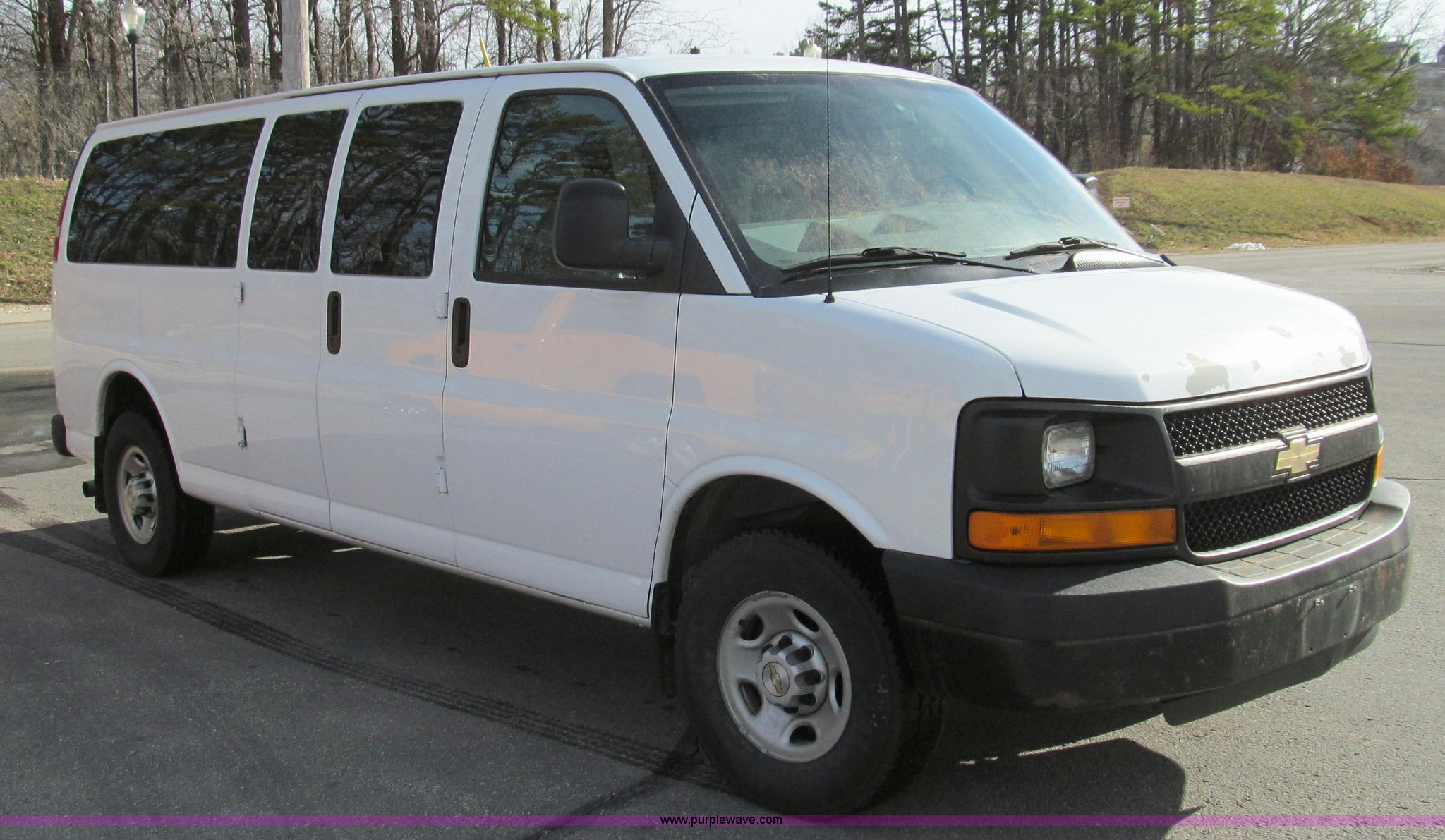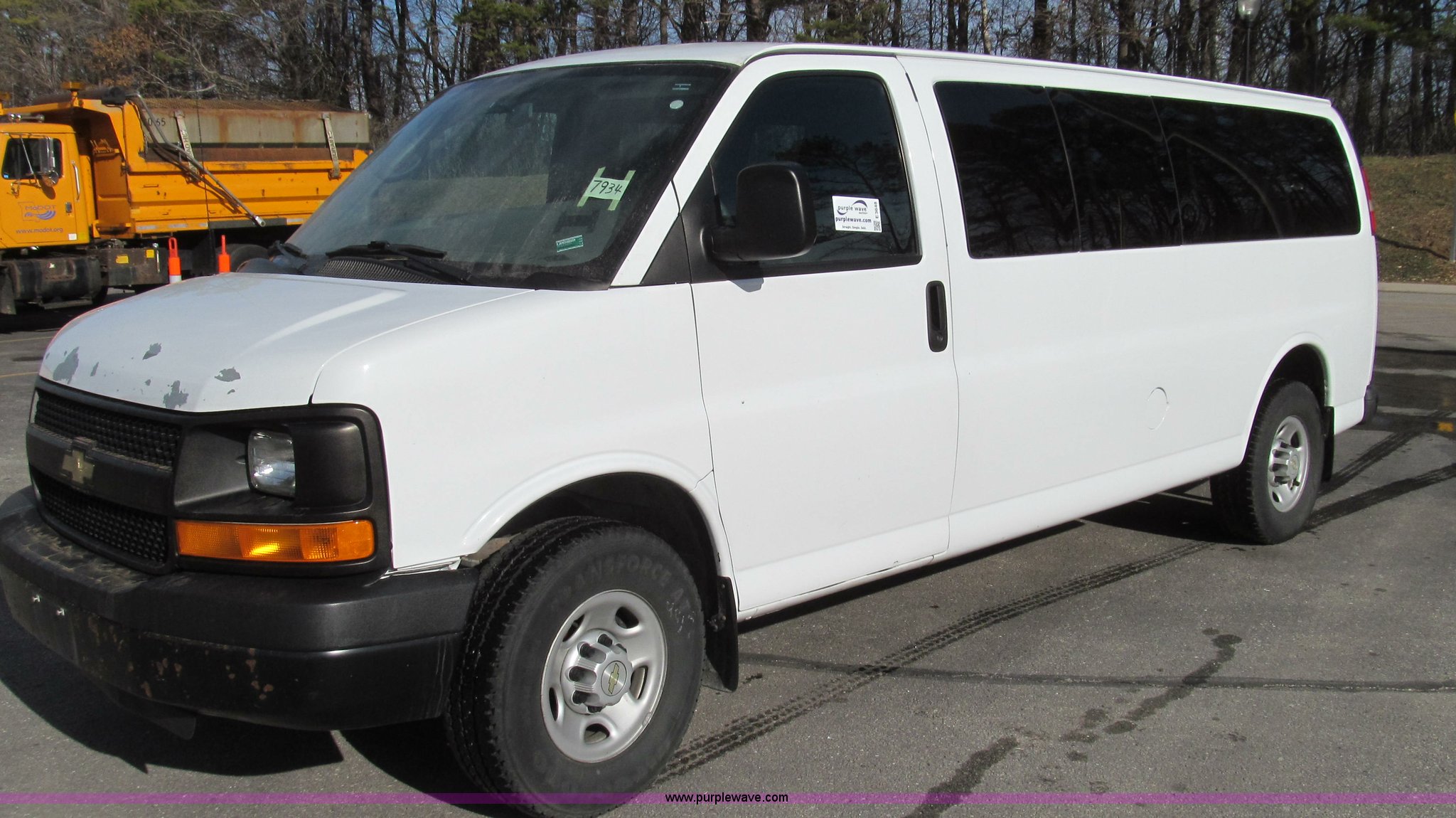 Purple Wave is selling a used Passenger Vehicle in Missouri. This item is a 2007 Chevrolet Express G3500 van with the following: 164,946 miles on odometer, 6.0L V8 OHV 16V gas engine, Automatic transmission, AC and heat, Tilt, Cruise, AM/FM, Power windows and locks, Vinyl interior, Brake controller, Receiver hitch, Trailer wiring, LT245/75R16 tires, GVWR 9,600 lbs, Paint peeling on hood, Exterior cosmetic damage, Third row seat is missing, Front and rear bumper damage, Rear heat unhooked, Unit# 7934