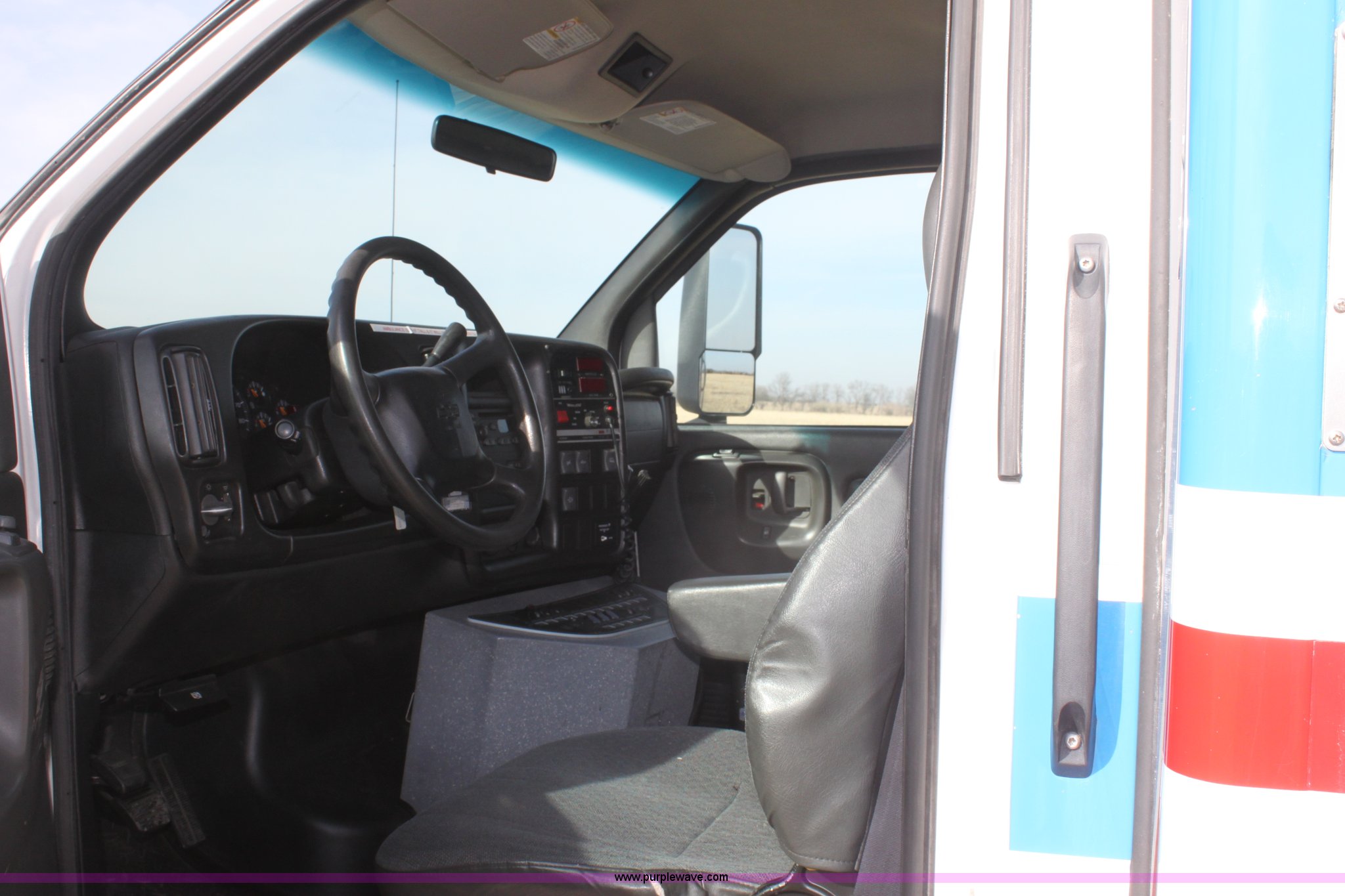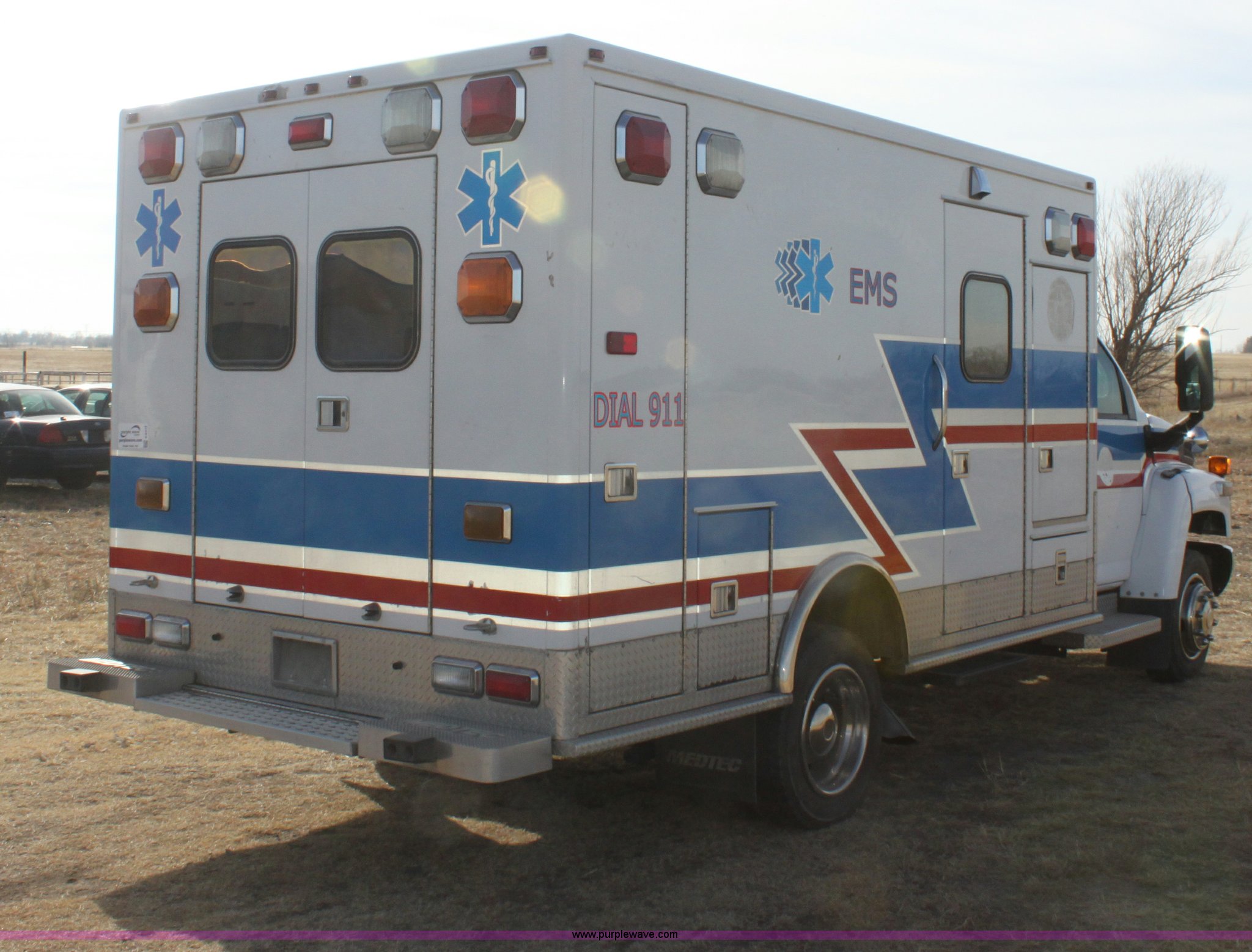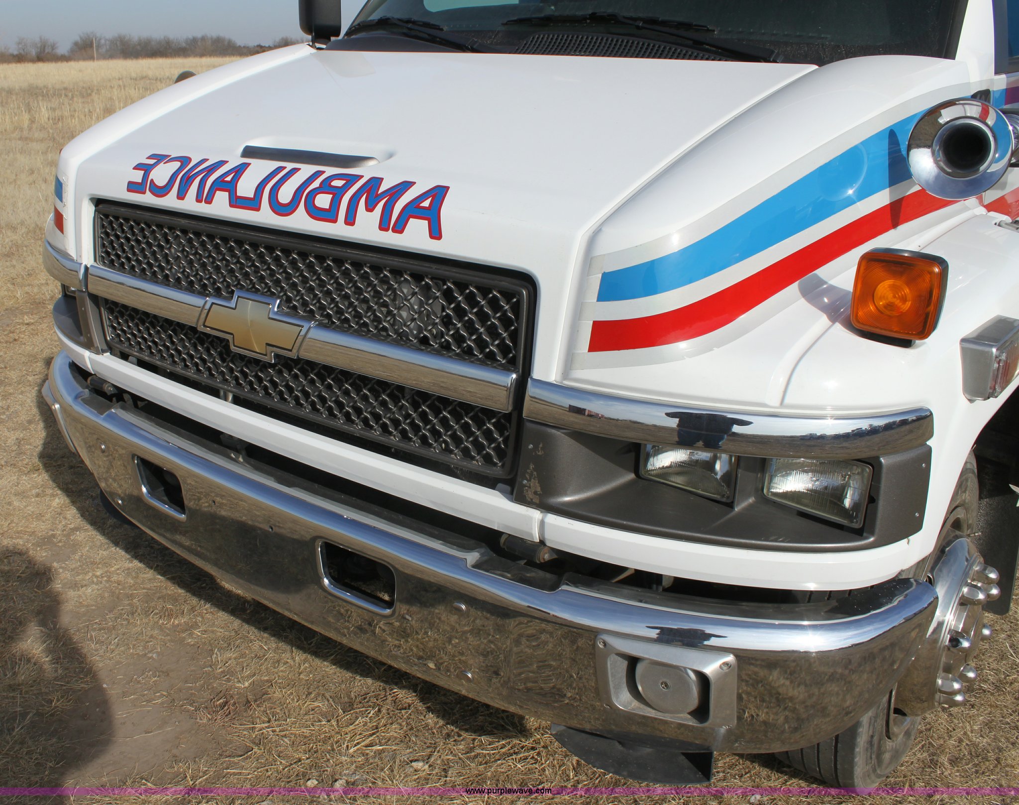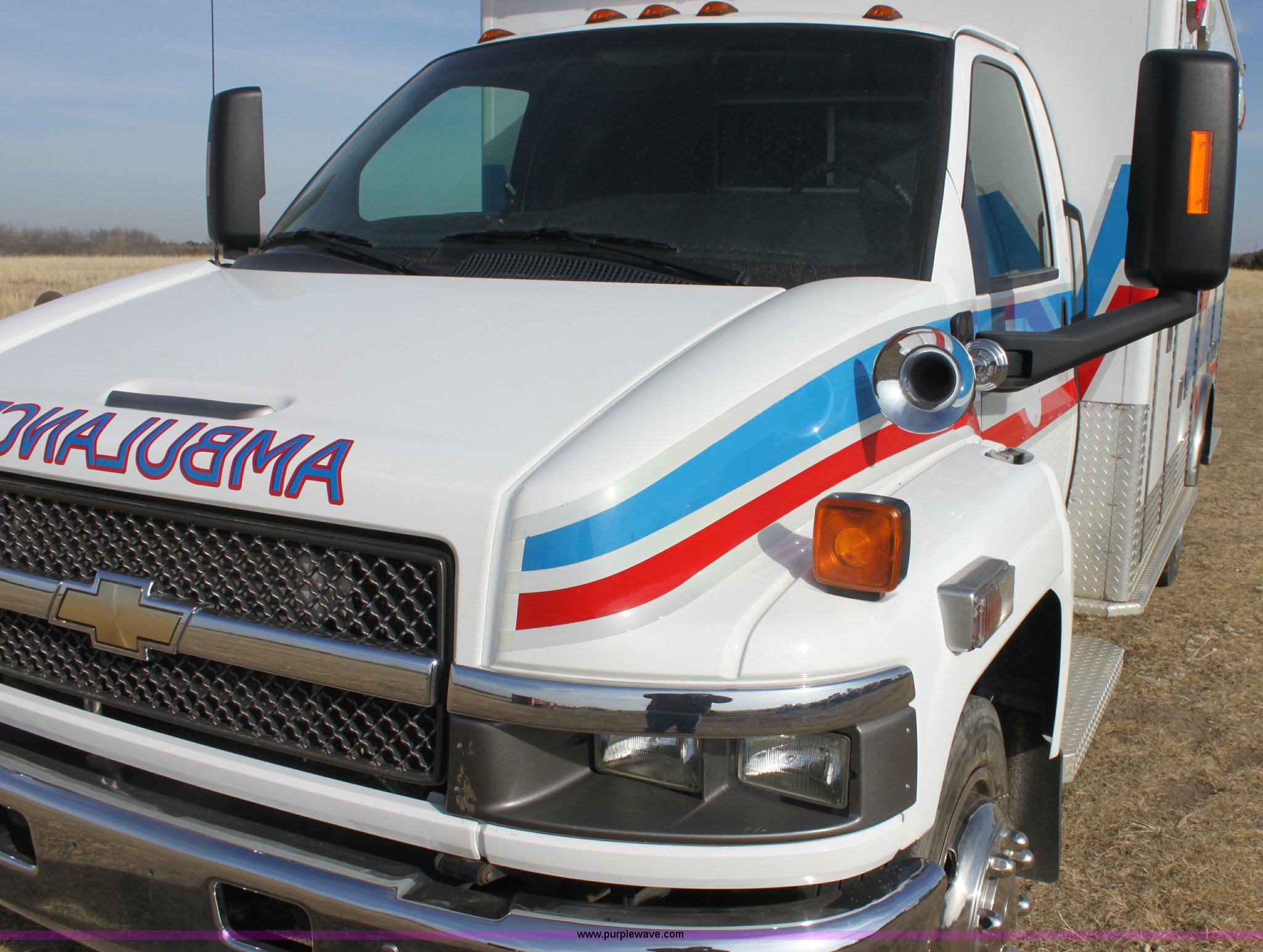 Purple Wave is selling a used Fire Truck or Emergency Vehicle in Kansas. This item is a 2008 Chevrolet ambulance with the following: 135,834 miles on odometer, Duramax 6.6L V8 OHV 32V turbo diesel engine, Allison automatic transmission, Power windows and locks, Mec Tec body, Air ride seat, Air ride suspension, 225/70R19.5 tires, Interior/exterior cosmetic damage, Needs batteries