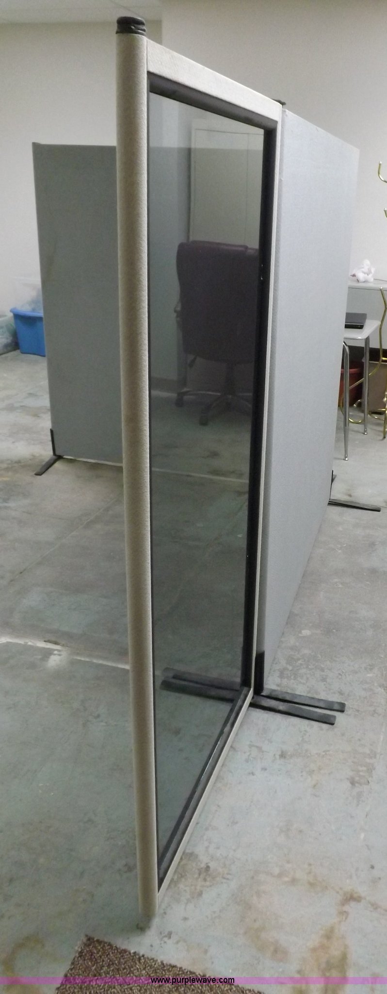 Purple Wave is selling a used Office Supplies and Equip. in Kansas. This item is a Office partition system with the following: (4) fabric covered panels, 62"W x 64"H, (4) smoked glass panels, 31"W x 64"H, (6) bases, Fabric is stained