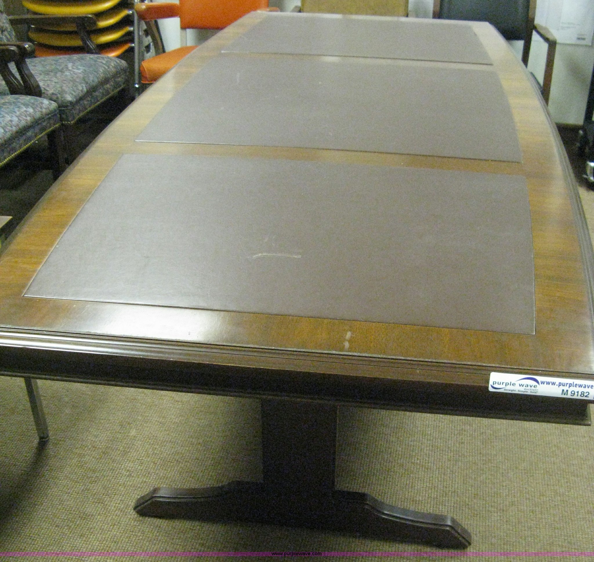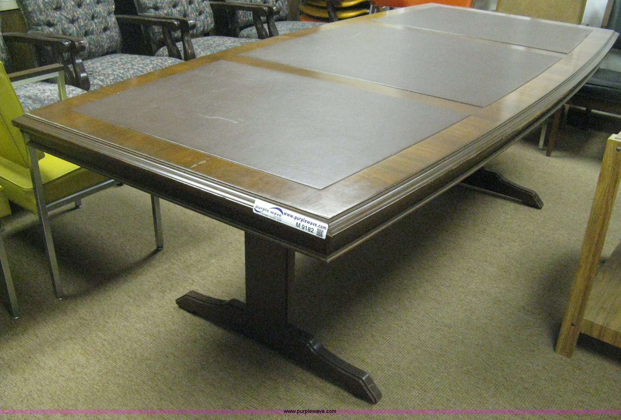 Purple Wave is selling a used Office Supplies and Equip. in Kansas. This item is a Wood with leather in-laid top conference table with the following: 92"L, 36.5"W at ends, 42.5"W at center