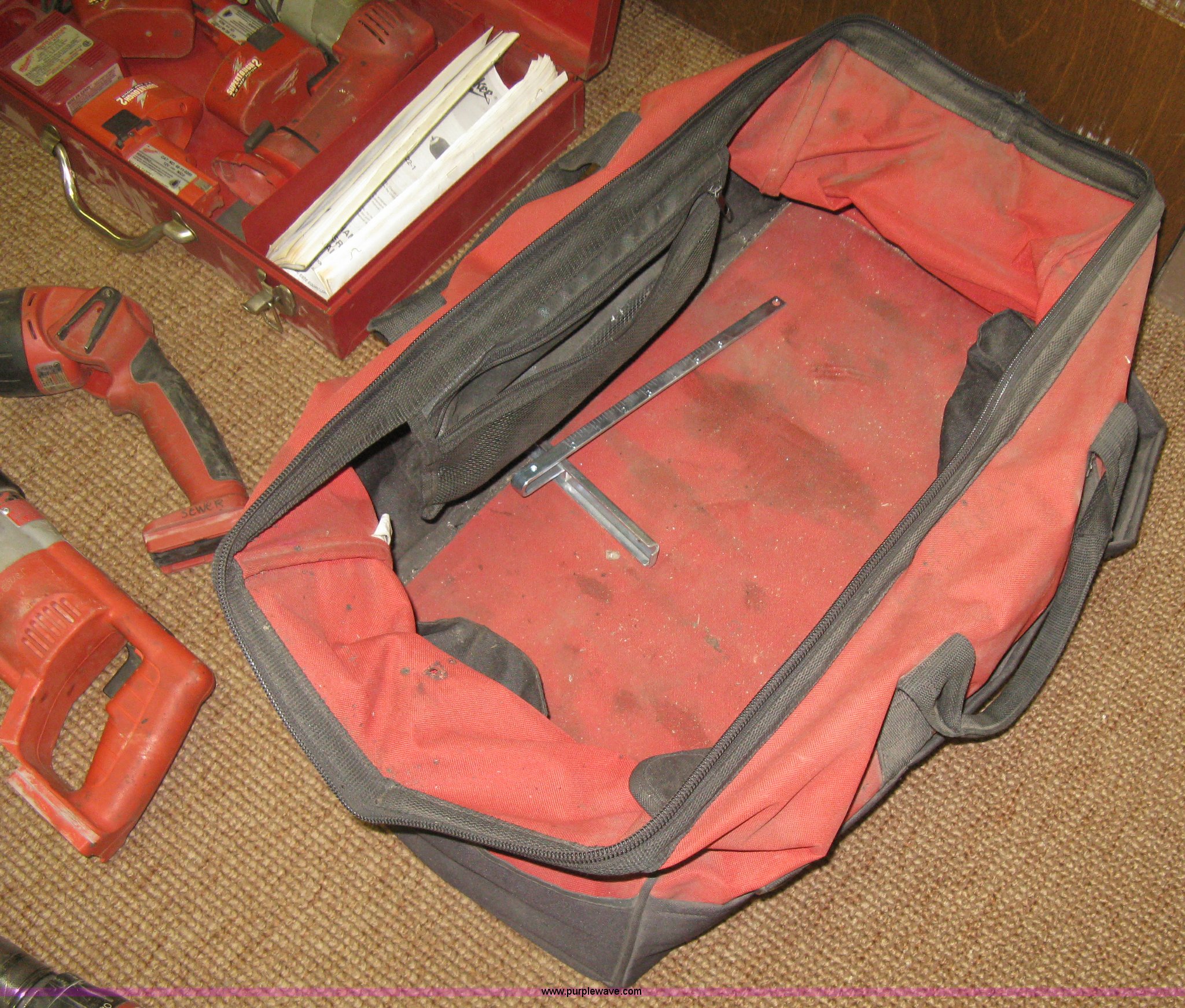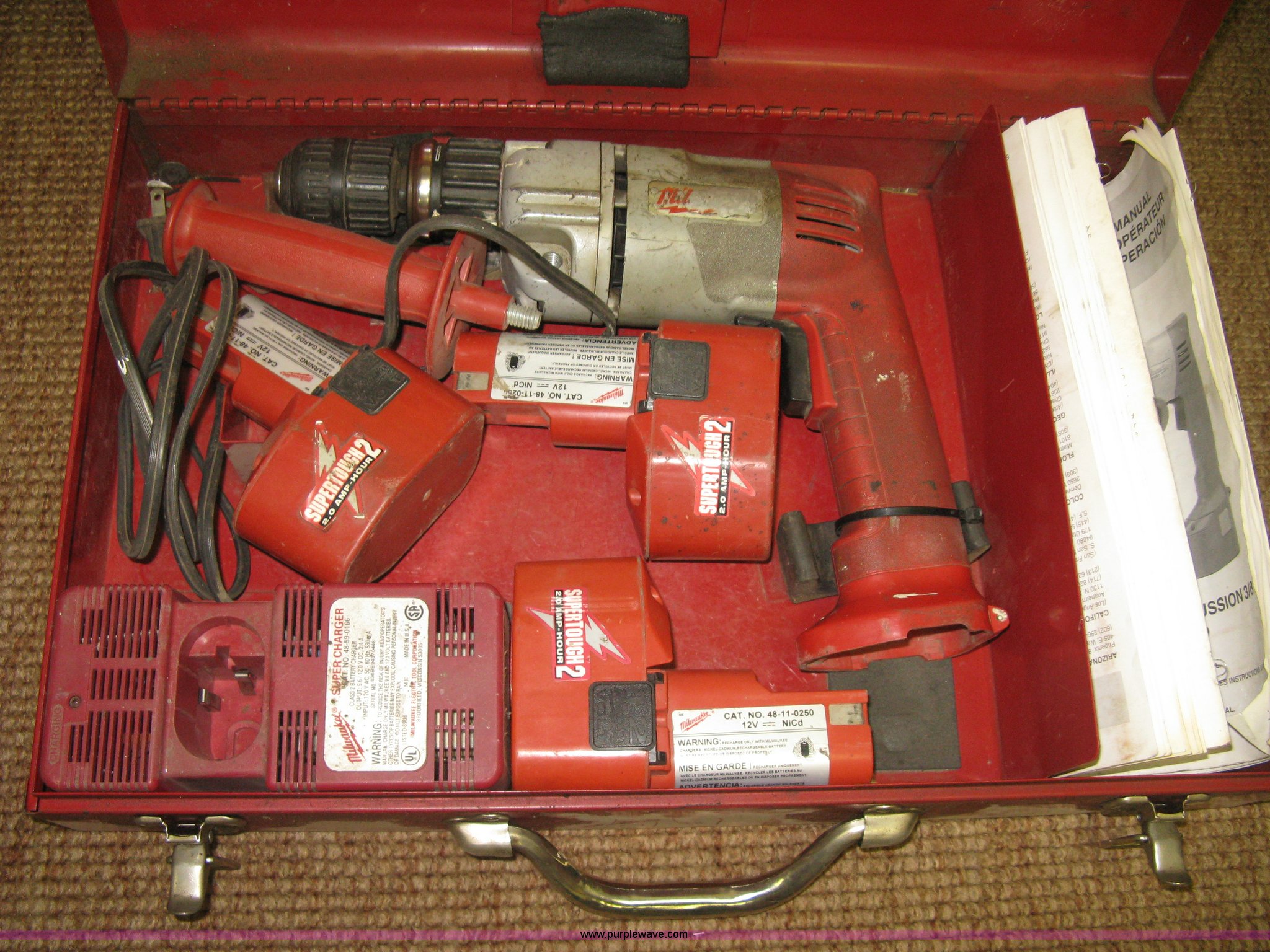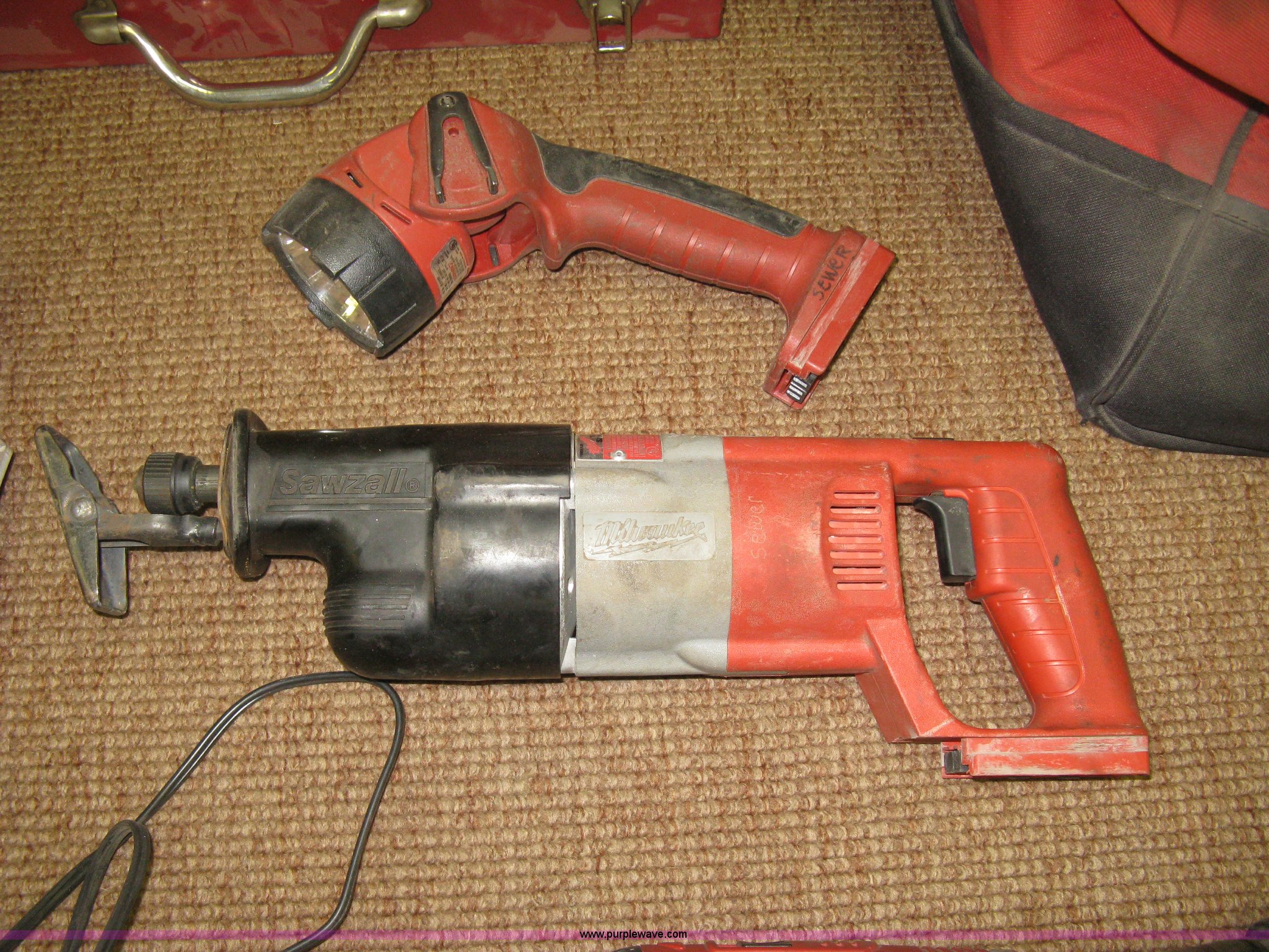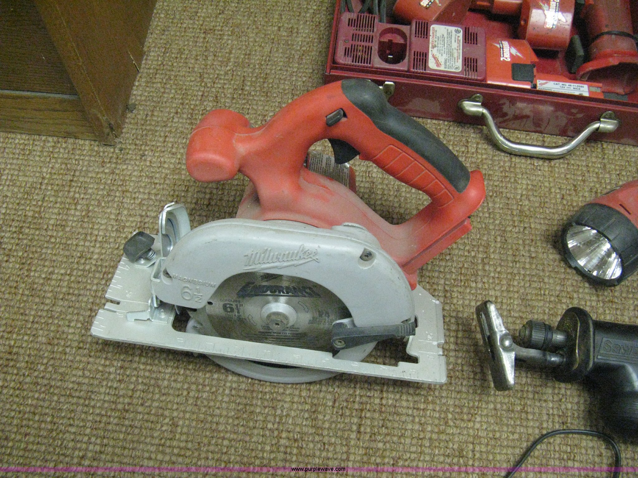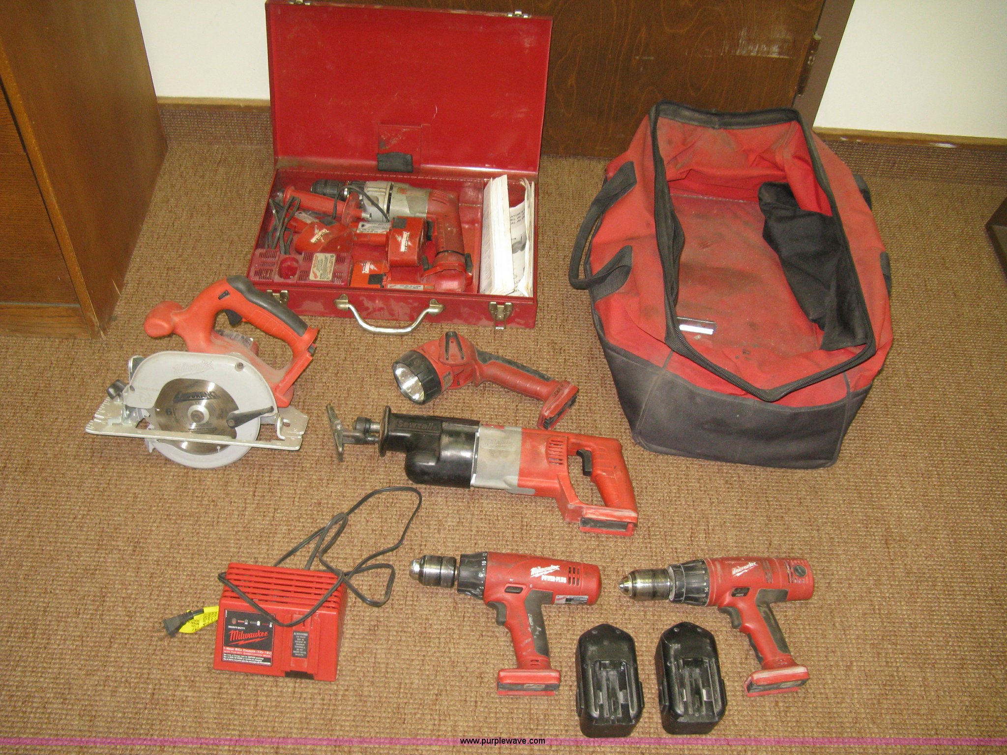 Purple Wave is selling a used Tools in Kansas. This item is a Milwaukee cordless power tools with the following: Heavy dury 3/8" hammer drill, (3) batteries, Charging station, Steel carrying case, Manual, (2) 1/2" drills, 6.5" circular saw, No battery, Sawzall, No battery, Flashlight, (2) batteries, Charging station, Soft side tool bag