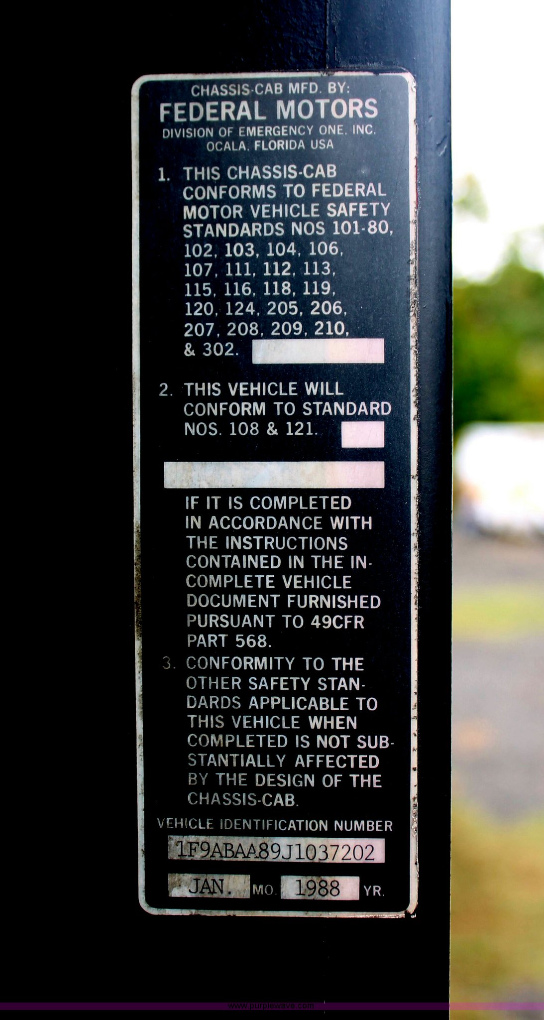 1988 Federal Motors firetruck. 127,469 miles on odometer, 5,709 engine hours on meter, 4,840 average engine hours, Detroit 6L diesel engine 320 HP, Automatic transmission, Cruise, Manual windows and locks, Vinyl interior, Fan, Spotlight, Light and siren control, Emergency One pump system 1,000 gpm capacity, (9) compartment fire bed, Hose and reel, Michelin XZE 11R22.5 tires, No flood damage. Listen to the seller's story. Seller is a New Jersey licensed motor vehicle dealer. Title will be assigned and distributed by the dealer. Please contact the seller for distribution questions. 1F9ABAA89J1037202. Shipping quotes available. SKS Sales and Leasing. 3609 Route 9. Bayville, NJ 08721