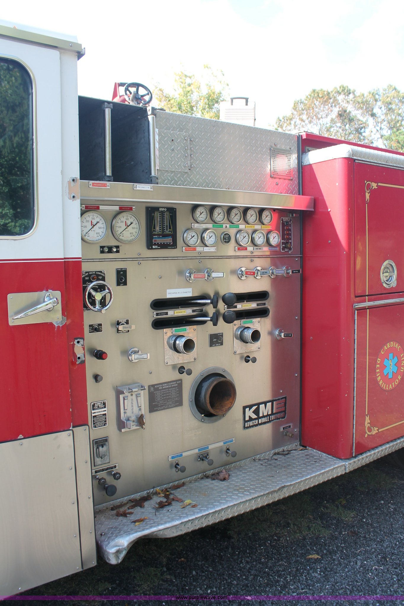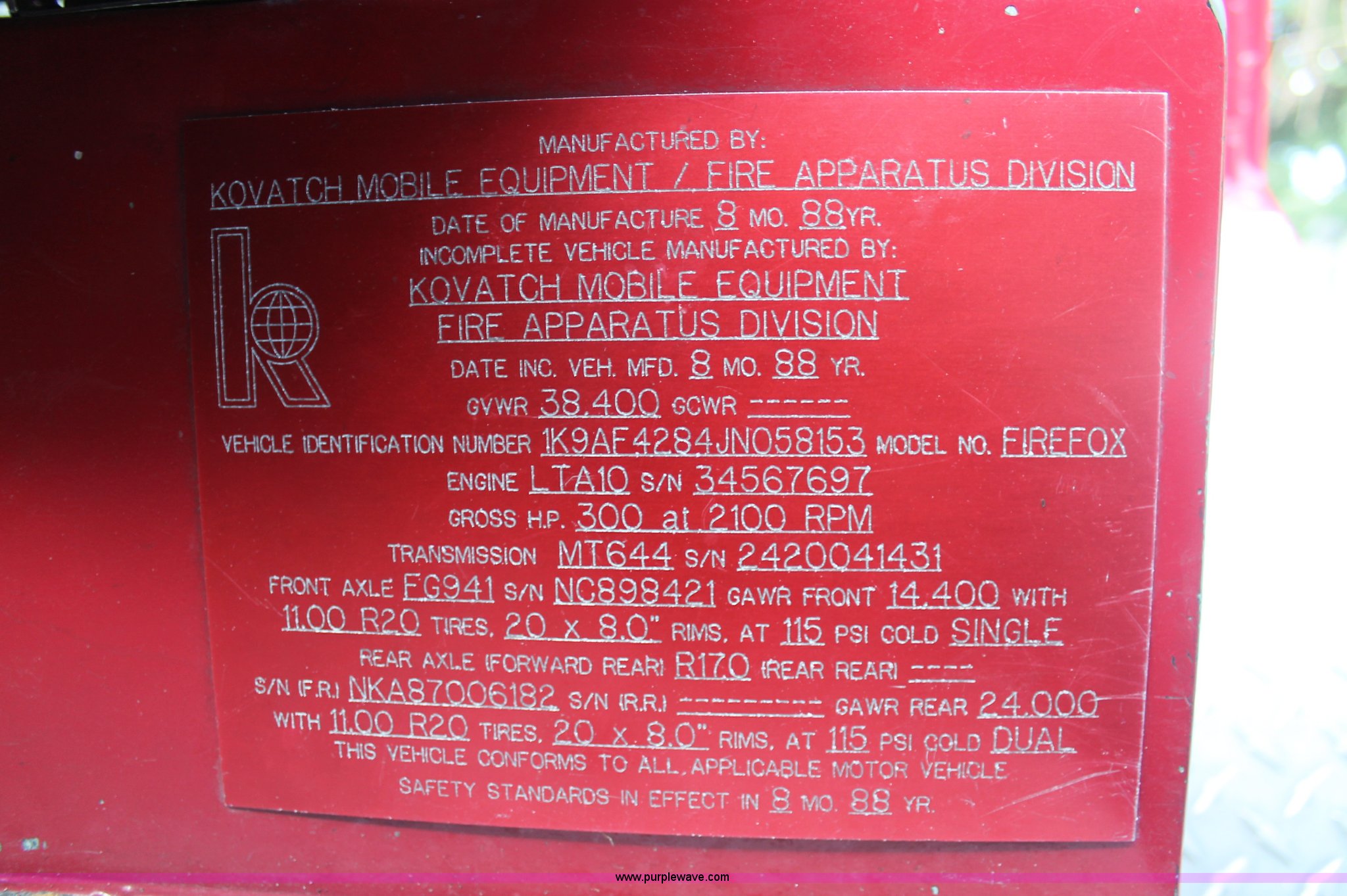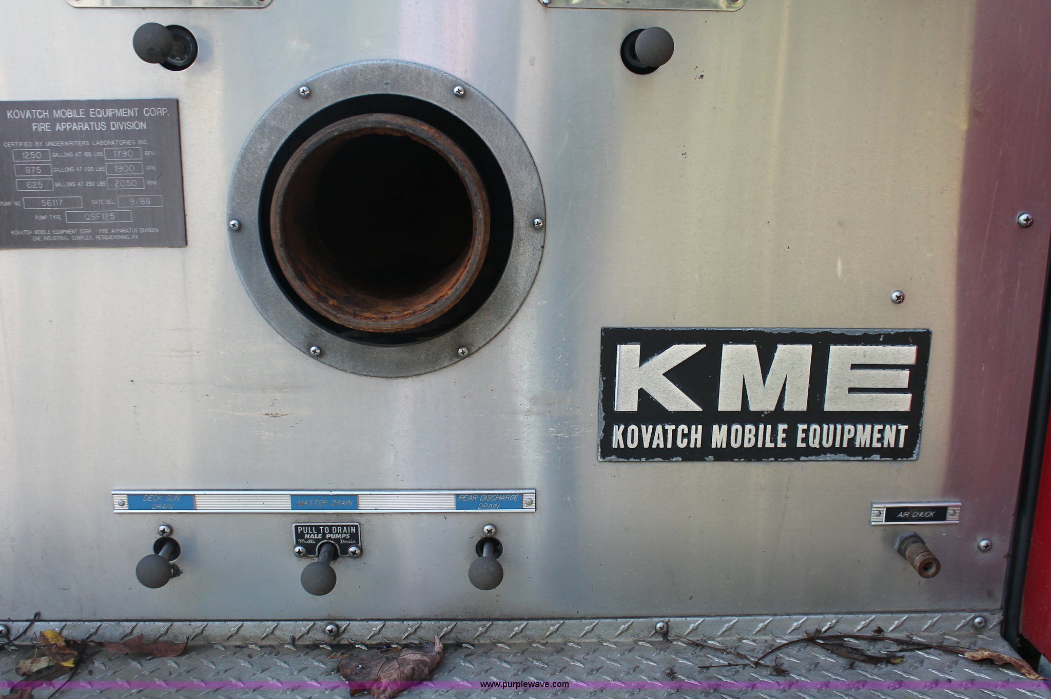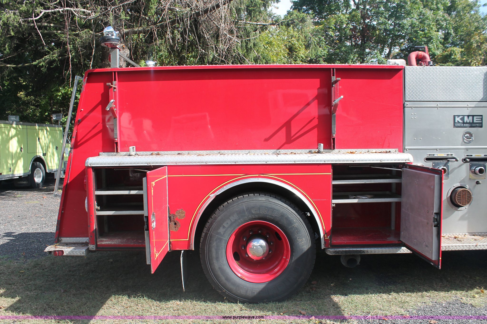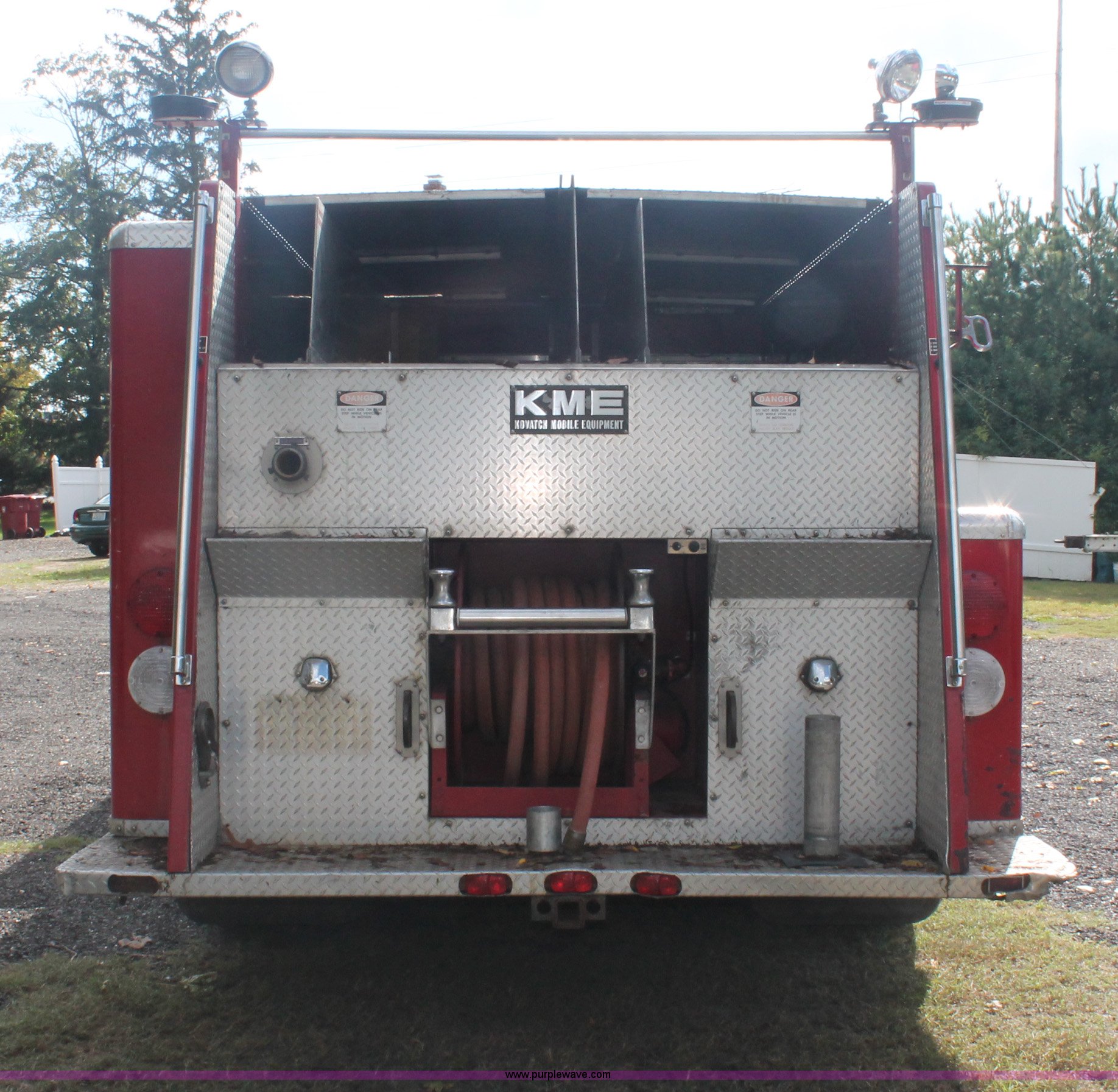 Purple Wave is selling a used Fire Truck or Emergency Vehicle in New Jersey. This item is a 1988 KME firetruck with the following: 71,385 miles on odometer, Cummins diesel engine, Automatic transmission, Manual windows and locks, Fans, Kovatch fire apparatus pump system, Six compartment fire bed, Hose and reel, Tow hooks, Receiver hitch, Air brakes, 12R22.5 tires, No flood damage