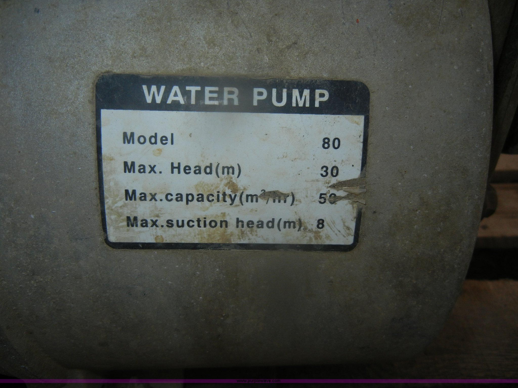 Purple Wave is selling a used Pump in Kansas. This item is a Gentec water pump with the following: OHV 6 HP engine, Needs tune-up, Model 80, 8m max suction, 50 m/m max capacity