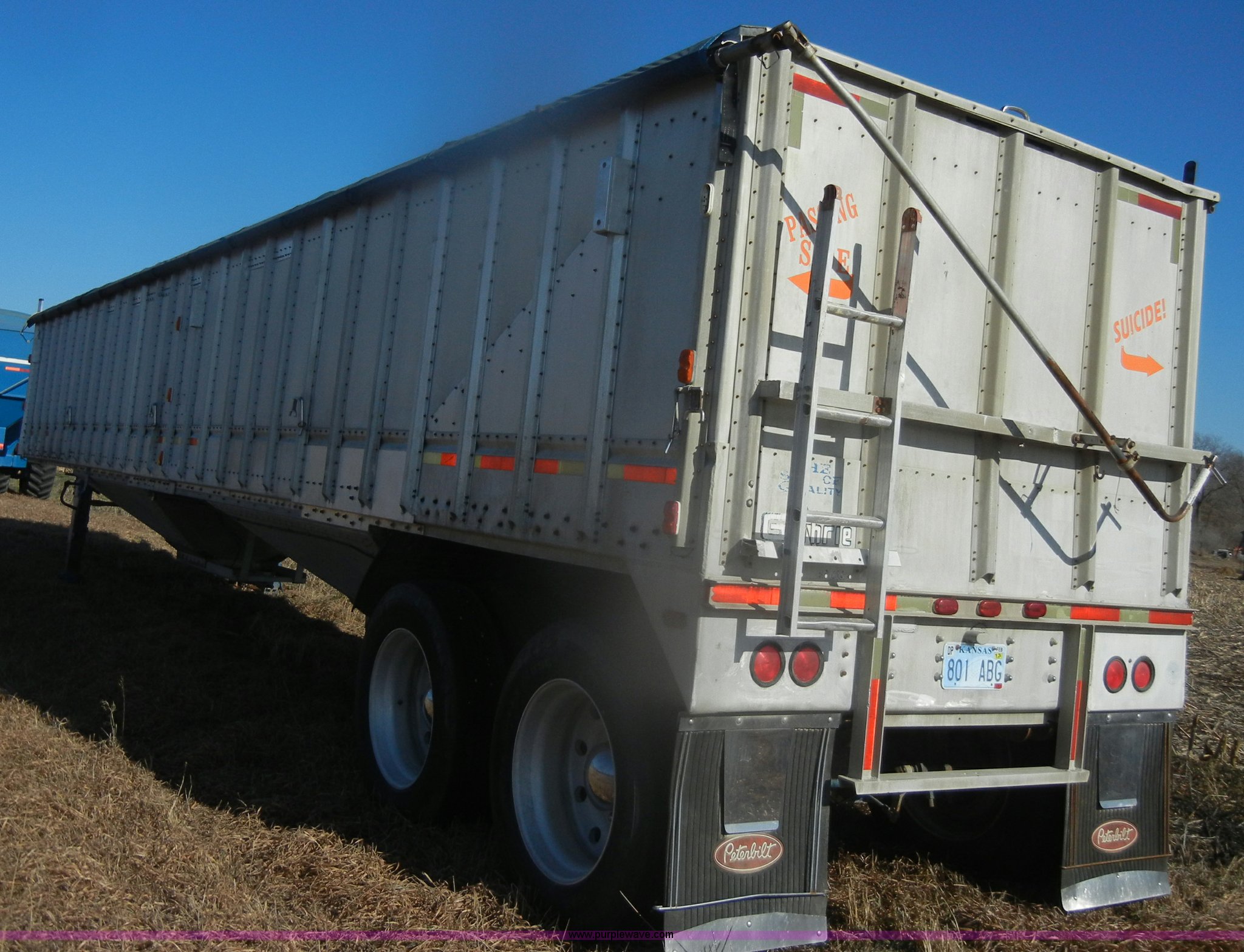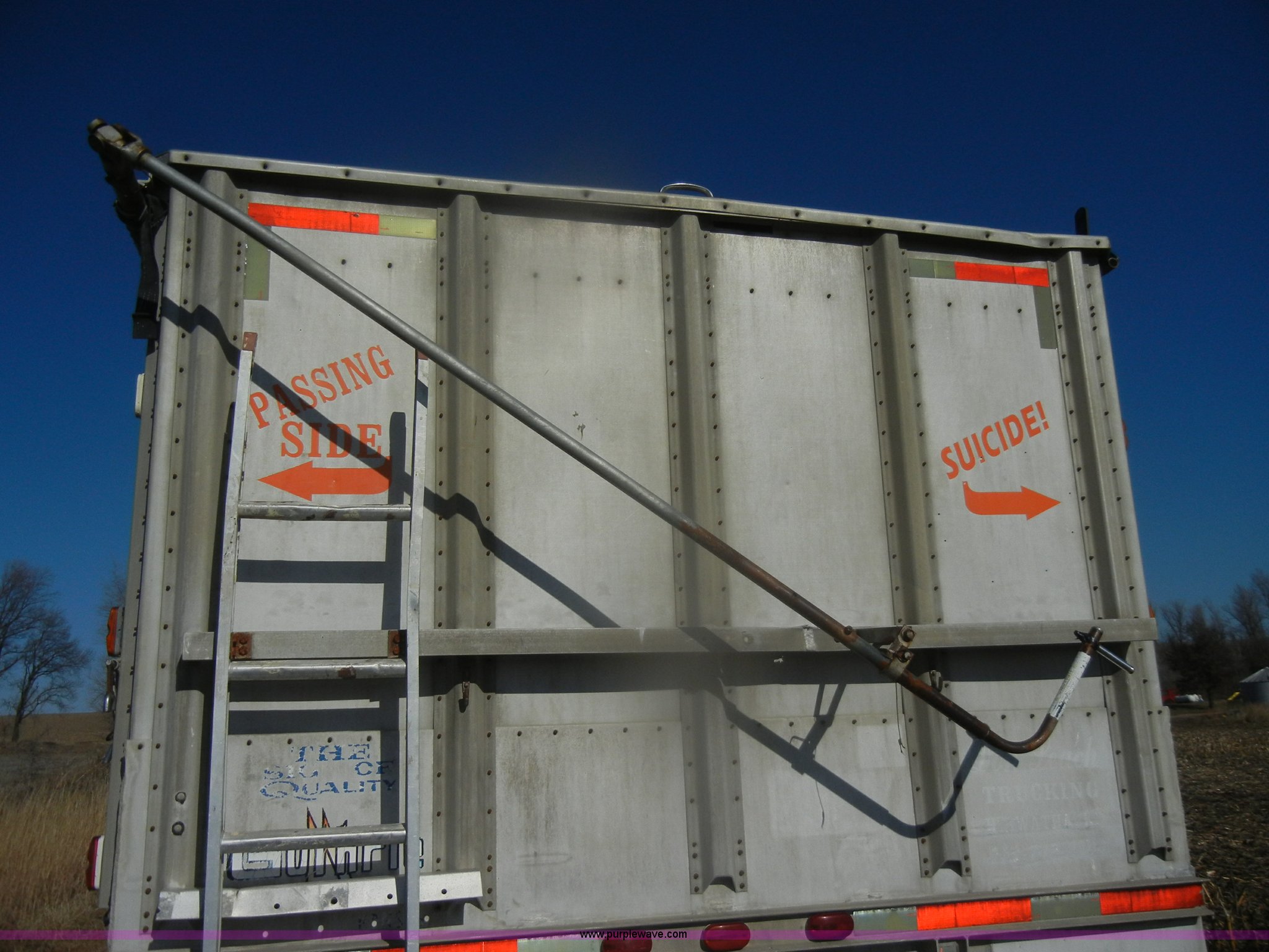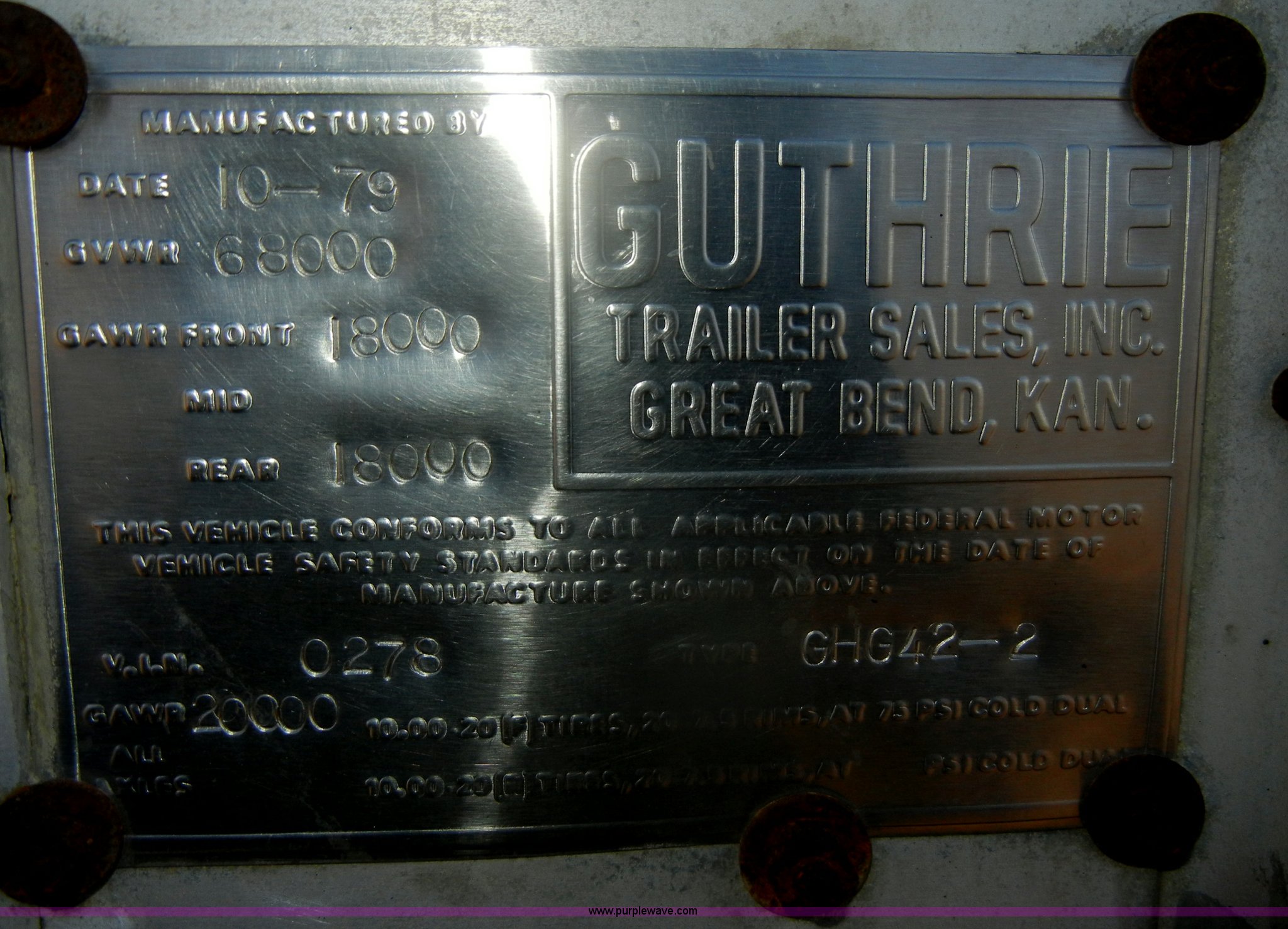Purple Wave is selling a used Grain or Commodity Trailer in Kansas. This item is a 1980 Guthrie double hopper grain trailer with the following: Type GHG42-2, Aluminum construction, Manual rollover tarp, Needs replaced, damaged, Air operated, Spring suspension, Air brakes, Aluminum outer wheels, Steel inner wheels, 285/75R24.5 tires, GVWR 68,000 lbs, GAWR 18,000 lbs, Undercarriage replaced six to seven years ago