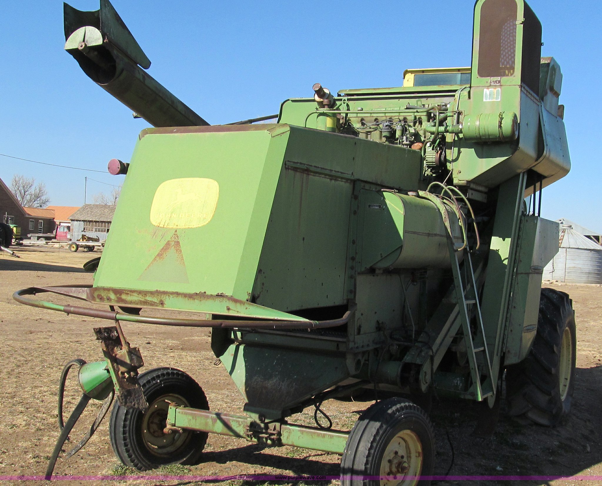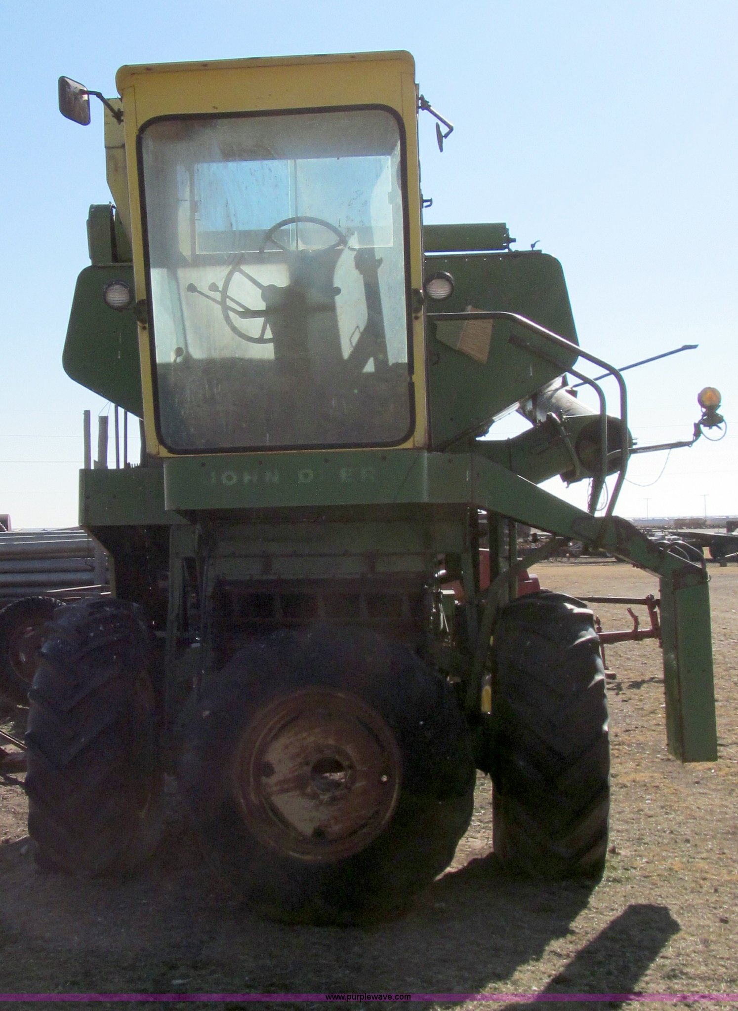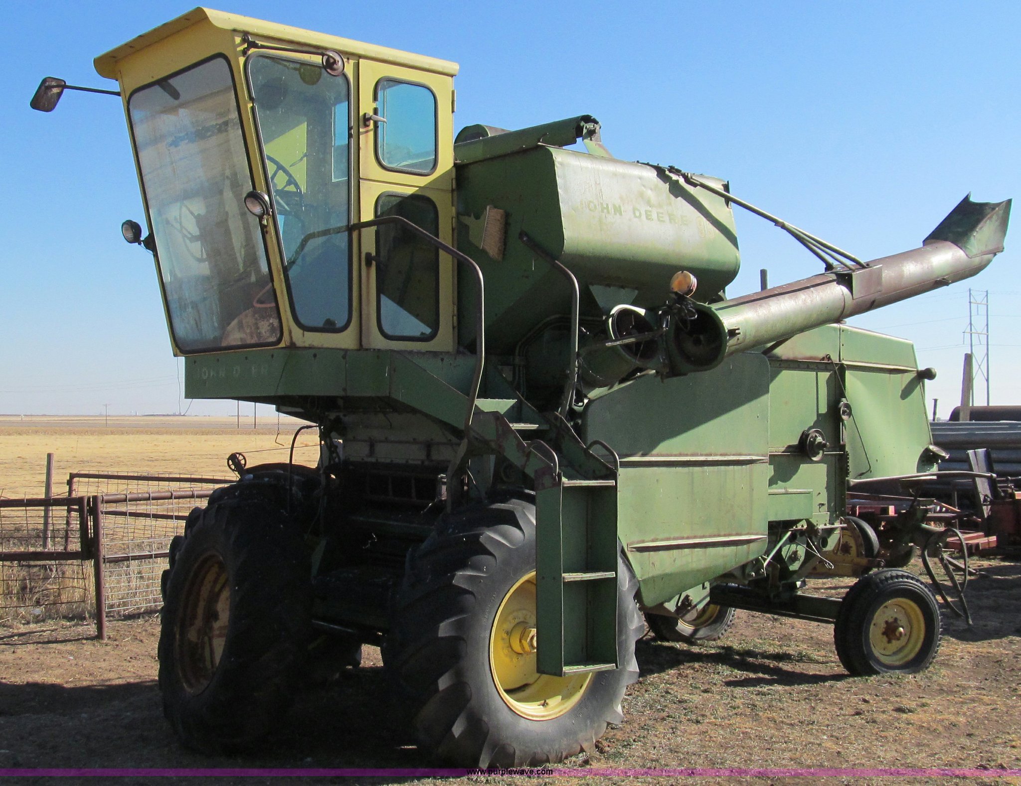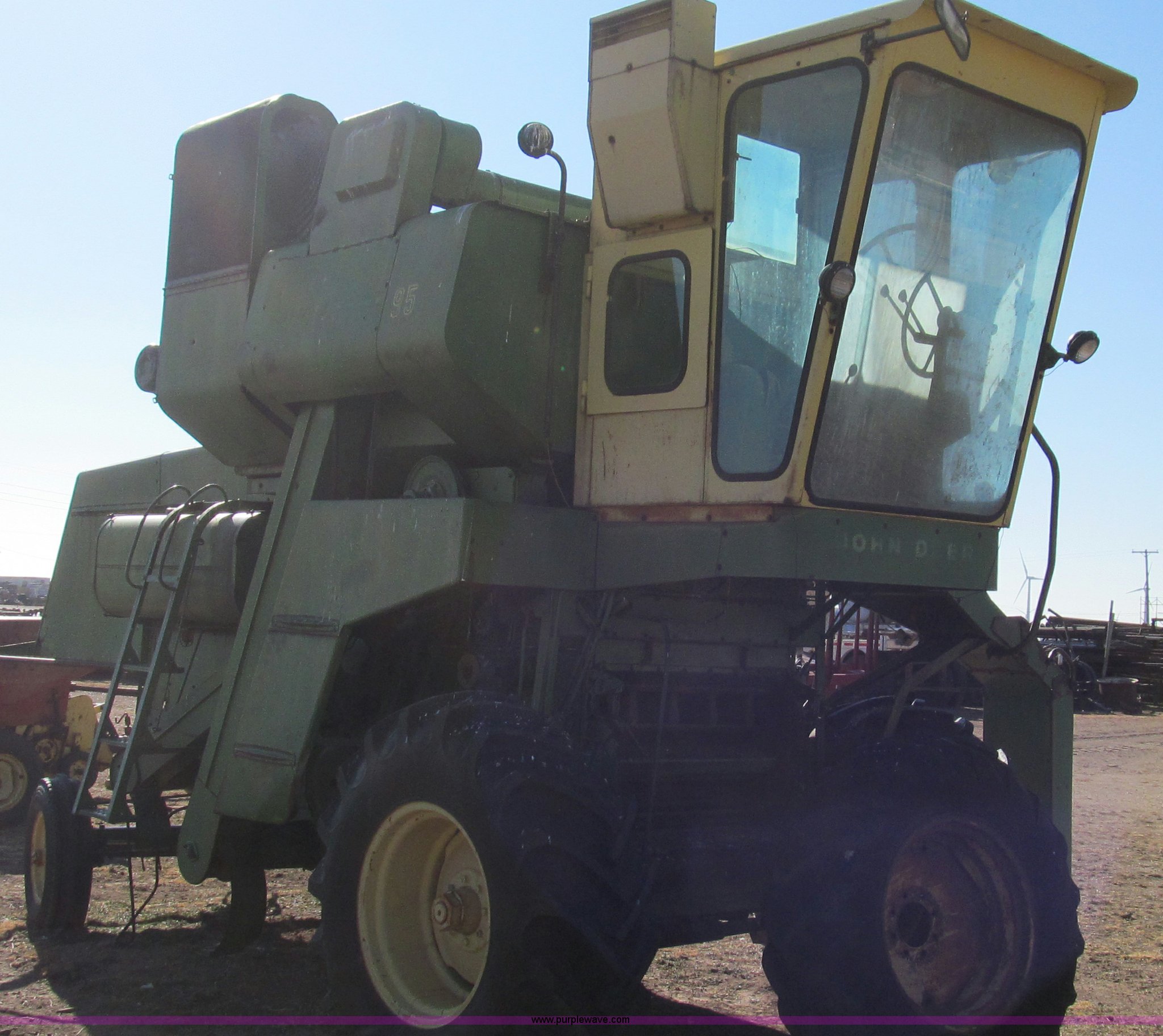 Purple Wave is selling a used Combine in Texas. This item is a John Deere 95 combine with the following: Six cylinder gas engine, 18.4 x 26 drive tires, Serial 36414