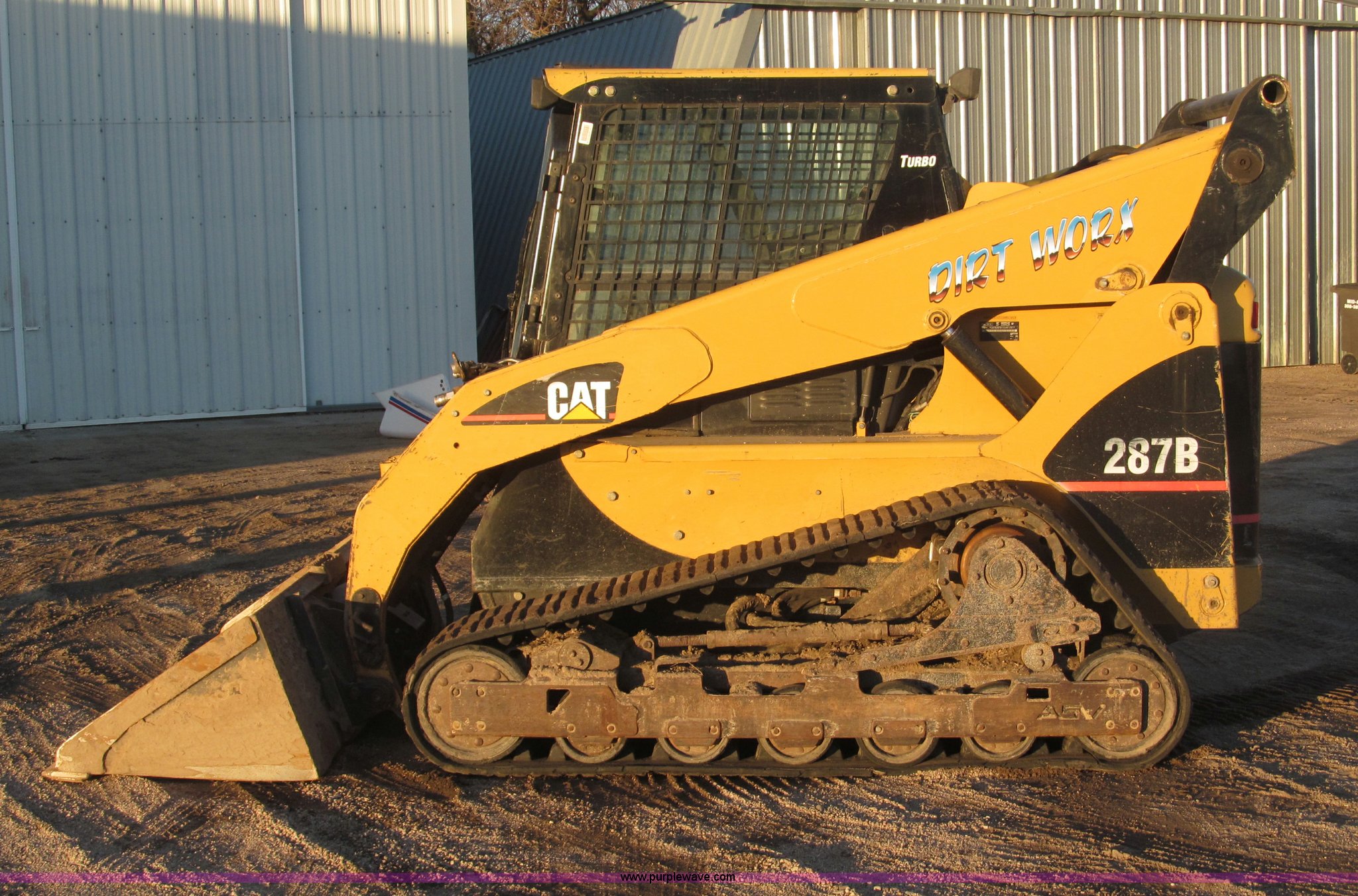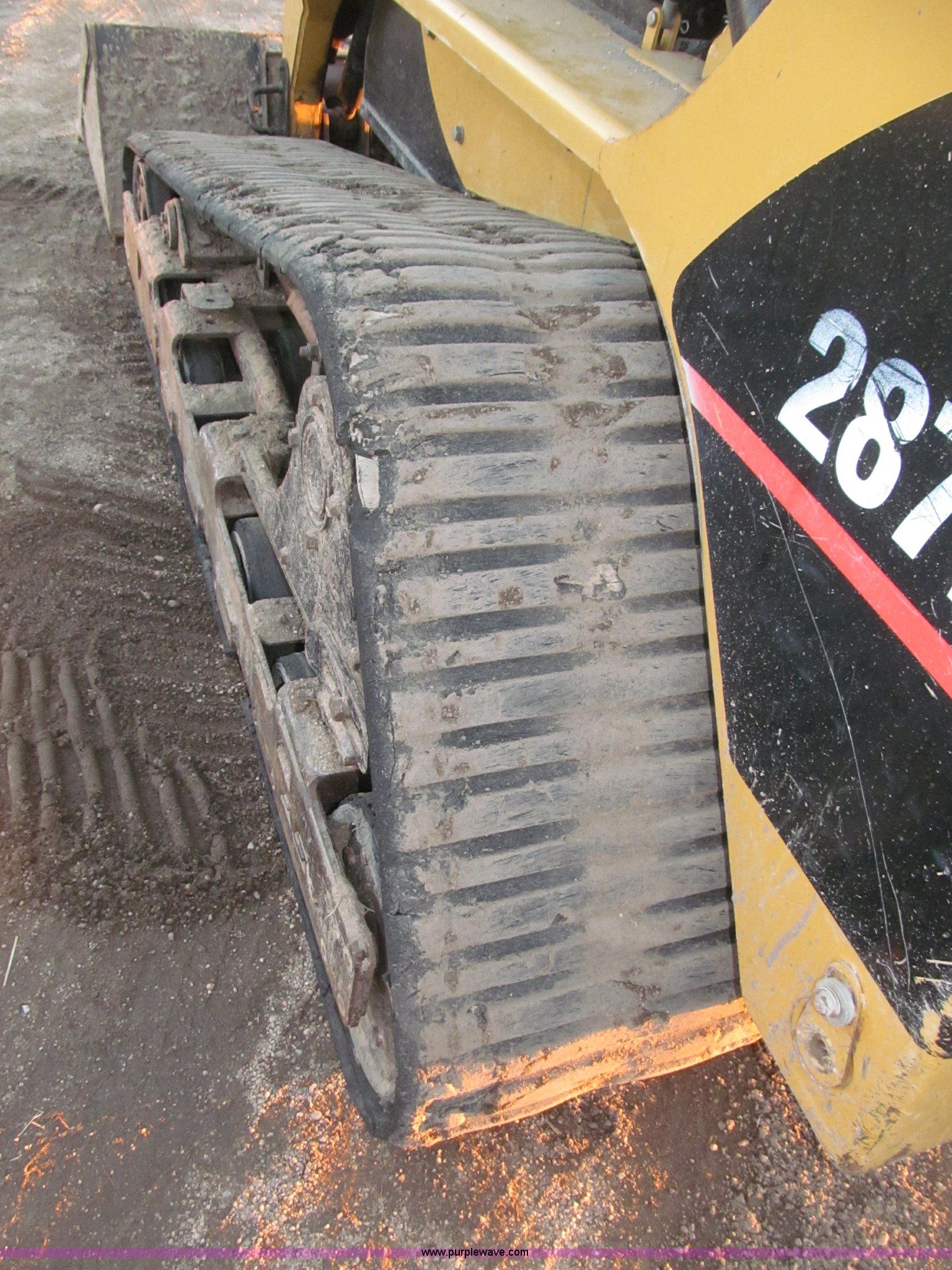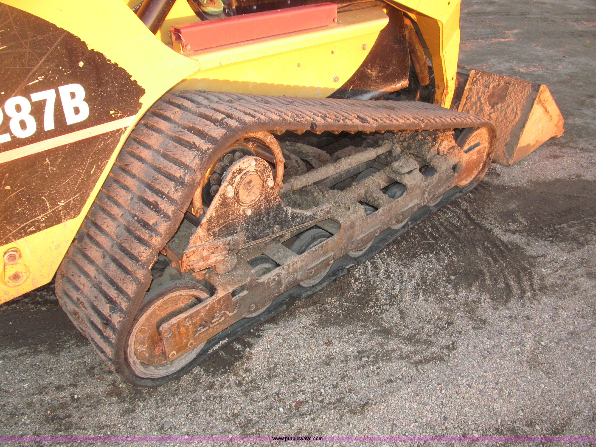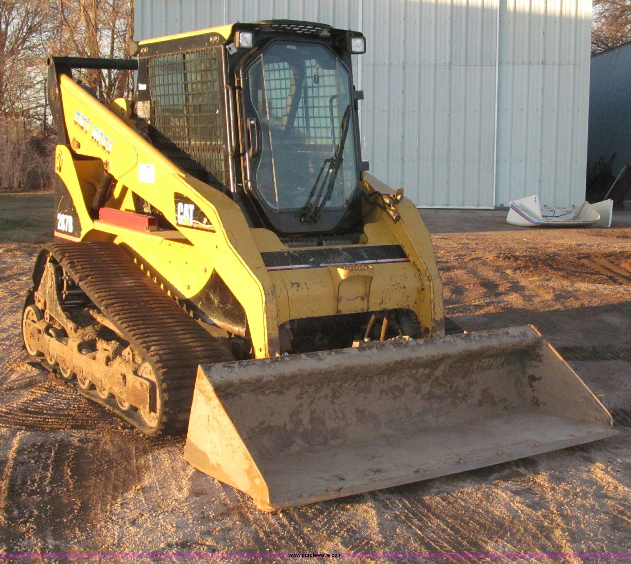 Purple Wave is selling a used Tracked Skid Steer Loader in Nebraska. This item is a 2005 Caterpillar 287B track skid steer with the following: 2,161 hours on meter, Mitsubishi 3044CDITT 3.3L four cylinder turbo diesel engine, 80.5 HP, Foot and hand throttle controls, Enclosed cab, AC and heat, Rear view mirror, Emergency escape rear window, Hydraulic powered quick coupler, 80"W smooth edge quick attach bucket, 3,598 lb operating load, 7,198 lb tipping load, Flat face hydraulic fittings, Glow plugs, Safety lab bar, Safety boom support bar, 29 gallon fuel capacity, Thumb control auxiliary hydraulics, 17.5"W ASV rubber tracks, 10,273 lbs. base operating weight, Eight pin auxiliary electric adapter loose, Hydraulic hose guides for attachments, Door replaced in March 2012, Replaced upper drive bearings in 2012, 12V top post battery replaced one year ago, Track drive rollers replaced Spring 2011, Tracks replaced in Spring 2011, Serial CAT0287BTZ5A01201