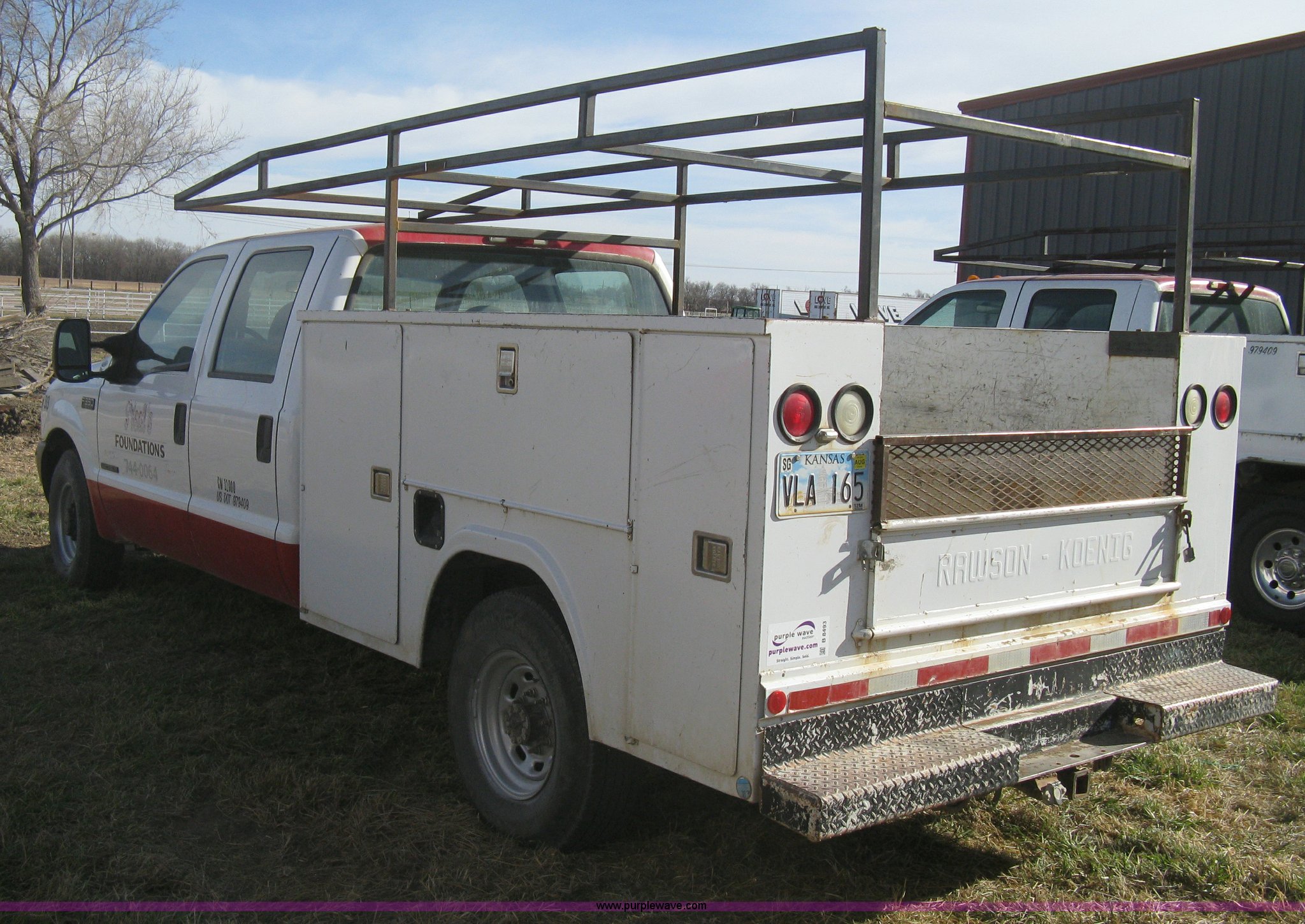 Purple Wave is selling a used Service Truck in Kansas. This item is a 2002 Ford F350 XL Super Duty Crew Cab utility truck with the following: 117,792 miles on odometer, 7.3L V8 OHV 16V diesel engine, Automatic transmission, AC and heat, Tilt, Cruise, AM/FM, Manual windows and locks, Cloth interior, Trailer brake controller, Rawson-Koenig utility bed, 8'L x 80"W, Ladder racks, Diamond plate floor, (6) tool cabinets, Diamond plate step up rear bumper, Receiver hitch, Trailer wiring, LT235/85R16 tires, 2012 annual DOT inspection, EIN 33