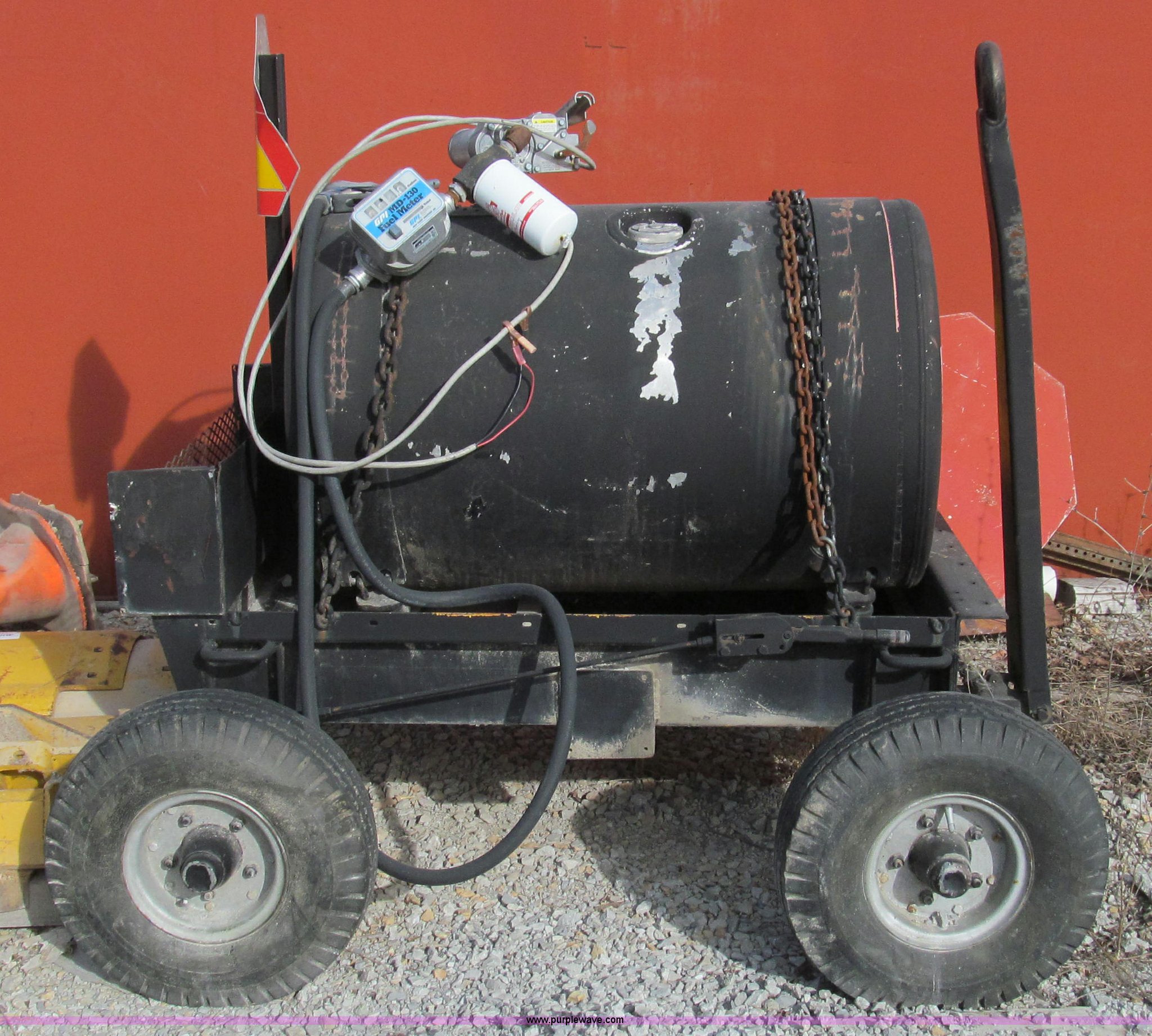Purple Wave is selling a used Fuel and Lube in Missouri. This item is a Four wheel fuel caddy with the following: 90 gallon capacity, GPI 12V pump and meter, Hose with automatic shut off nozzle, Hand brake, Pintle hitch, 5'L x 3'W cart frame, 6.90 x 9 tires