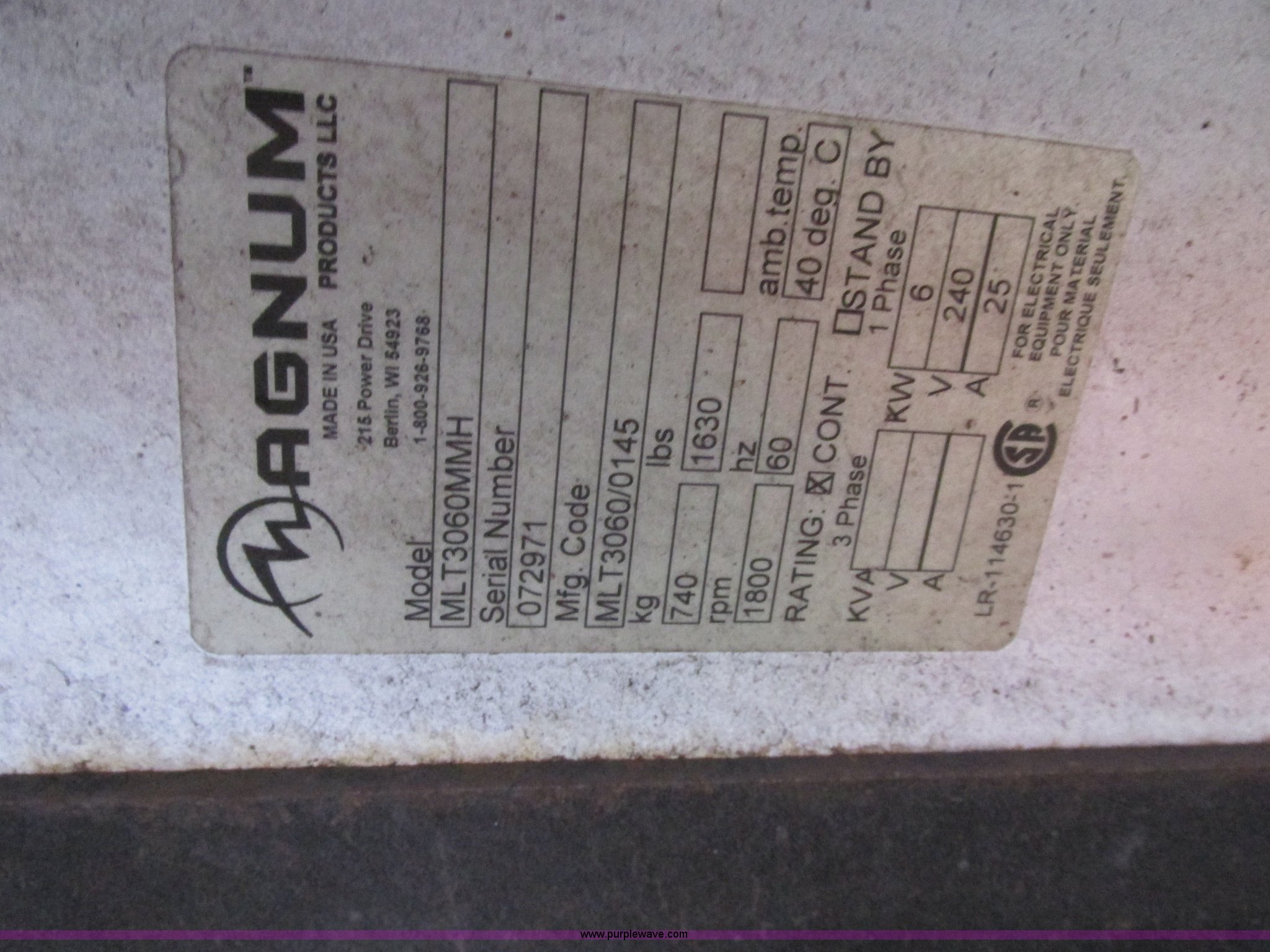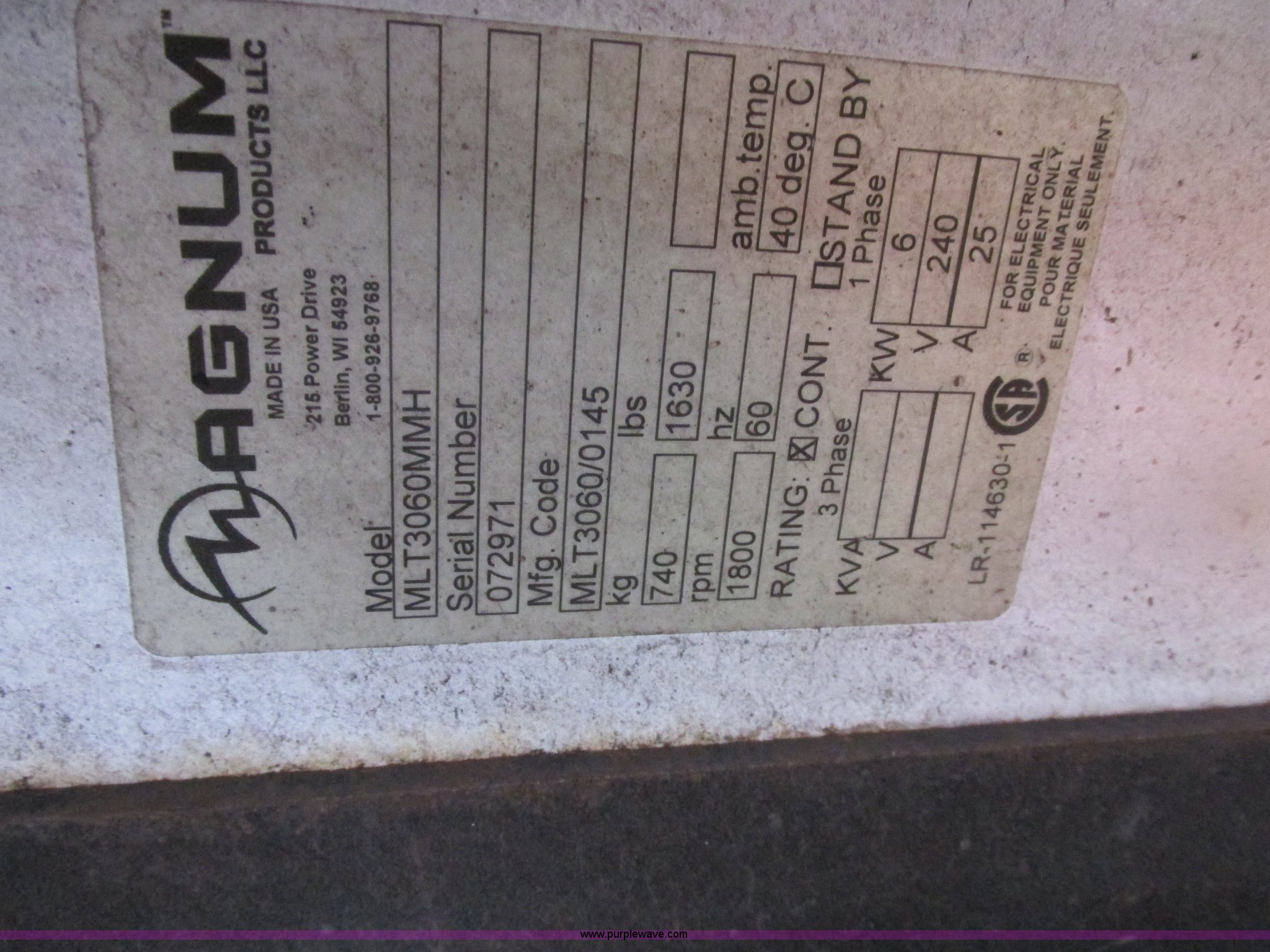 Purple Wave is selling a used Generator Set in Indiana. This item is a Magnum Pro towable light tower with the following: 3,897 hours on meter, Diesel engine, Engine inoperable, Tower winch, Front and rear stabilizer jacks, Telescopic light tower, Pintle hitch, S10170/30D13 tires, Serial 72971, EIN 996743