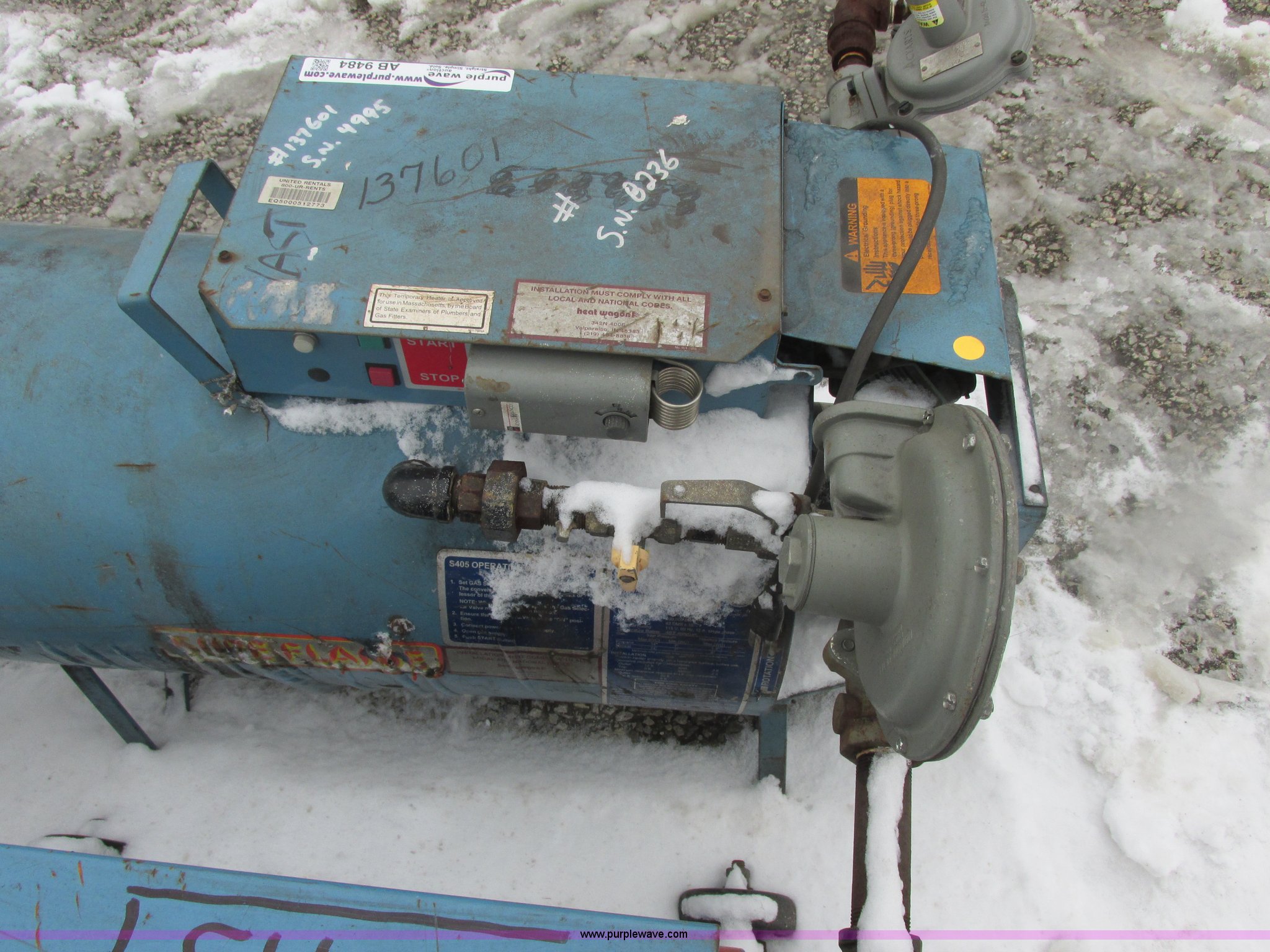 (4) natural gas direct fired heaters. (2) Heat Wagon S405, (2) Sureflame S405, 400,000 BTU, Working when removed from service last year, EIN 137601,1094757,1094764,789865. Shipping quotes available. United Rentals - East Chicago. 300 W Chicago Avenue. East Chicago, IN 46312