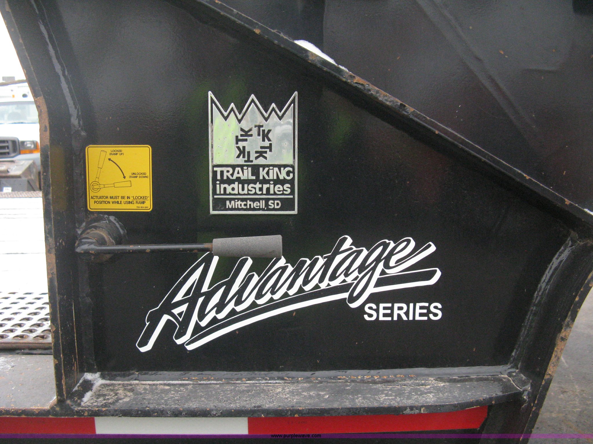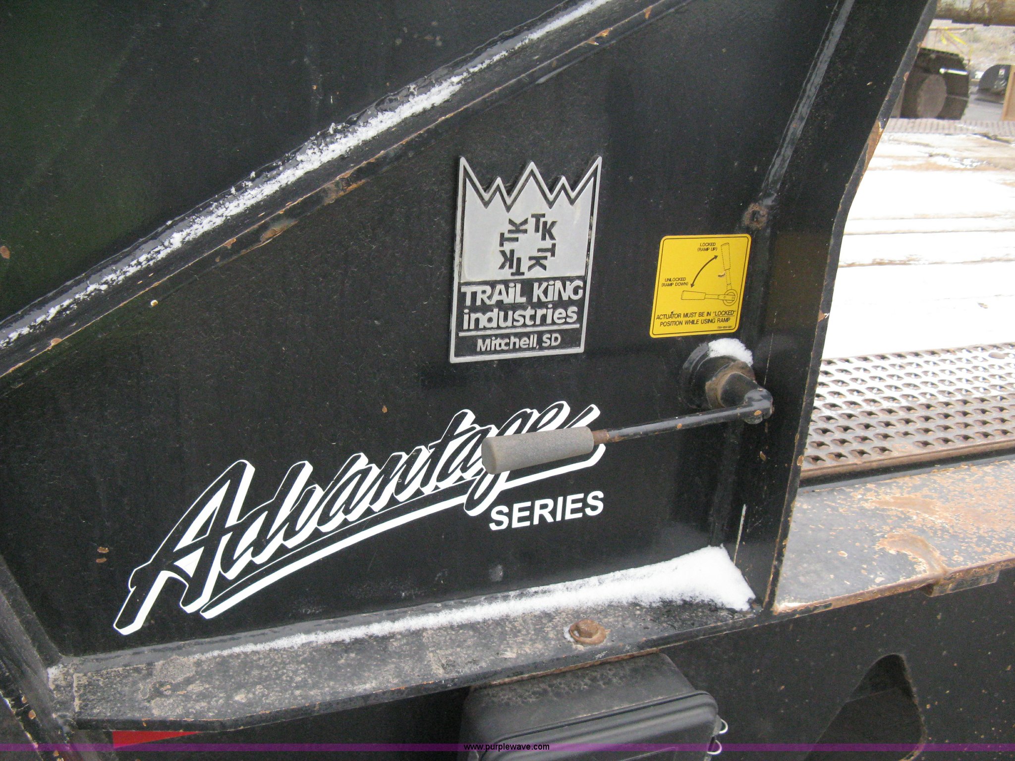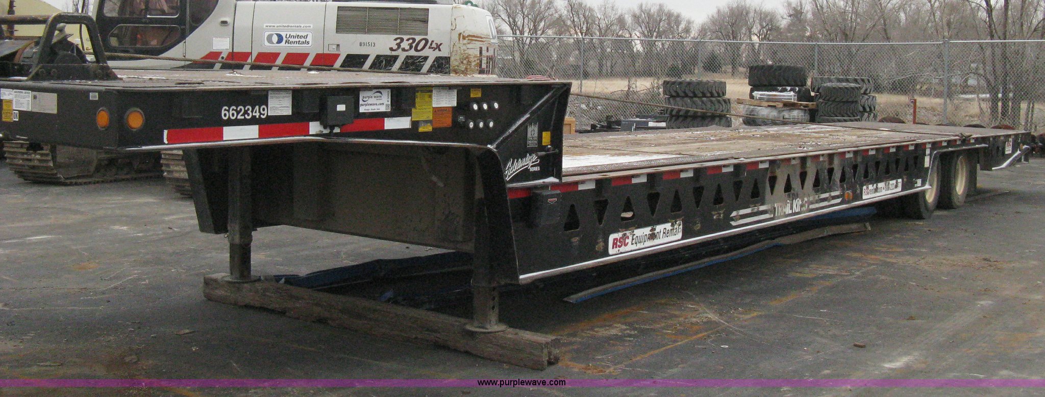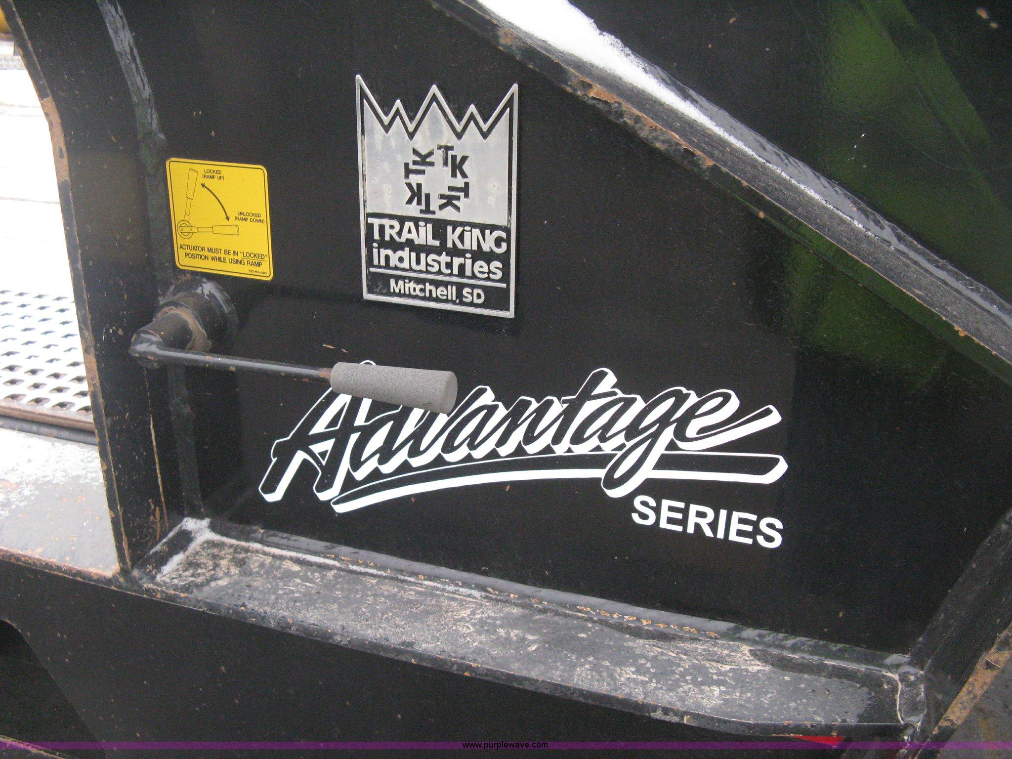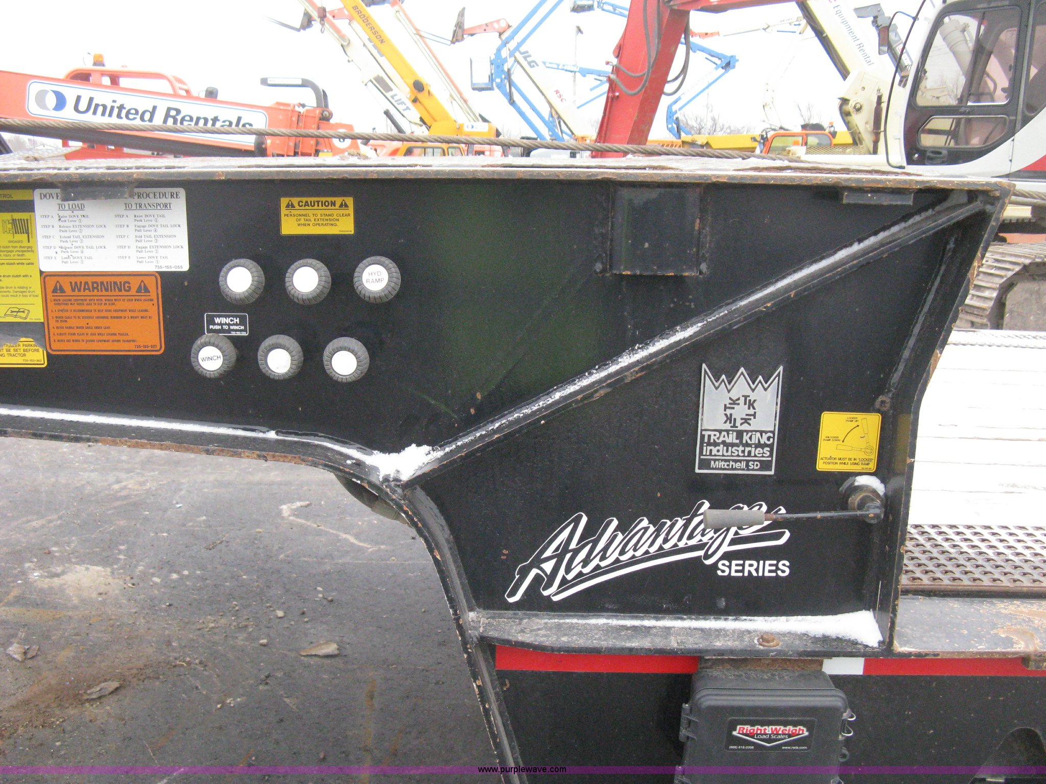 Purple Wave is selling a used Equip. Trailer in Kansas. This item is a 2007 Trail King TK70HT Advantage Series hydraulic dovetail equipment trailer with the following: Low profile/step deck, 39'L x 102"W, 9'L step deck, 46"L hydraulic fold-out dovetail, 8'L twin cylinder deck ramp to step deck, 36"H, Braden electric winch/cable/hook, Right Way load scale, Dual side mount winch and hydraulic ramp control levers, Wood/steel floor, Skid proof overlay plate, Stake side pockets, (2) recessed chain boxes on step deck, Two post landing gear, Air ride, Tandem axle, 50,000 lb load rating, 10R17.5 tires, GVWR 86,700 lbs, GAWR 21,420 lbs, EIN 662349RA