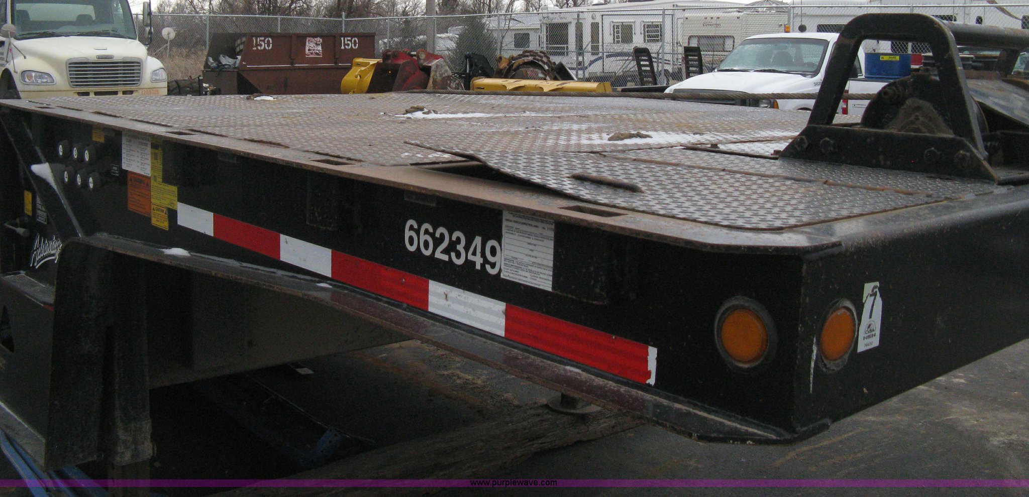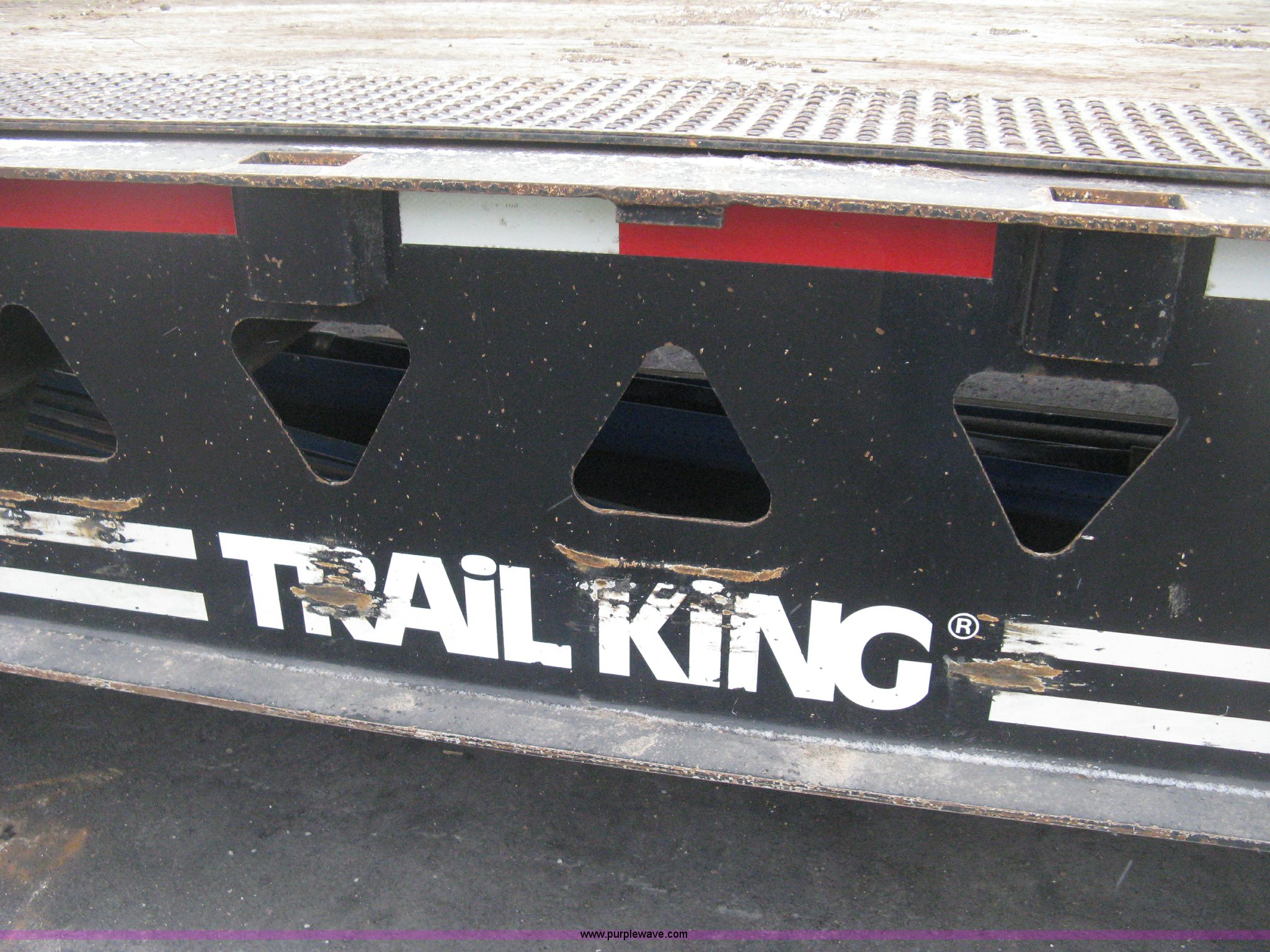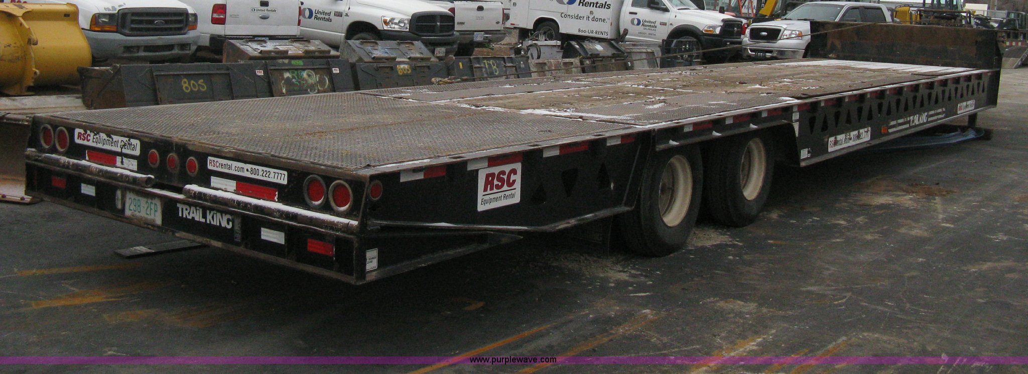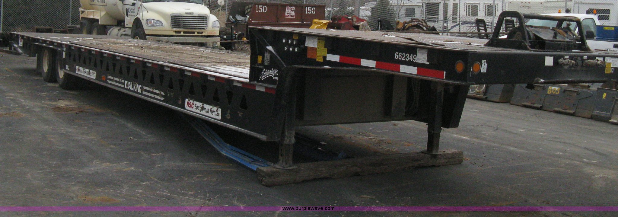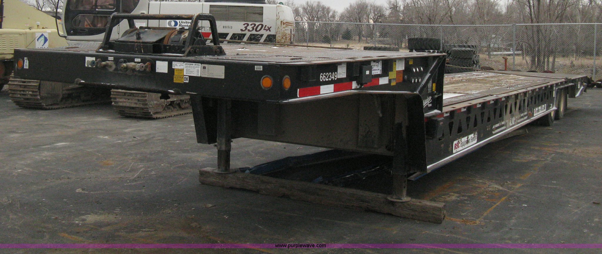 Purple Wave is selling a used Equip. Trailer in Kansas. This item is a 2007 Trail King TK70HT Advantage Series hydraulic dovetail equipment trailer with the following: Low profile/step deck, 39'L x 102"W, 9'L step deck, 46"L hydraulic fold-out dovetail, 8'L twin cylinder deck ramp to step deck, 36"H, Braden electric winch/cable/hook, Right Way load scale, Dual side mount winch and hydraulic ramp control levers, Wood/steel floor, Skid proof overlay plate, Stake side pockets, (2) recessed chain boxes on step deck, Two post landing gear, Air ride, Tandem axle, 50,000 lb load rating, 10R17.5 tires, GVWR 86,700 lbs, GAWR 21,420 lbs, EIN 662349RA
