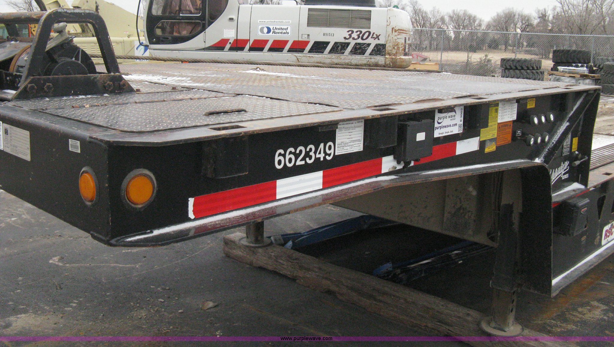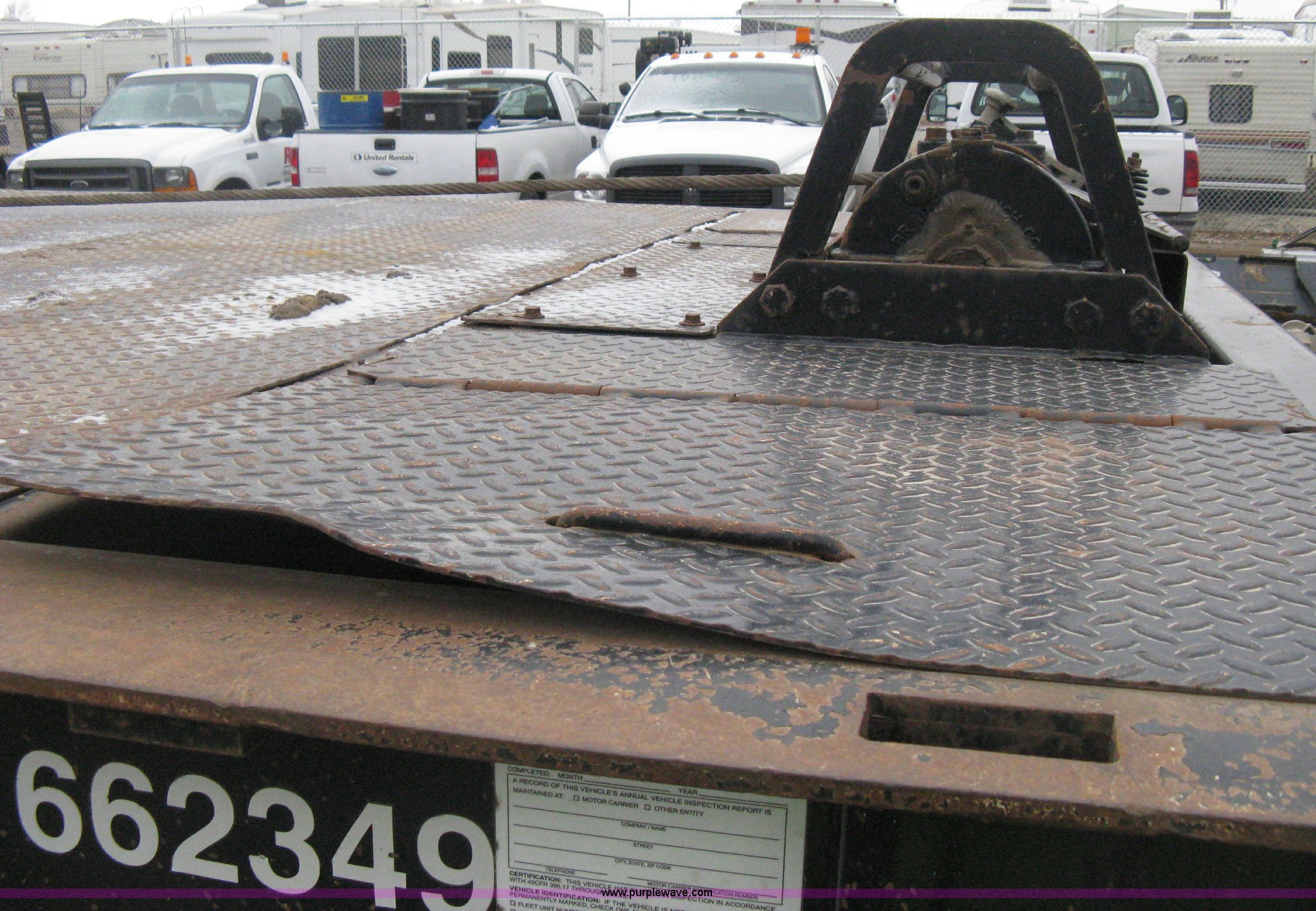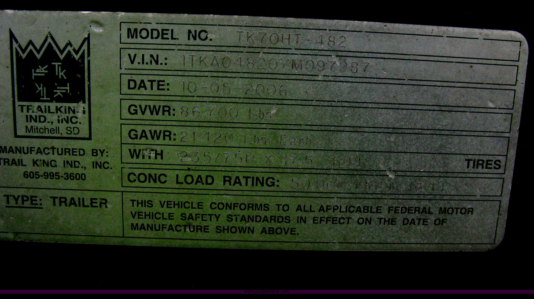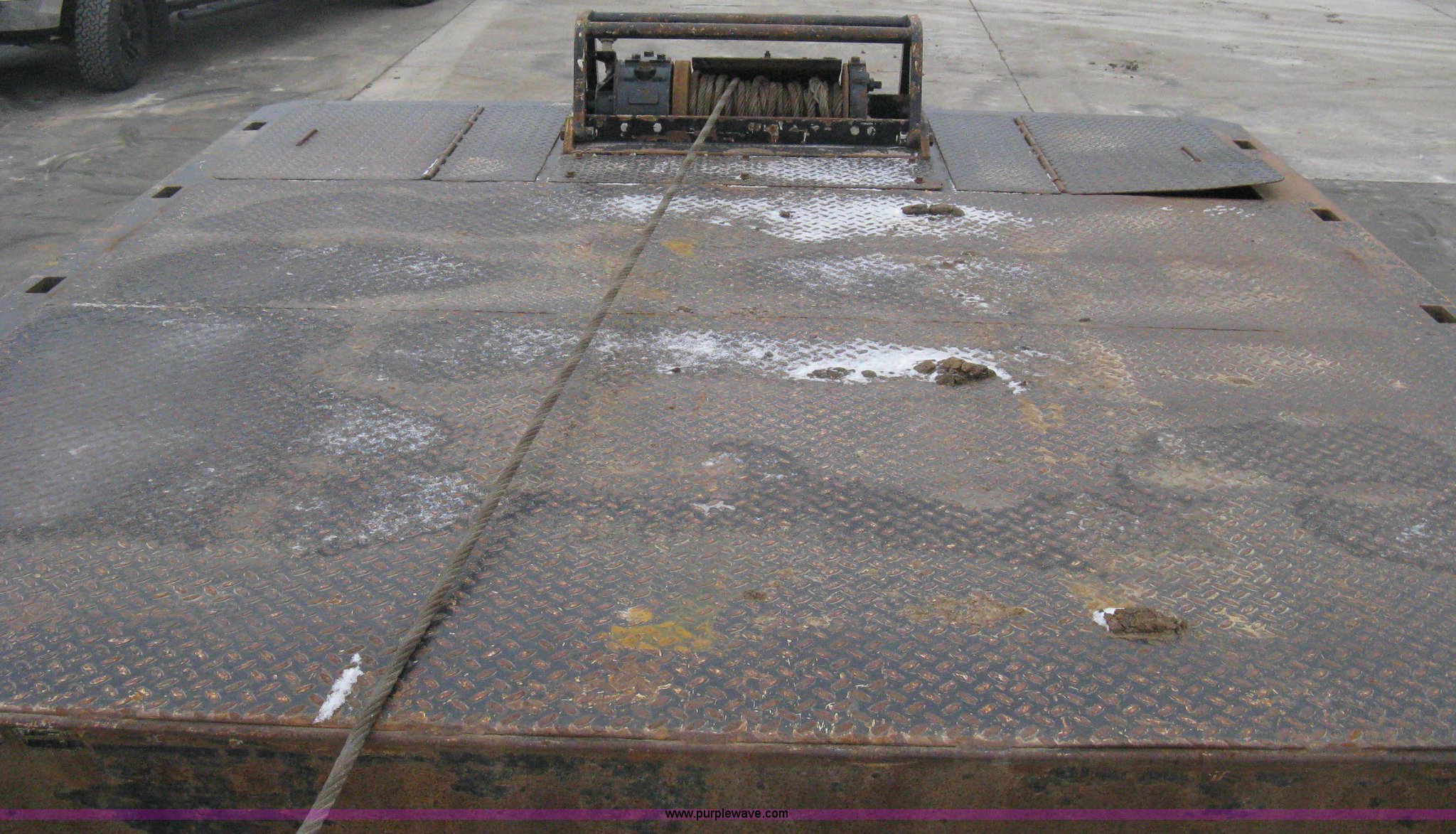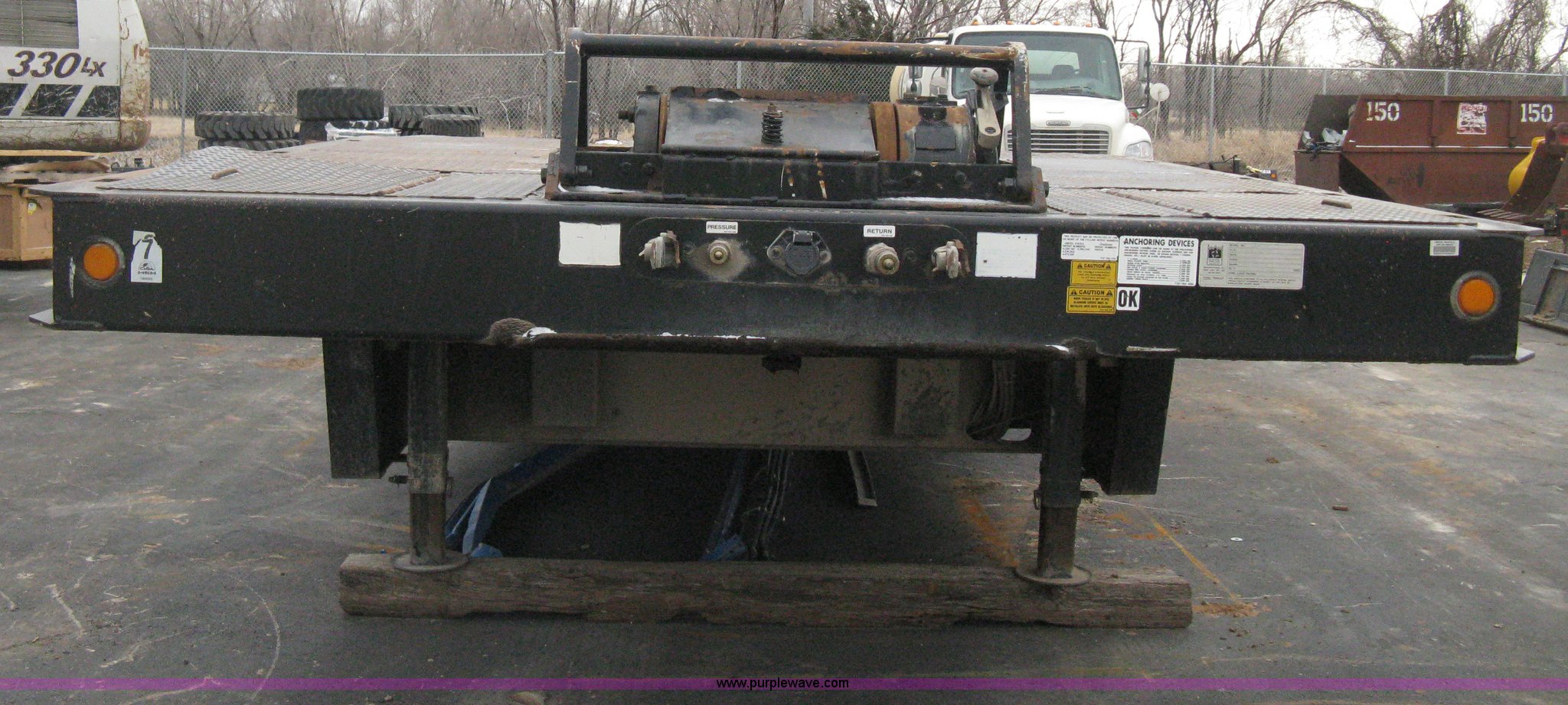 Purple Wave is selling a used Equip. Trailer in Kansas. This item is a 2007 Trail King TK70HT Advantage Series hydraulic dovetail equipment trailer with the following: Low profile/step deck, 39'L x 102"W, 9'L step deck, 46"L hydraulic fold-out dovetail, 8'L twin cylinder deck ramp to step deck, 36"H, Braden electric winch/cable/hook, Right Way load scale, Dual side mount winch and hydraulic ramp control levers, Wood/steel floor, Skid proof overlay plate, Stake side pockets, (2) recessed chain boxes on step deck, Two post landing gear, Air ride, Tandem axle, 50,000 lb load rating, 10R17.5 tires, GVWR 86,700 lbs, GAWR 21,420 lbs, EIN 662349RA