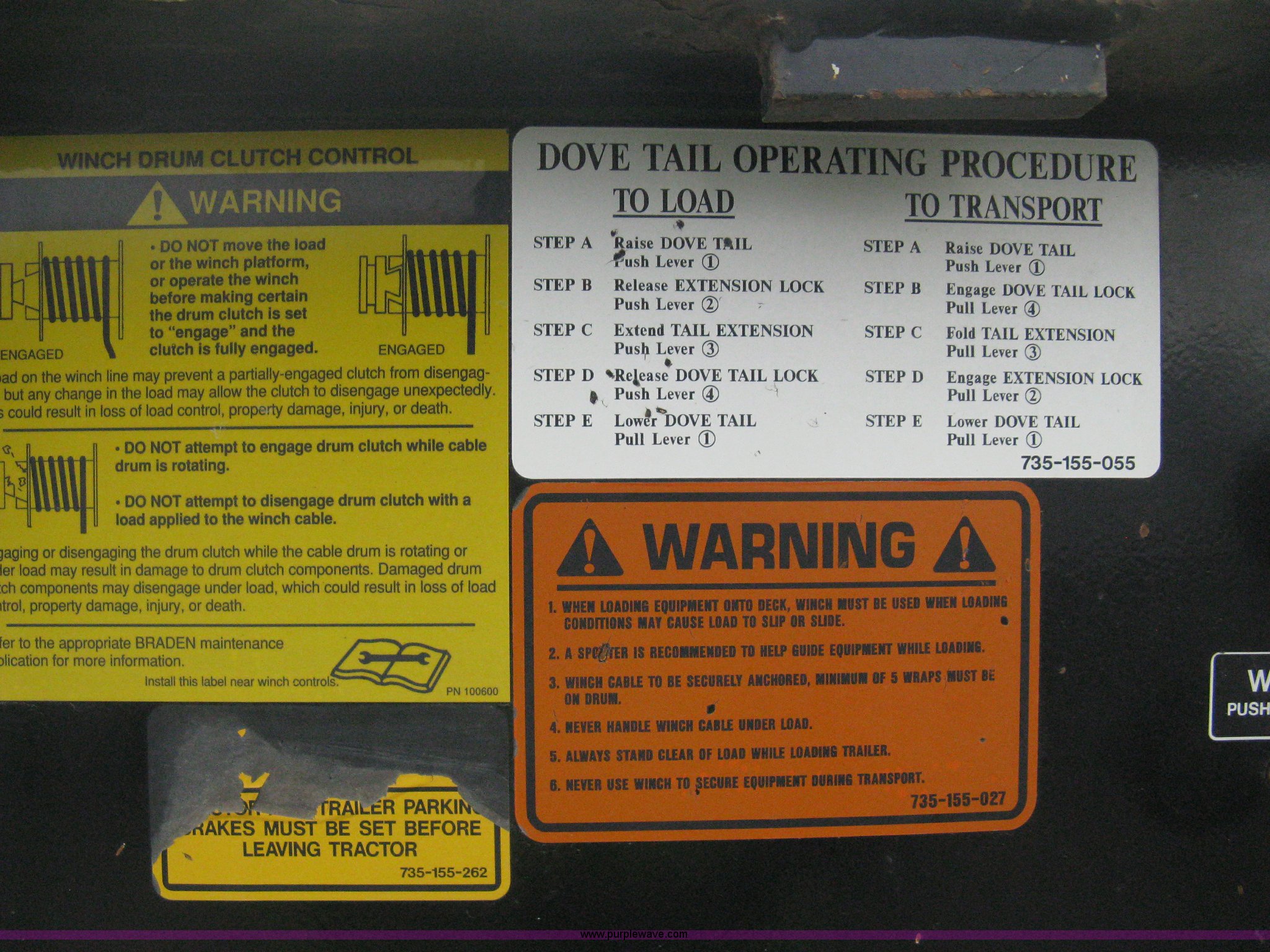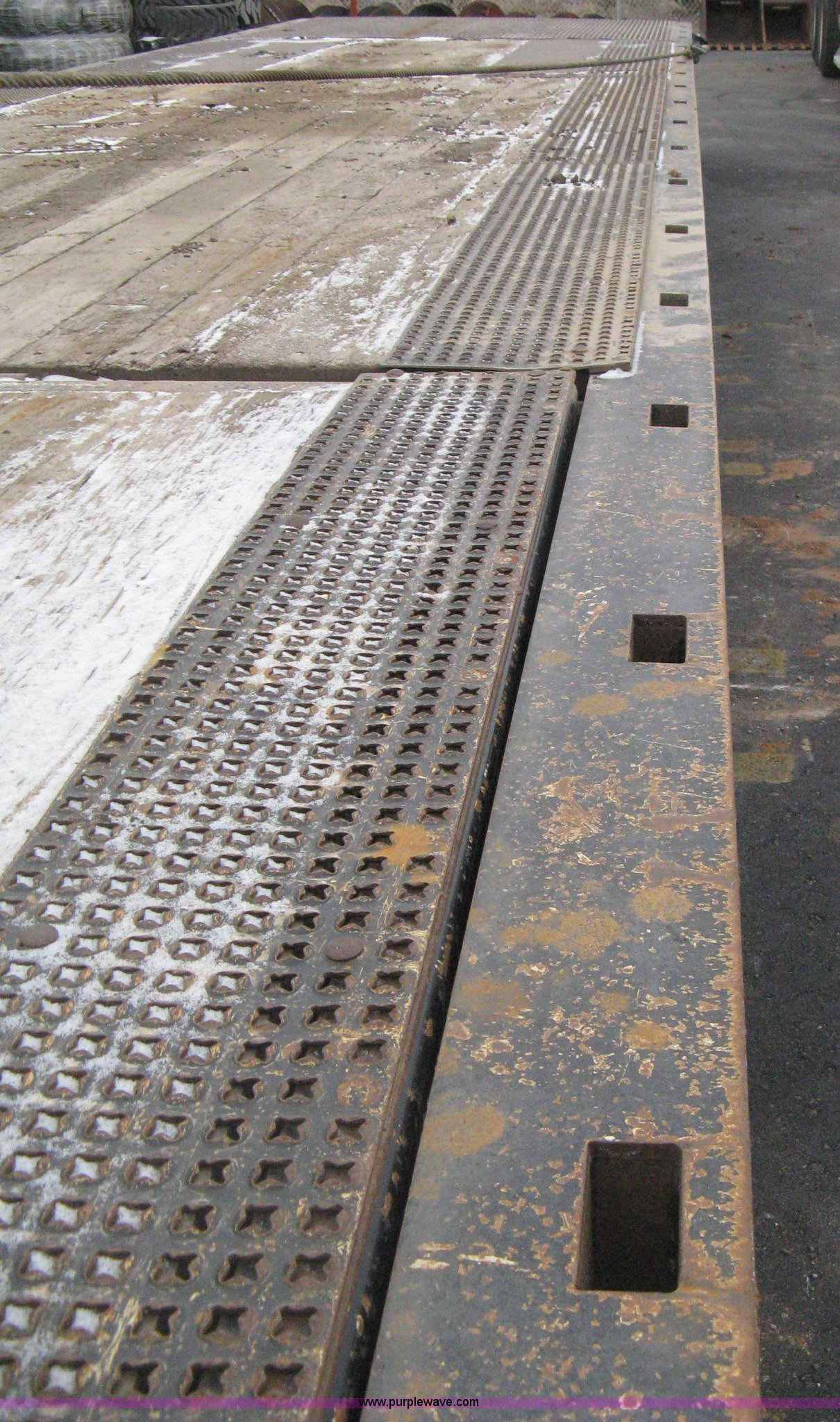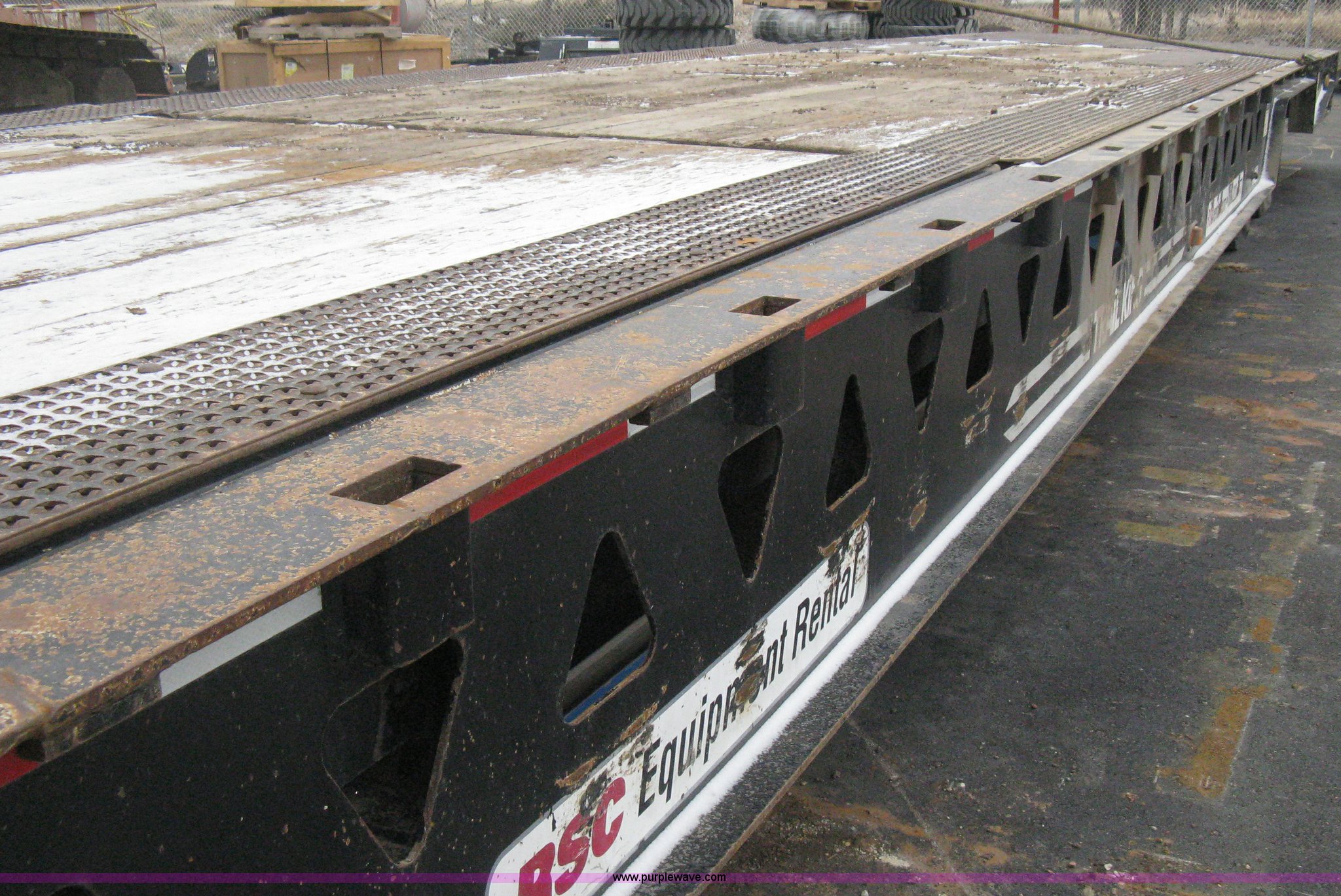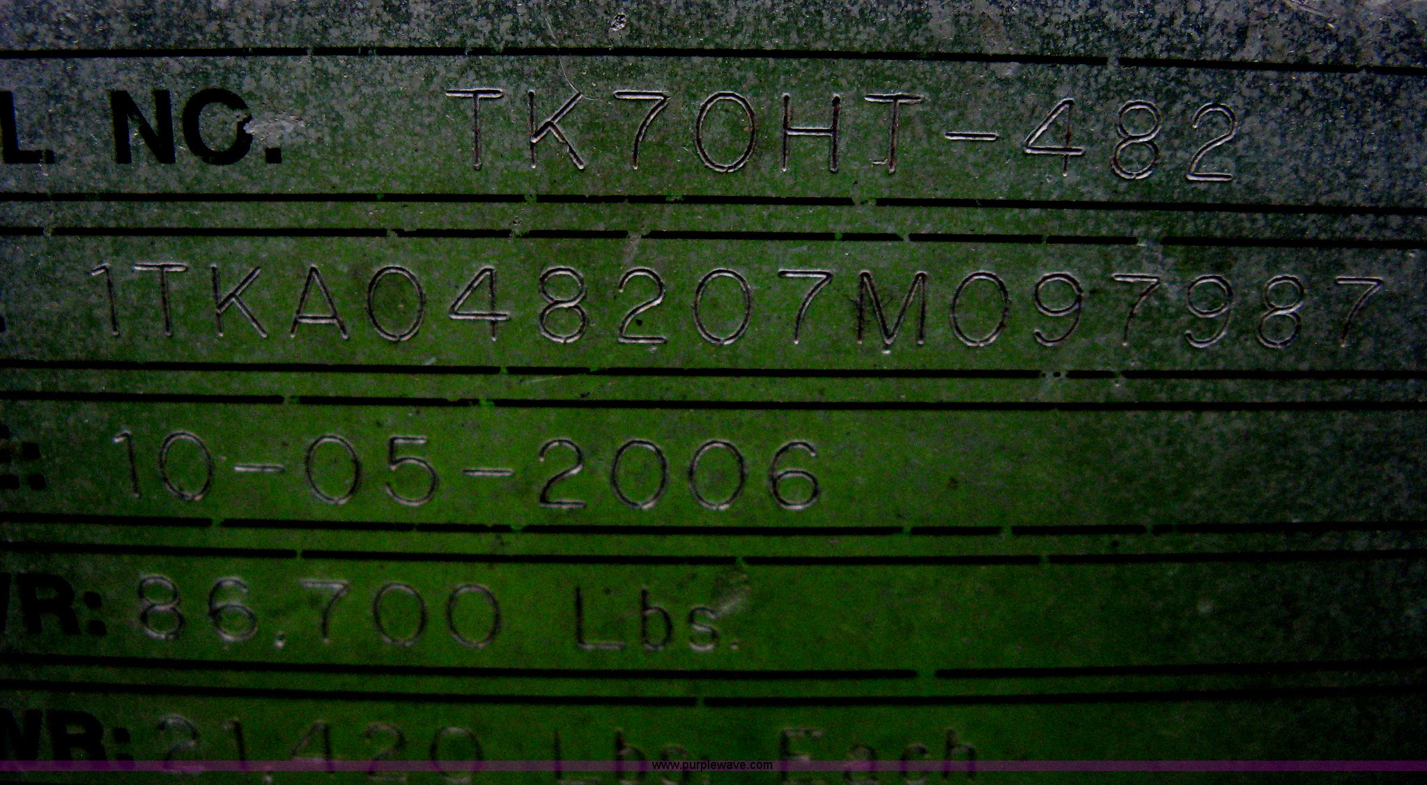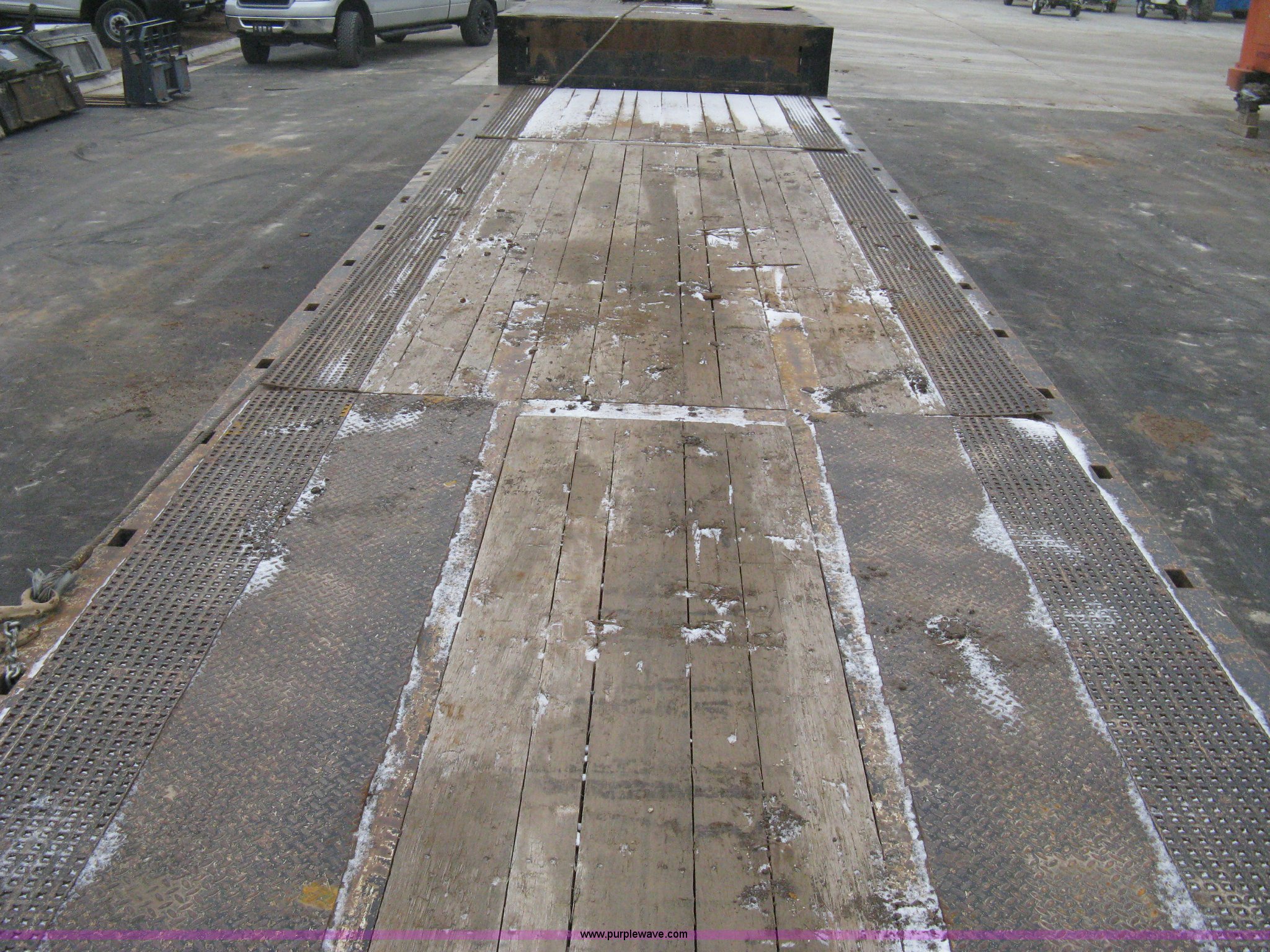 Purple Wave is selling a used Equip. Trailer in Kansas. This item is a 2007 Trail King TK70HT Advantage Series hydraulic dovetail equipment trailer with the following: Low profile/step deck, 39'L x 102"W, 9'L step deck, 46"L hydraulic fold-out dovetail, 8'L twin cylinder deck ramp to step deck, 36"H, Braden electric winch/cable/hook, Right Way load scale, Dual side mount winch and hydraulic ramp control levers, Wood/steel floor, Skid proof overlay plate, Stake side pockets, (2) recessed chain boxes on step deck, Two post landing gear, Air ride, Tandem axle, 50,000 lb load rating, 10R17.5 tires, GVWR 86,700 lbs, GAWR 21,420 lbs, EIN 662349RA