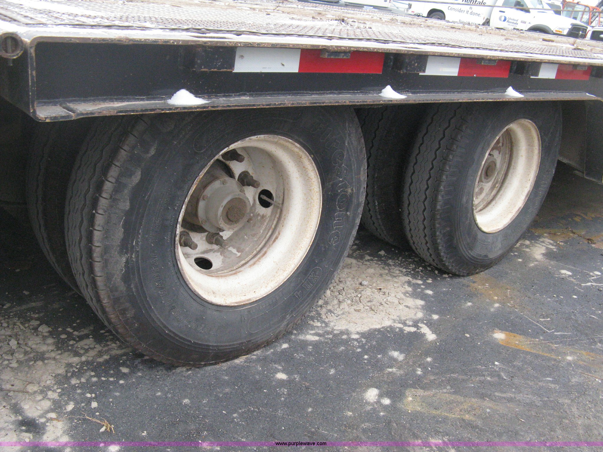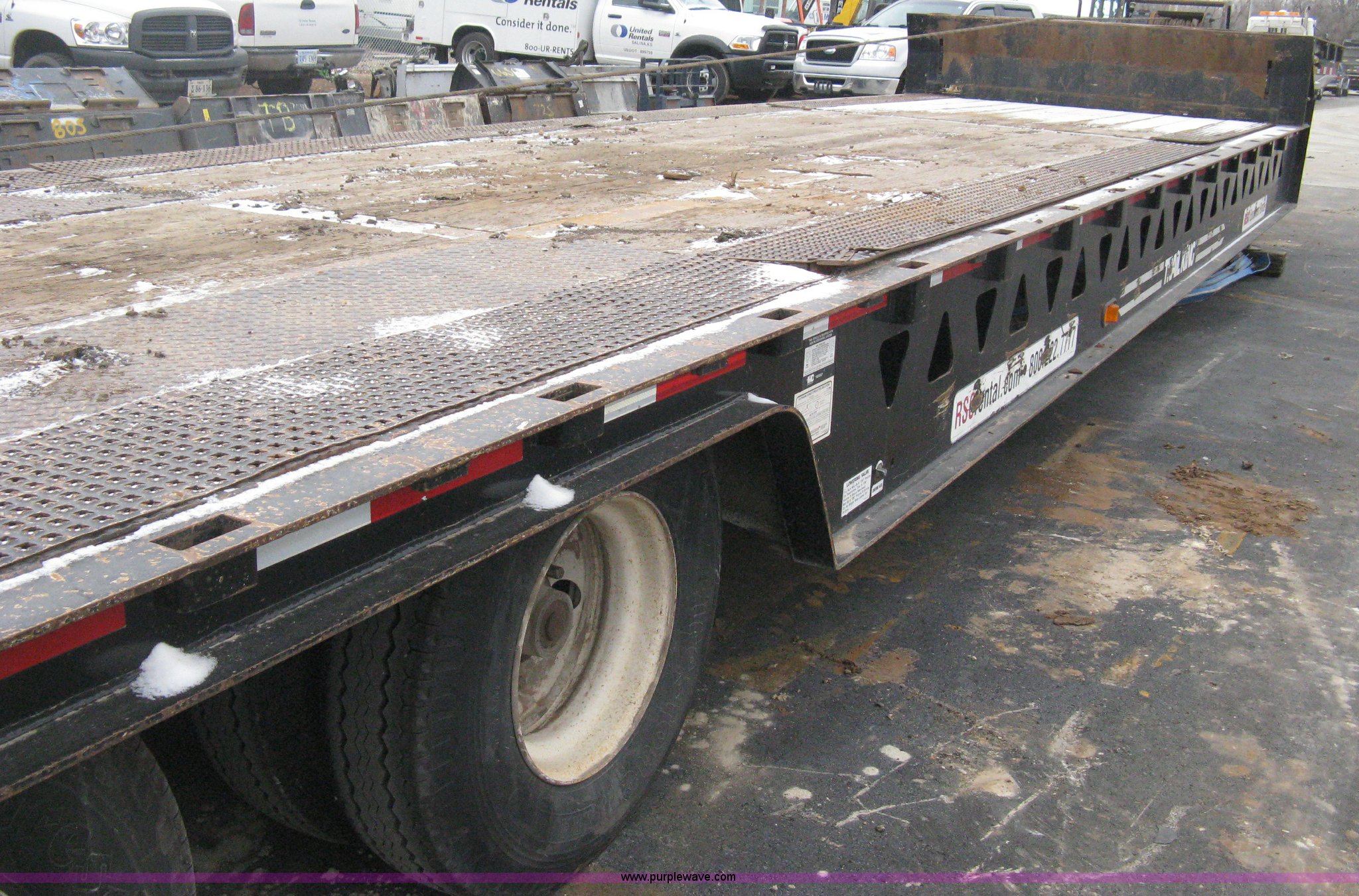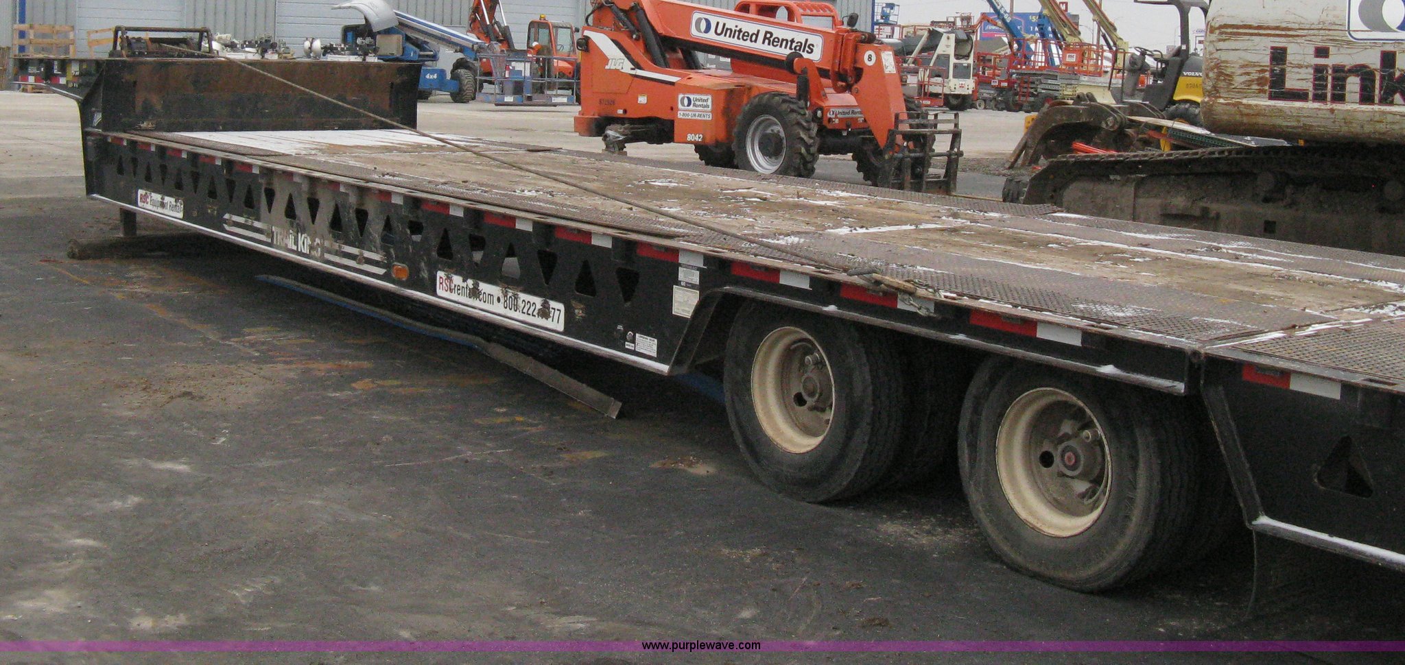 2007 Trail King TK70HT Advantage Series hydraulic dovetail equipment trailer. Low profile/step deck, 39'L x 102"W 9'L step deck, 46"L hydraulic fold-out dovetail, 8'L twin cylinder deck ramp to step deck, 36"H, Braden electric winch/cable/hook, Right Way load scale, Dual side mount winch and hydraulic ramp control levers, Wood/steel floor Skid proof overlay plate, Stake side pockets, (2) recessed chain boxes on step deck, Two post landing gear, Air ride, Tandem axle, 50,000 lb load rating, 10R17.5 tires, GVWR 86,700 lbs, GAWR 21,420 lbs, EIN 662349RA. Title distribution may be delayed up to 30 days from verification of funds. 1TKA048207M097987. Shipping quotes available. United Rentals - Wichita. 9127 W Kellog Dr. Wichita , KS 67209