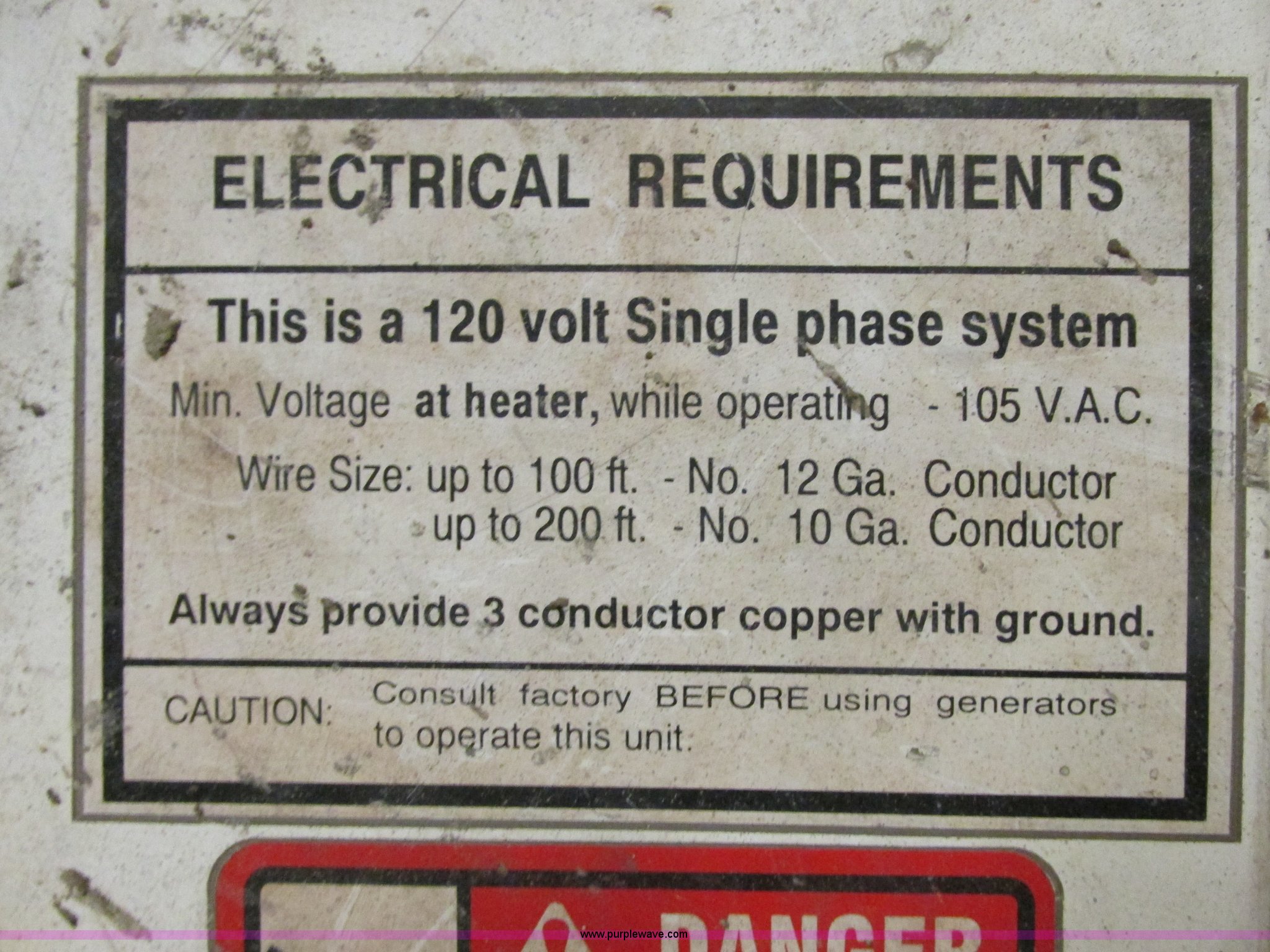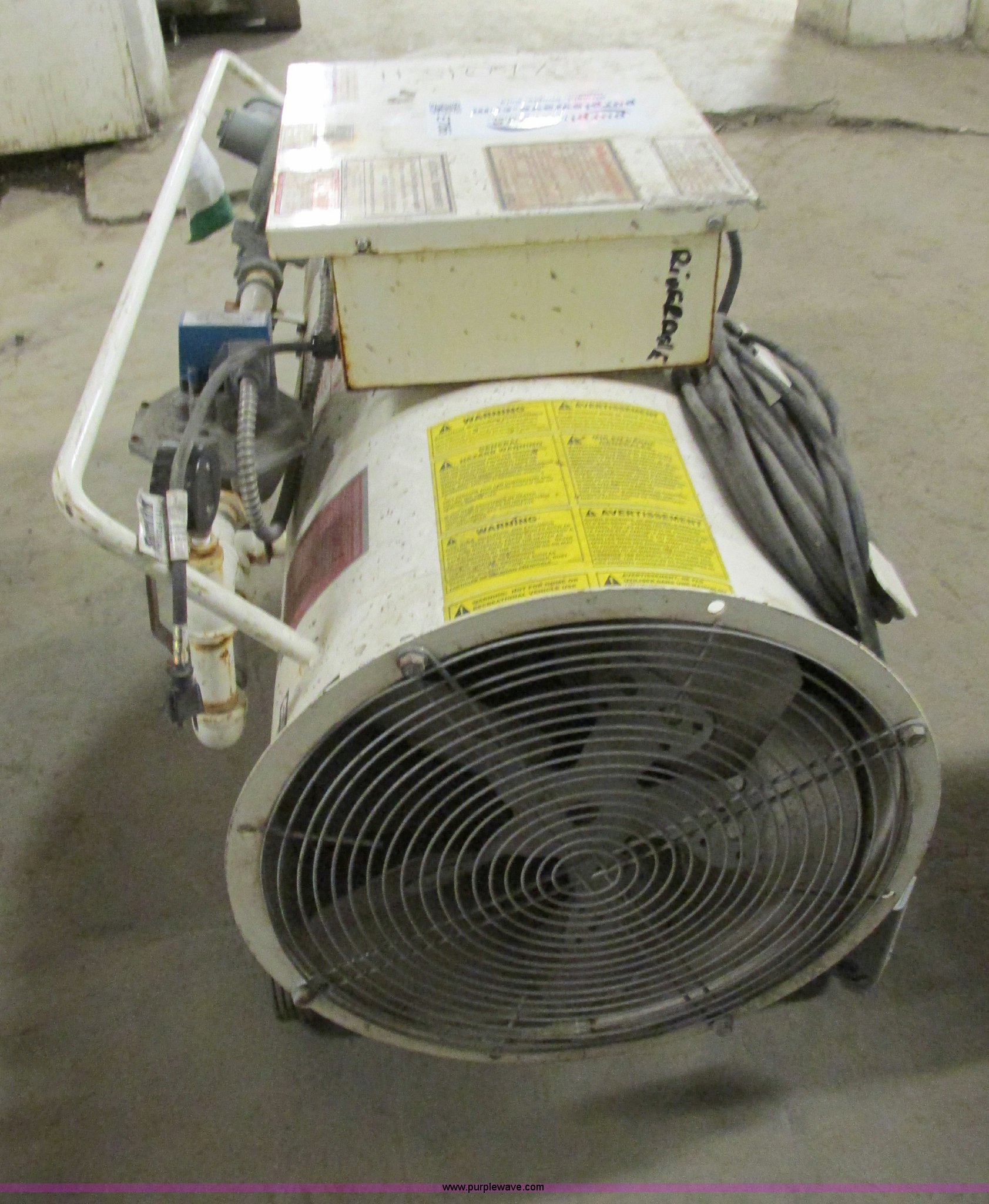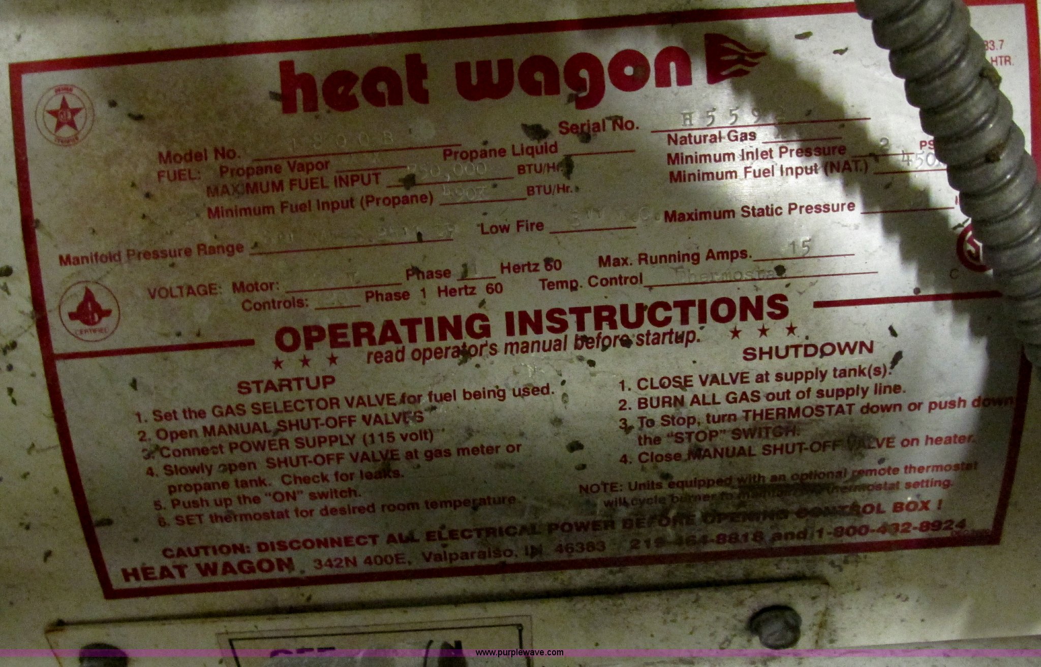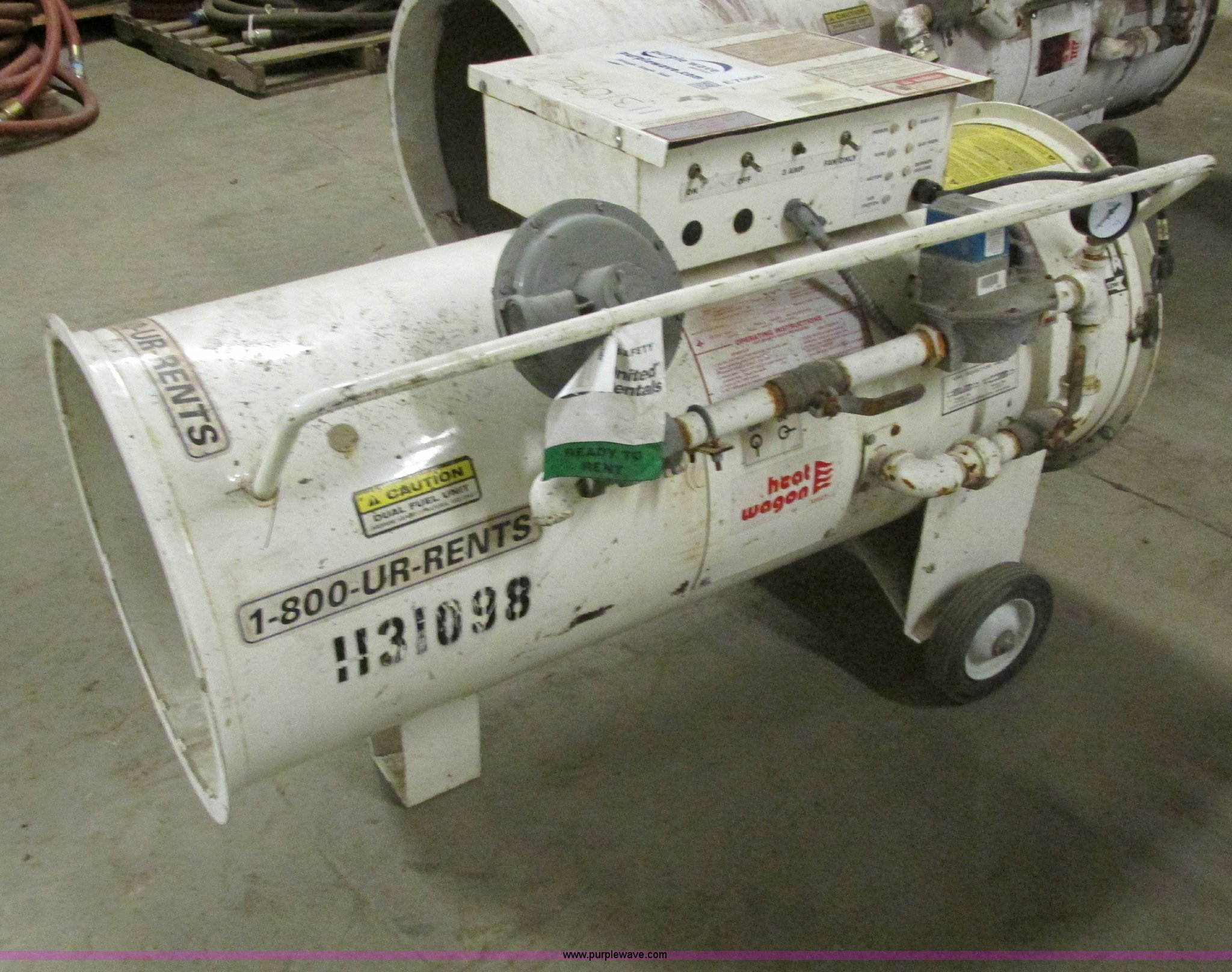 Purple Wave is selling a used Tools in Illinois. This item is a Heat Wagon 1800B propane or natural gas heater with the following: Direct fired, 750,000 BTU, Serial H5592, EIN 1131098