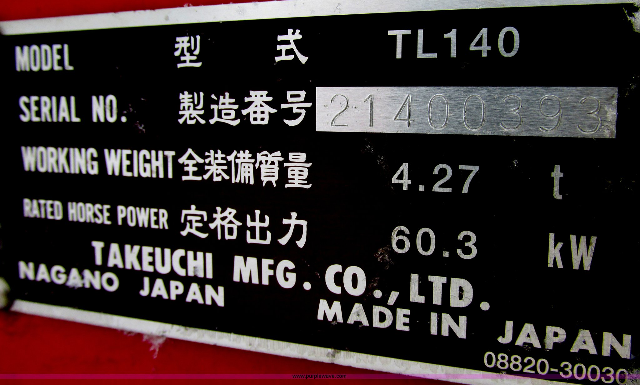 Purple Wave is selling a used Tracked Skid Steer Loader in Illinois. This item is a 2004 Takeuchi TL140 skid steer with the following: 2,802 hours on meter, Three cylinder diesel engine, Liquid cooled, Starts and runs, but needs engine, Enclosed cab, Heat, Front and rear lights, Hydraulic remote, 73"W bucket, Quick attach bucket, Windshield wiper, Rubber tracks, 9,769 lbs. base operating weight, Dented roof, Needs engine, Serial 21400393, EIN 605984