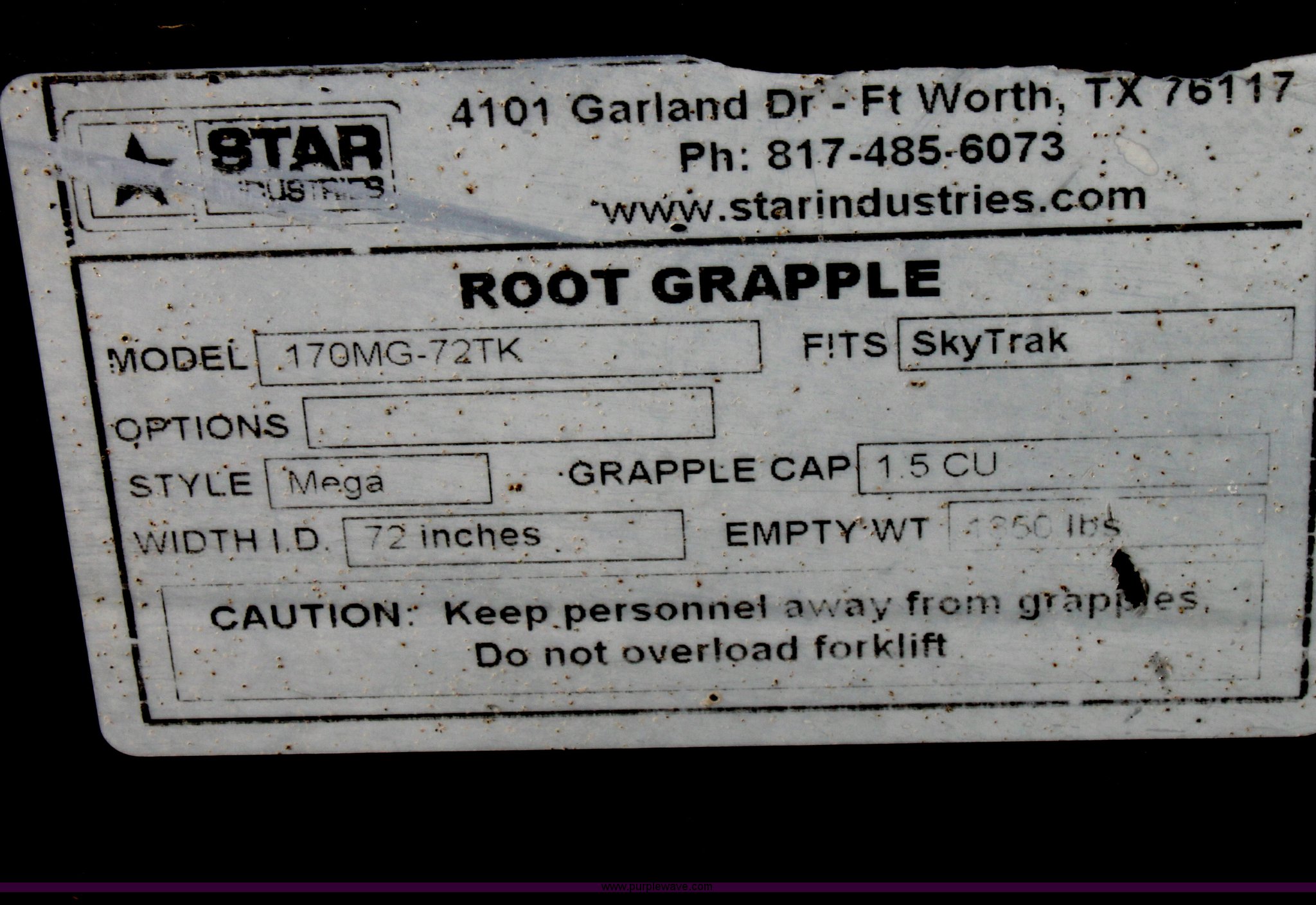 Star industries root grapple. Model 170MG-72TK, Sky trak, 72"W, 1.5 cu. yd. capacity, 1,350 lbs empty weight. Shipping quotes available. ICM. Colwich, KS 67030