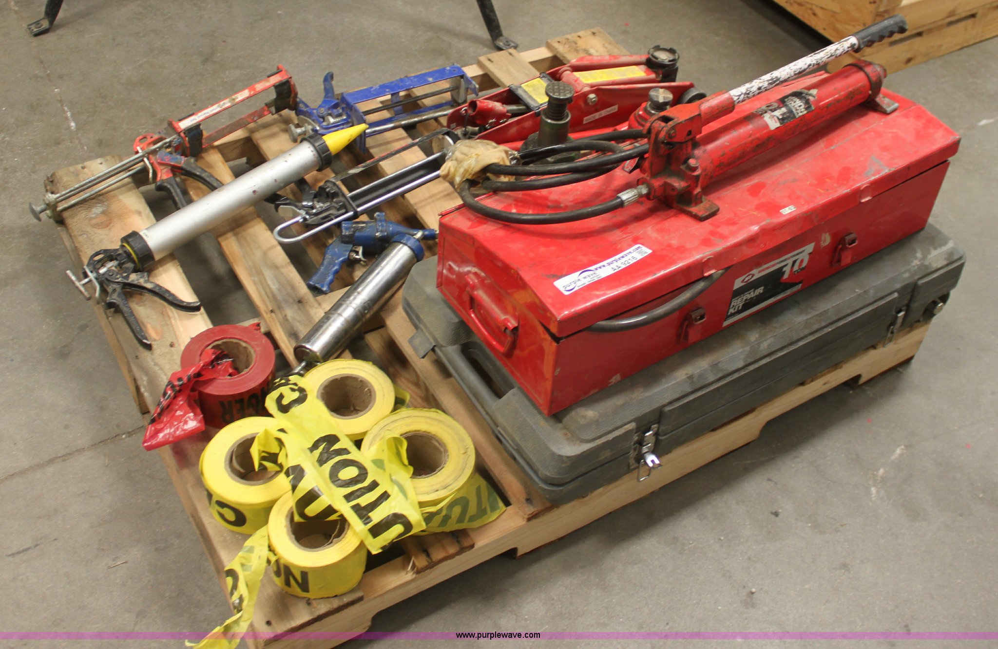Assorted tools. (3) 10 ton American force, foundy body, and frame porta-power, 20 ton bottle jack, 12 ton bottle jack, Grease gun, Two stage Epoxy gun, (5) rolls of caution tape, And more. Shipping quotes available. ICM. Colwich, KS 67030