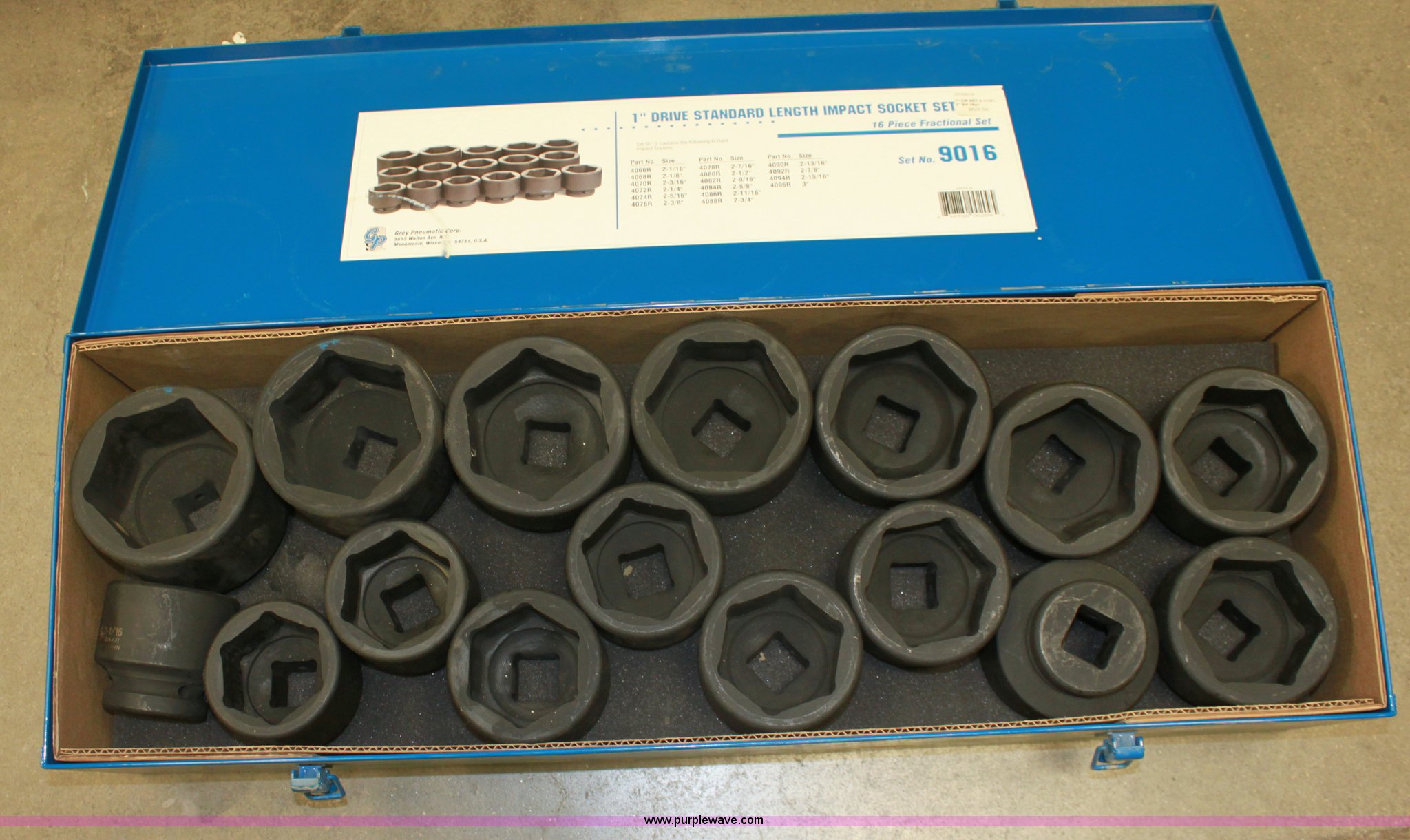Purple Wave is selling a used Tools in Kansas. This item is a GP Grey Pneumatic Corp. 1" drive standard length impact socket set with the following: (16) piece, 2 1/16", 2 1/8", 2 3/16", 2 1/4", 2 5/16", 2 3/8", 2 1/16", 2 1/2", 2 9/16", 2 5/8", 2 11/16", 2 3/4", 2 13/16", 2 7/8", 2 13/16", 3"