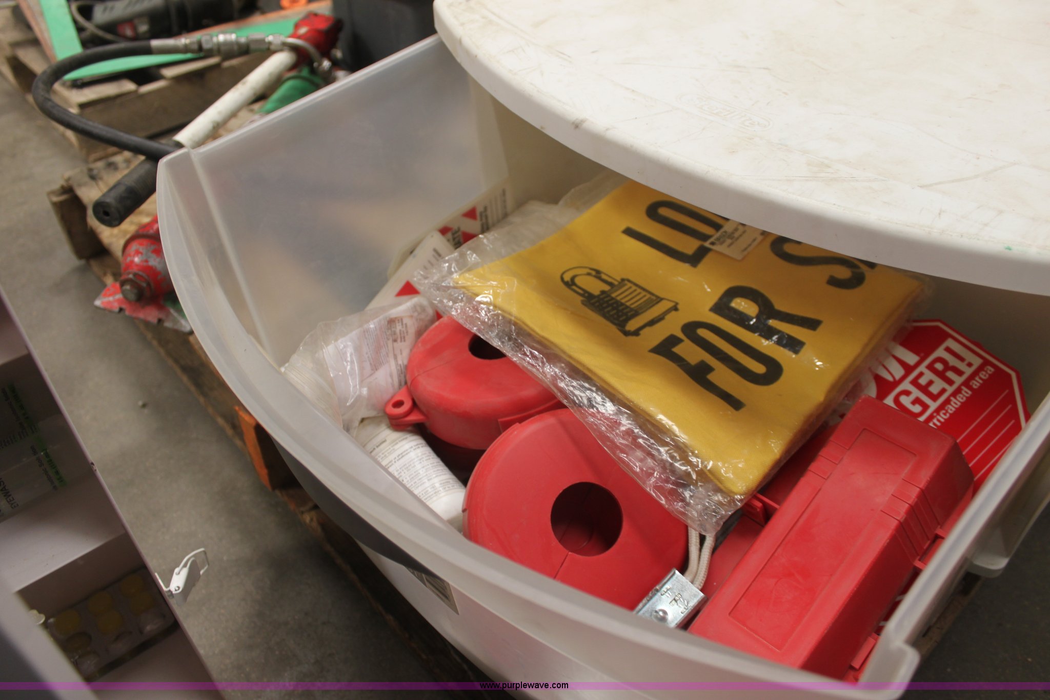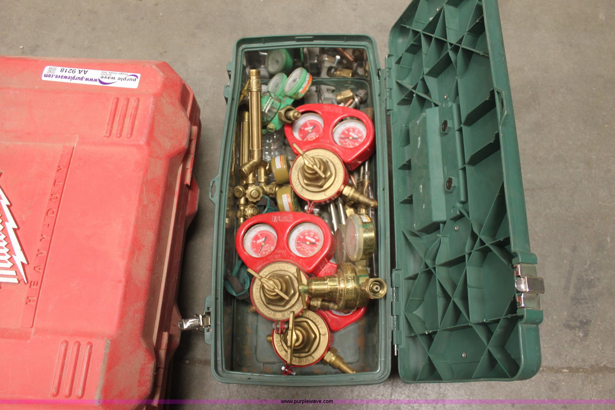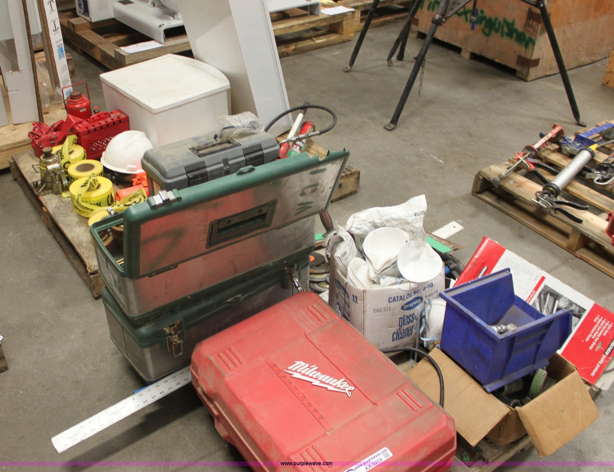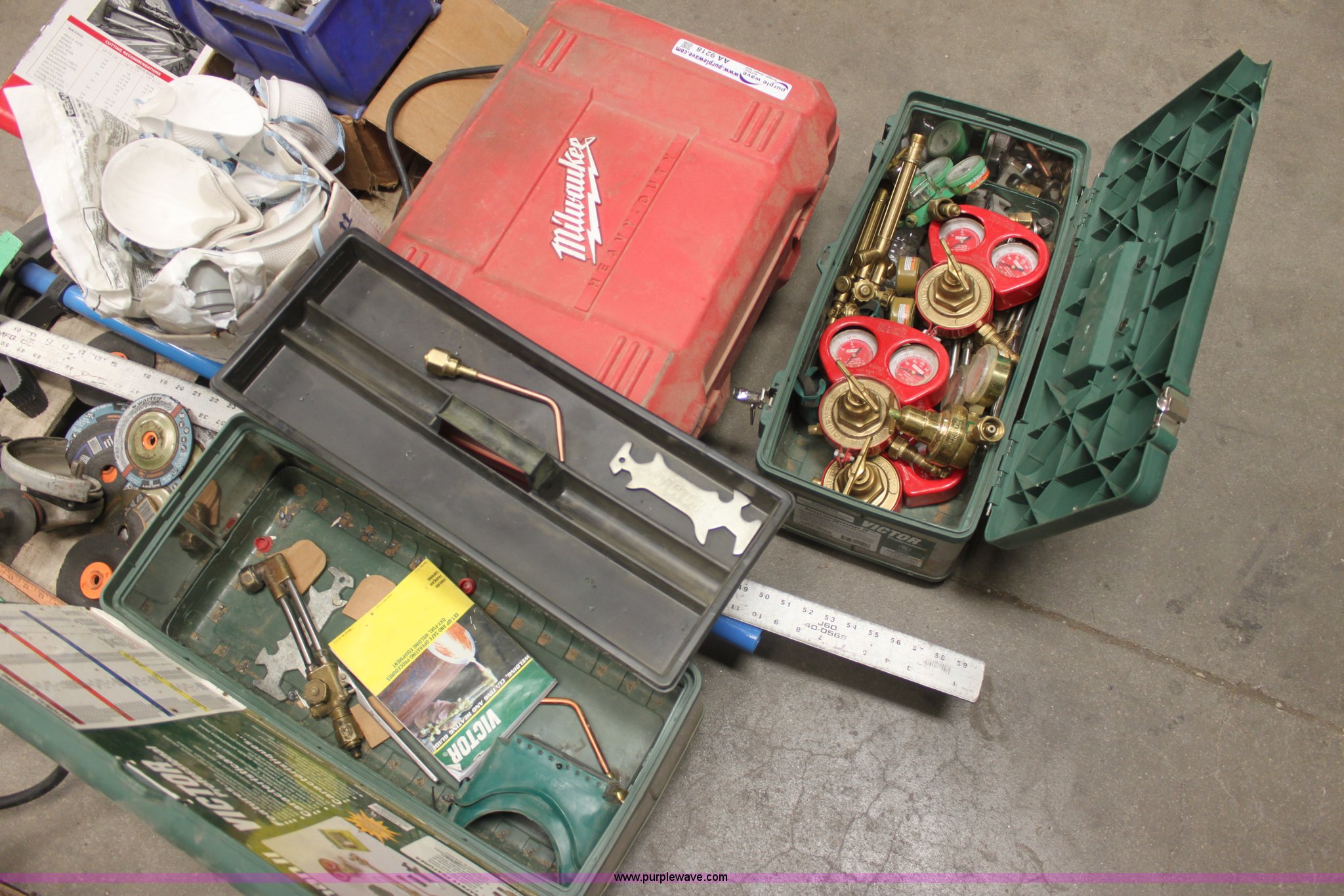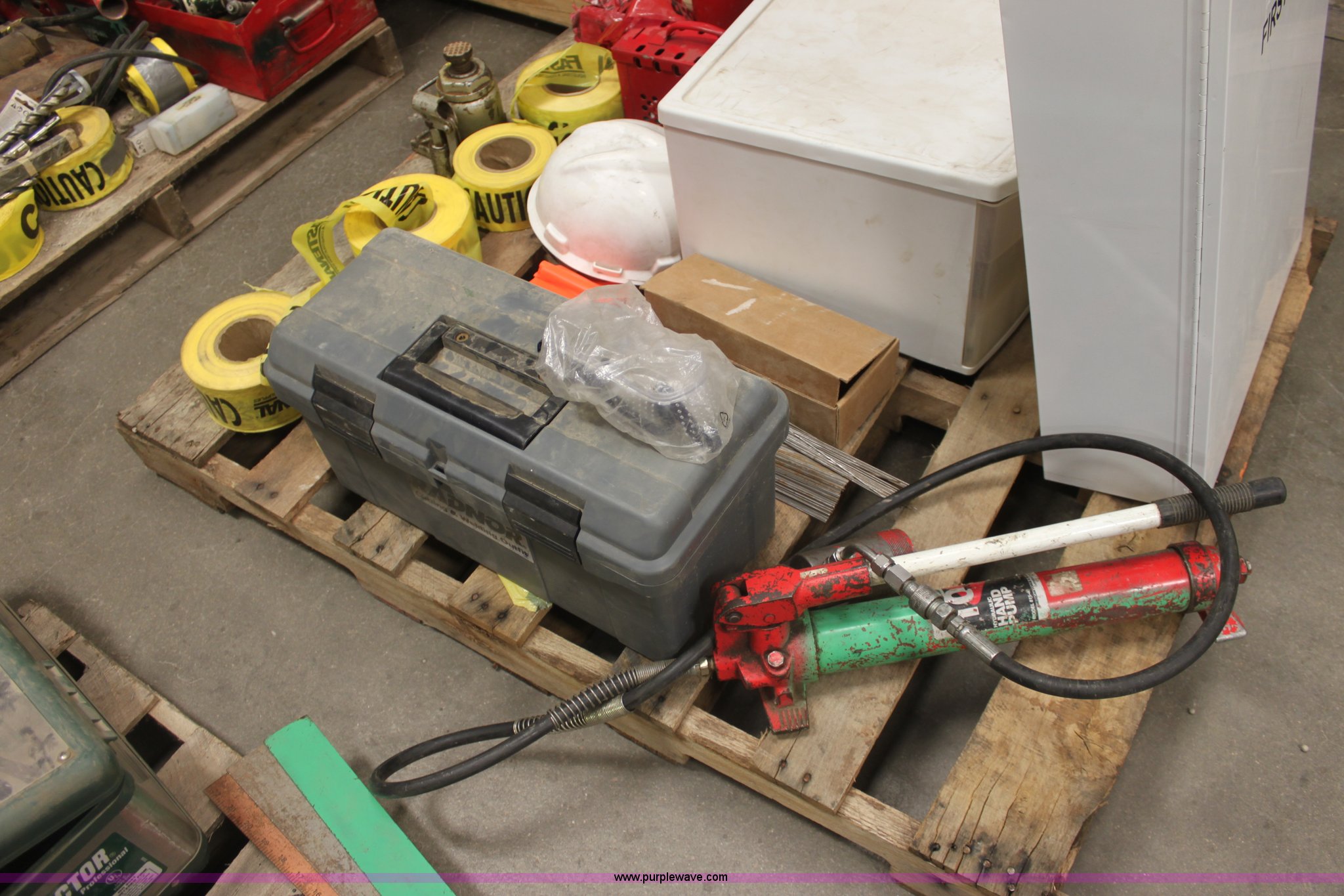 Purple Wave is selling a used Tools in Kansas. This item is a Assorted tools with the following: Victor torch gauges, Milwaukee port-a-band, (3) squares, 1" EMT pipe bender, 10 ton porta-power, (4) rolls of caution tape, (2) bottle jack, And more