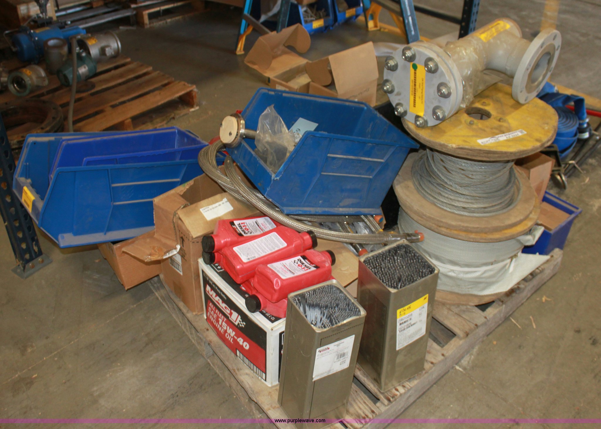 Assorted tools and cable. Partial spool of 3/8" steel cable, (2) 1000' spools of 3/8" steel cable, (2) Allanson 120V transformers Unused, Fuel can, (8) quarts of Mac-1 15W-40 oil, (7) 32 oz bottles of Diesel Plus 911 power service, Open box of 6010 1/8" welding rod, Open box of 7018-H4R welding rod and more. Shipping quotes available. ICM. Colwich, KS 67030