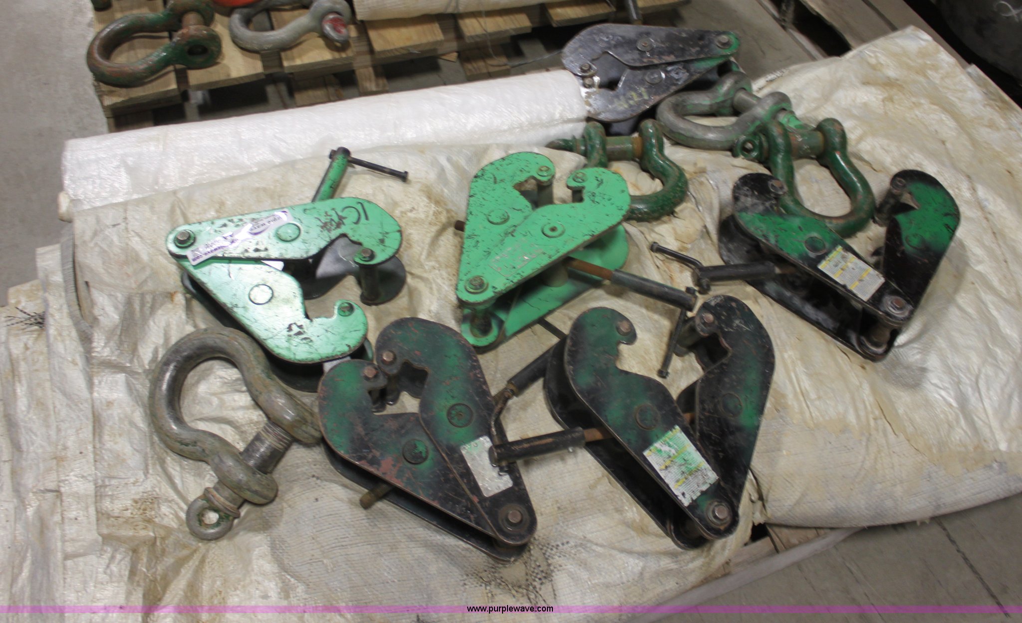 Purple Wave is selling a used Tools in Kansas. This item is a Assorted tools with the following: (6) three ton beam clamps, (4) Crossby clevises, Roll of plastic, Trap