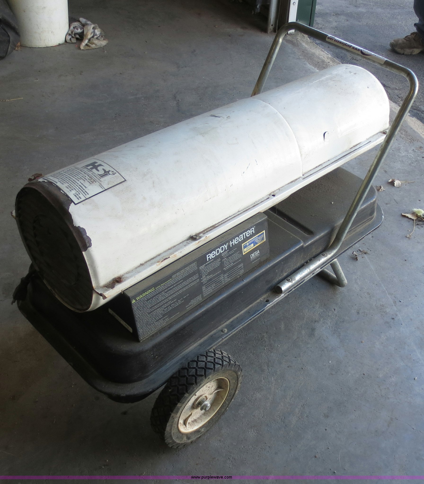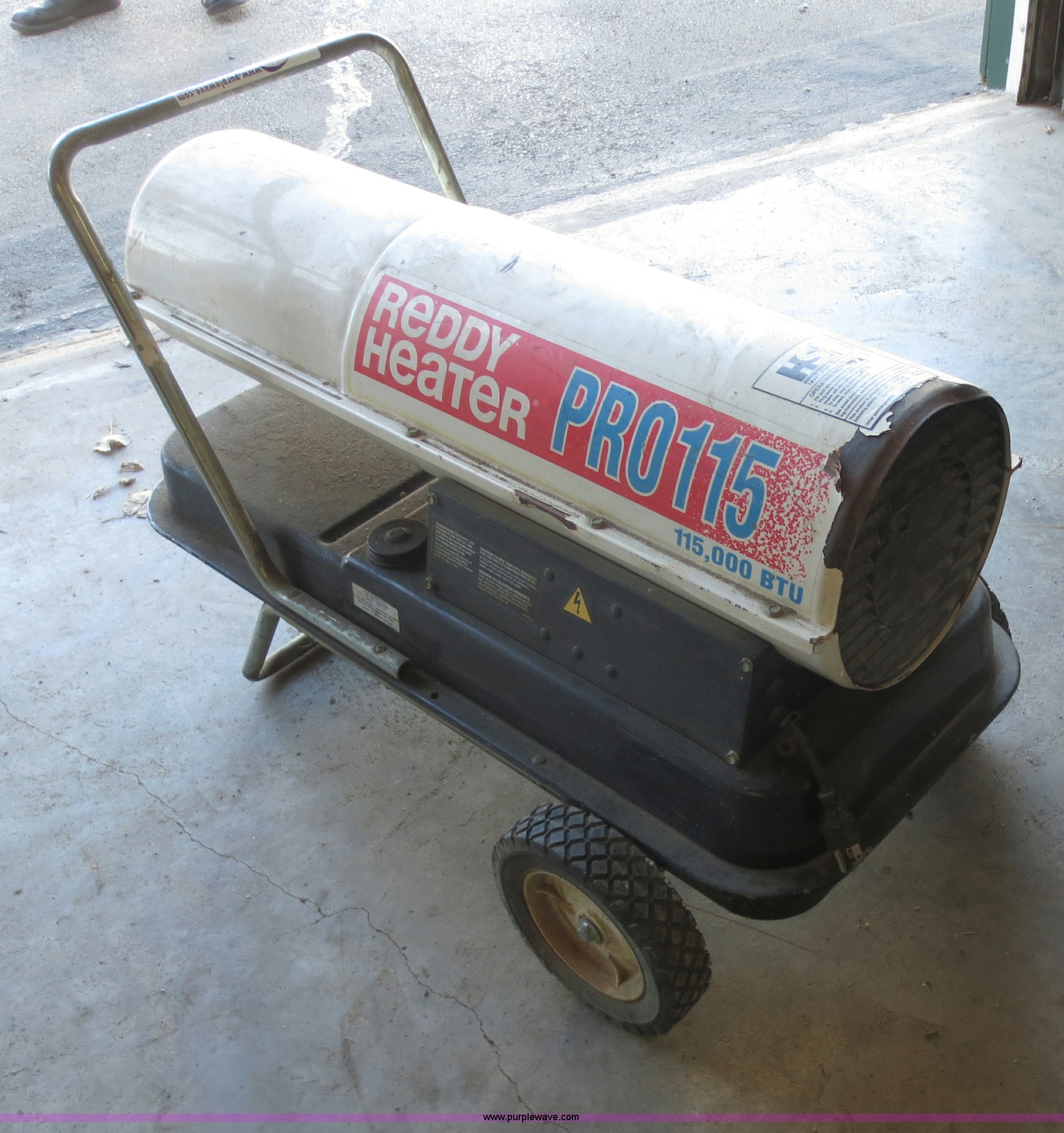 Purple Wave is selling a used Tools in Kansas. This item is a Reddy Heater PRO115 heater with the following: 115,000 BTU, Kerosene or diesel, 110V
