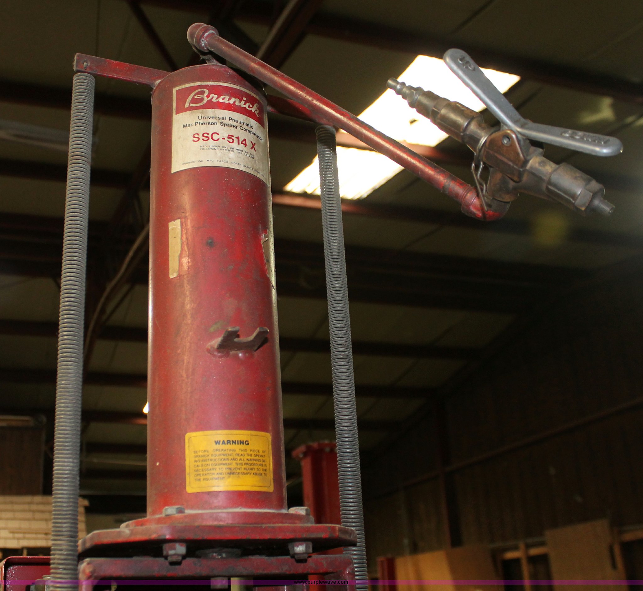 Branick universal pneumatic Mac Pherson spring compressor. Model SSC-514X, Manual retaining plate, Single level up-down operation. Shipping quotes available. 124 W Flinthills Blvd. Junction City, KS 66441