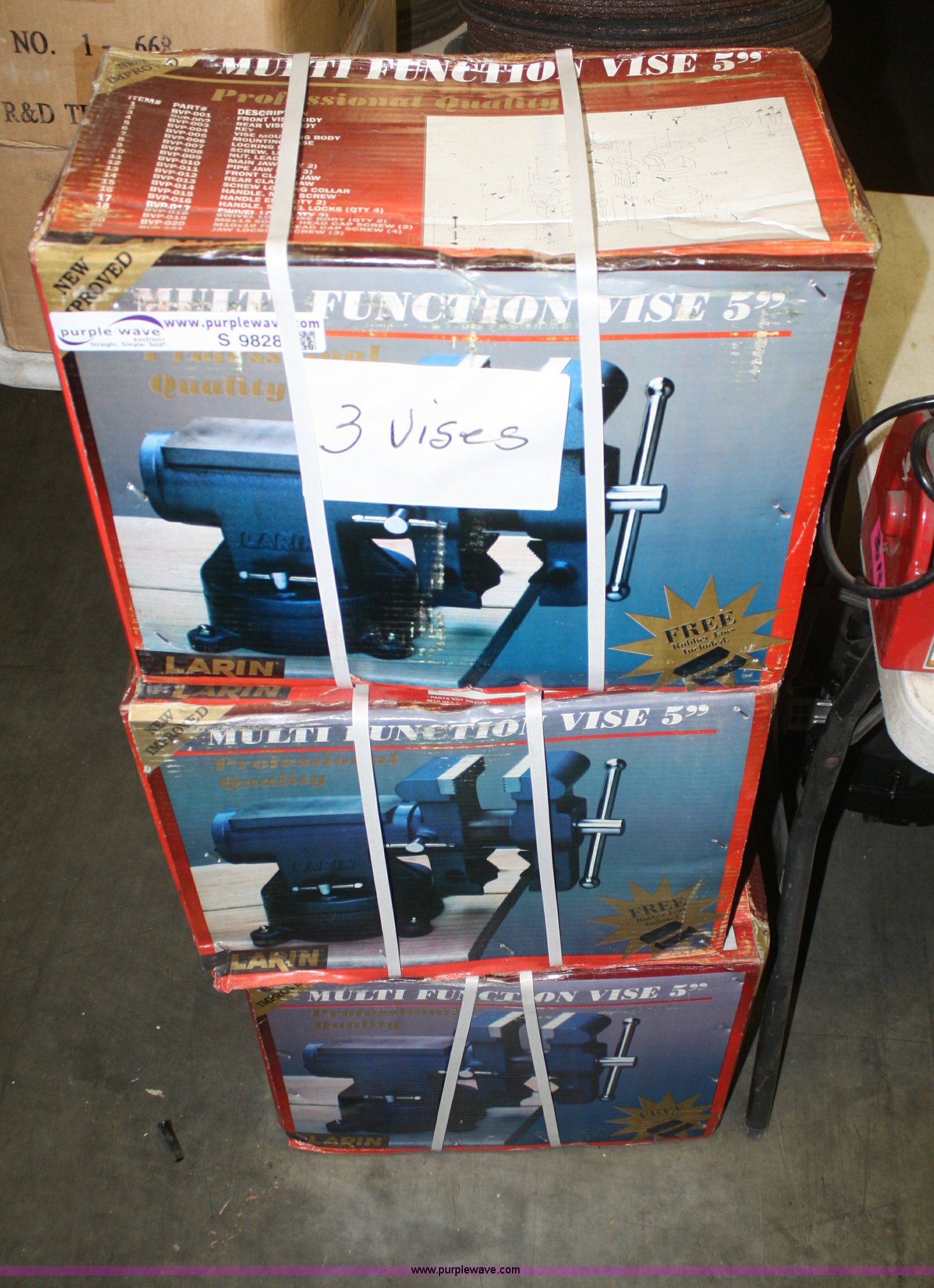 (3) Larin 5" multi-function vises. Model BVP-5, 360 degree rotating head and base, Multi-function pipe jaws, New in box. Shipping quotes available. TAP Enterprises, Inc.. 650 N Lincoln St. Spring Hill, KS 66083