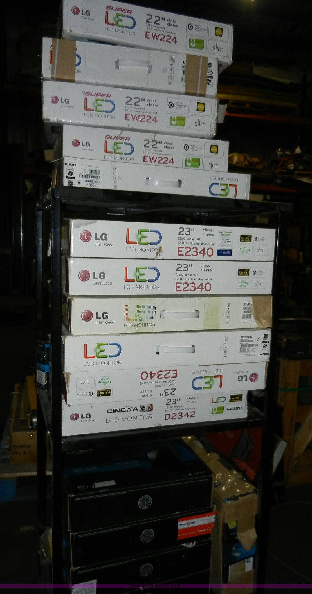 Purple Wave is selling a used Electronics in Kansas. This item is a Approximately 19 assorted monitors with the following: 16", 22", 23", 7", Brands include Vizio and LG, Untested, Rack included