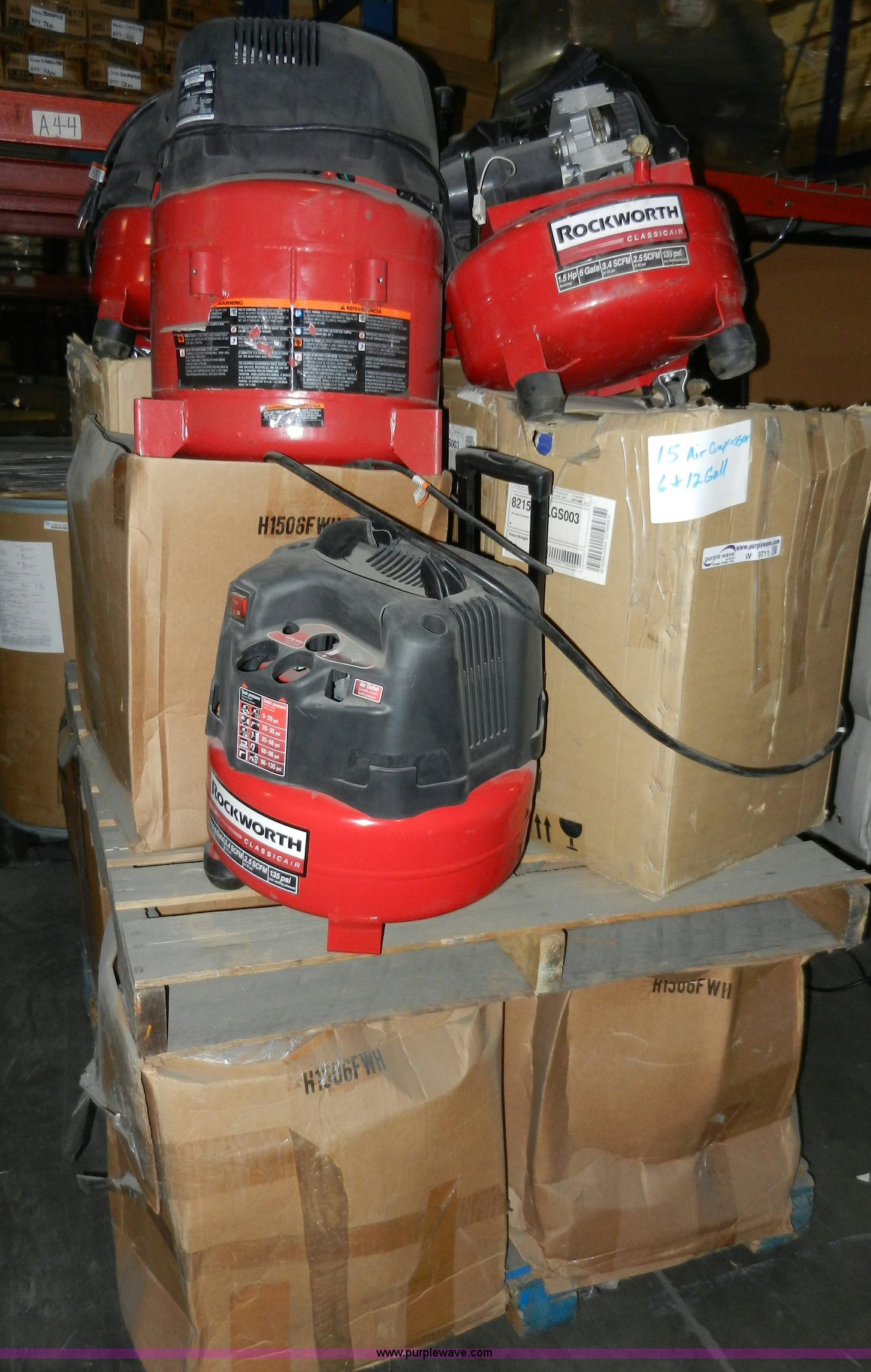 Approximately 15 Rockworth air compressors. 6 and 12 gallons, Untested returns. Shipping quotes available. TAP Enterprises, Inc.. 650 N Lincoln St. Spring Hill, KS 66083