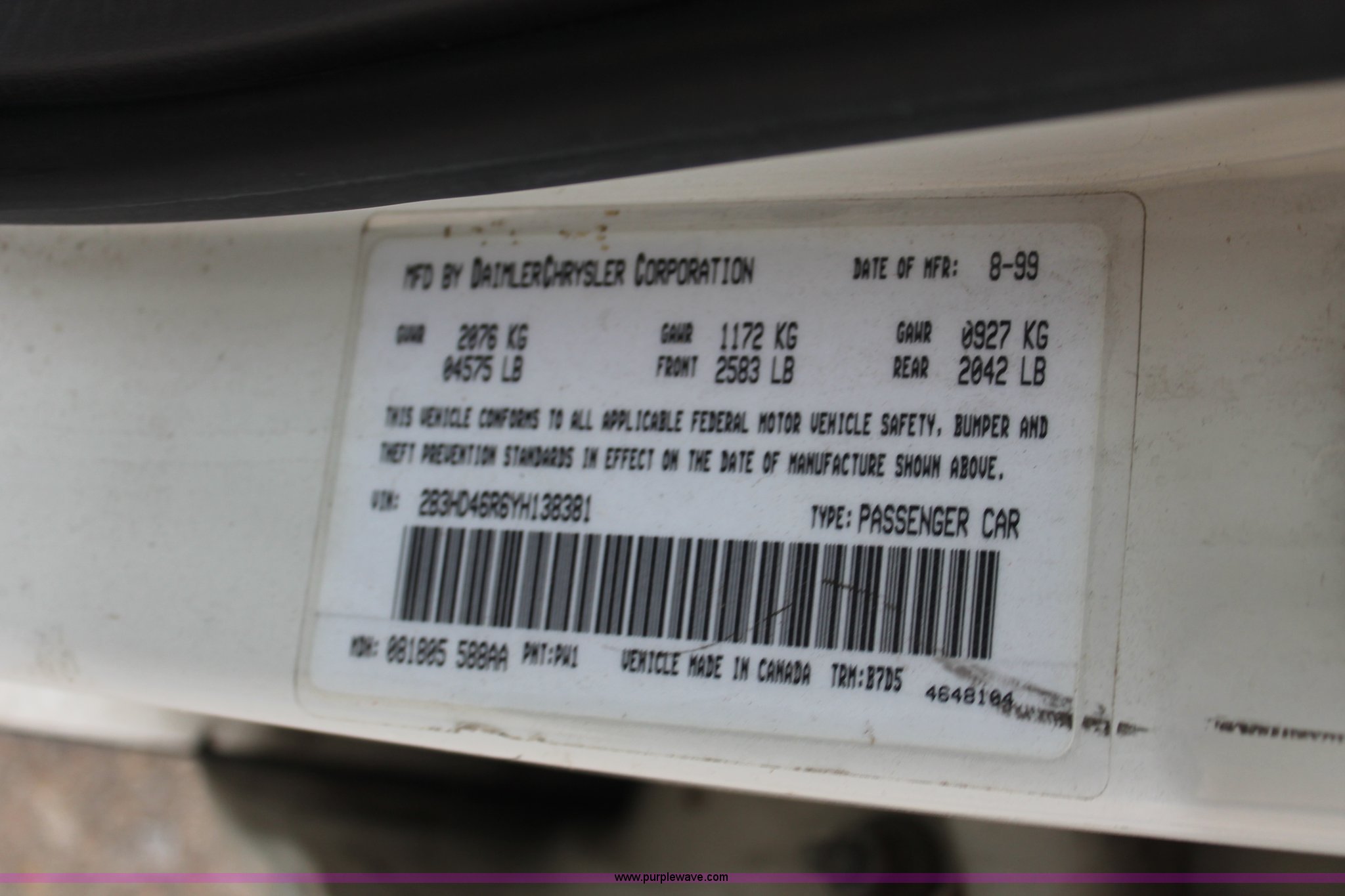 2000 Dodge Intrepid. Mileage unknown, 2.7L V6 DOHC 24V gas engine, Automatic transmission, AC and heat, Tilt, Cruise, AM/FM/cassette, Power windows, locks, and mirrors, Cloth interior, Keys, 225/60R16 tires, Dead battery, Air bags deployed, Front end collision damage, Unknown running condition, Case# 12C065044. Vehicle is abandoned. No additional information is available. Vehicle does not have keys unless notated otherwise in the item listing.. Buyer will receive paperwork indicating the abandoned status of the vehicle and which is sufficient to receive a title.. Items must be removed within 7 days following the close of the auction. Failure to do so will result in a $20 per day storage fee payable to the tow company. 2B3HD46R6YH138381. Shipping quotes available. Bud Roat Towing. 310 N Handley. Wichita, KS 67203