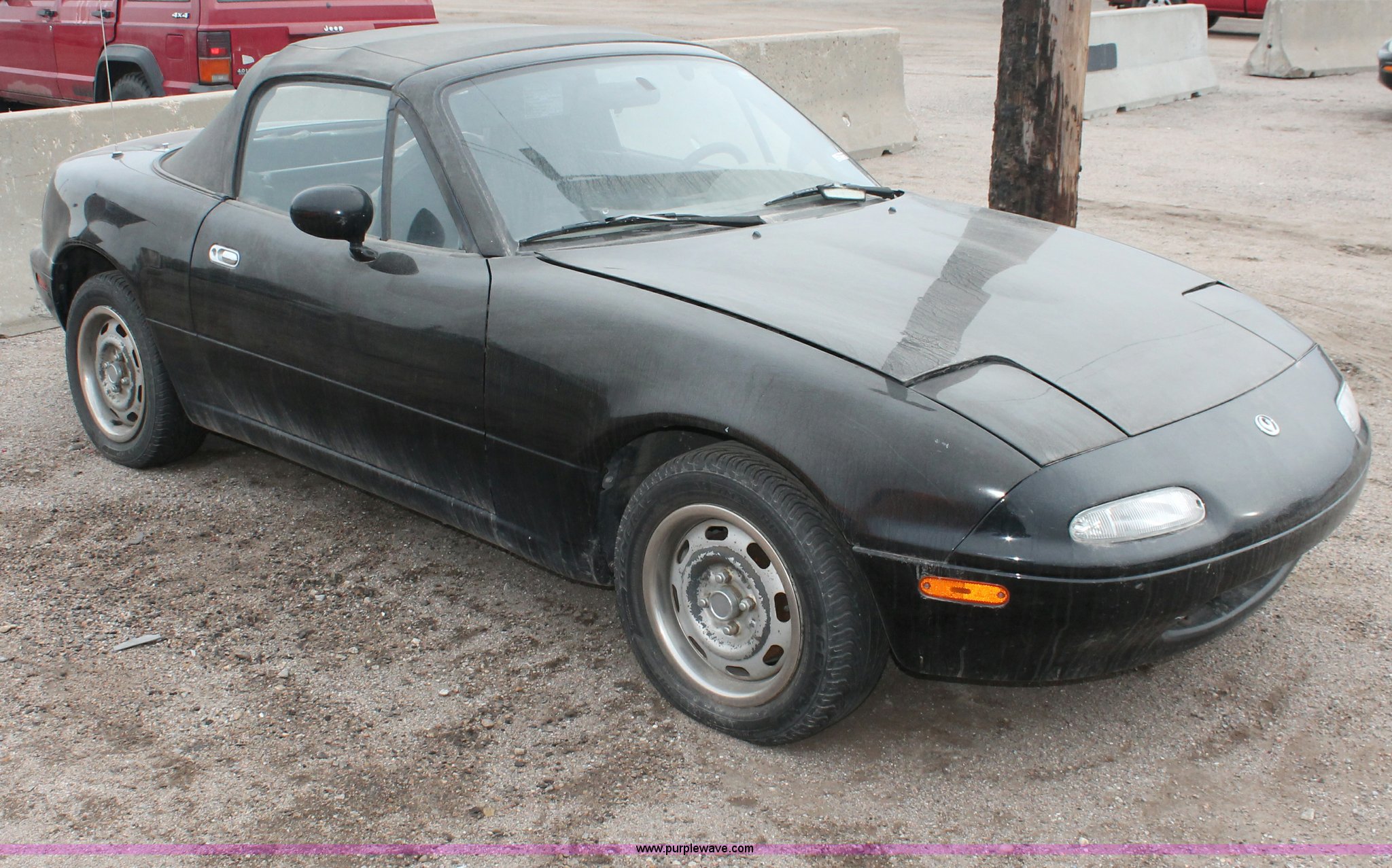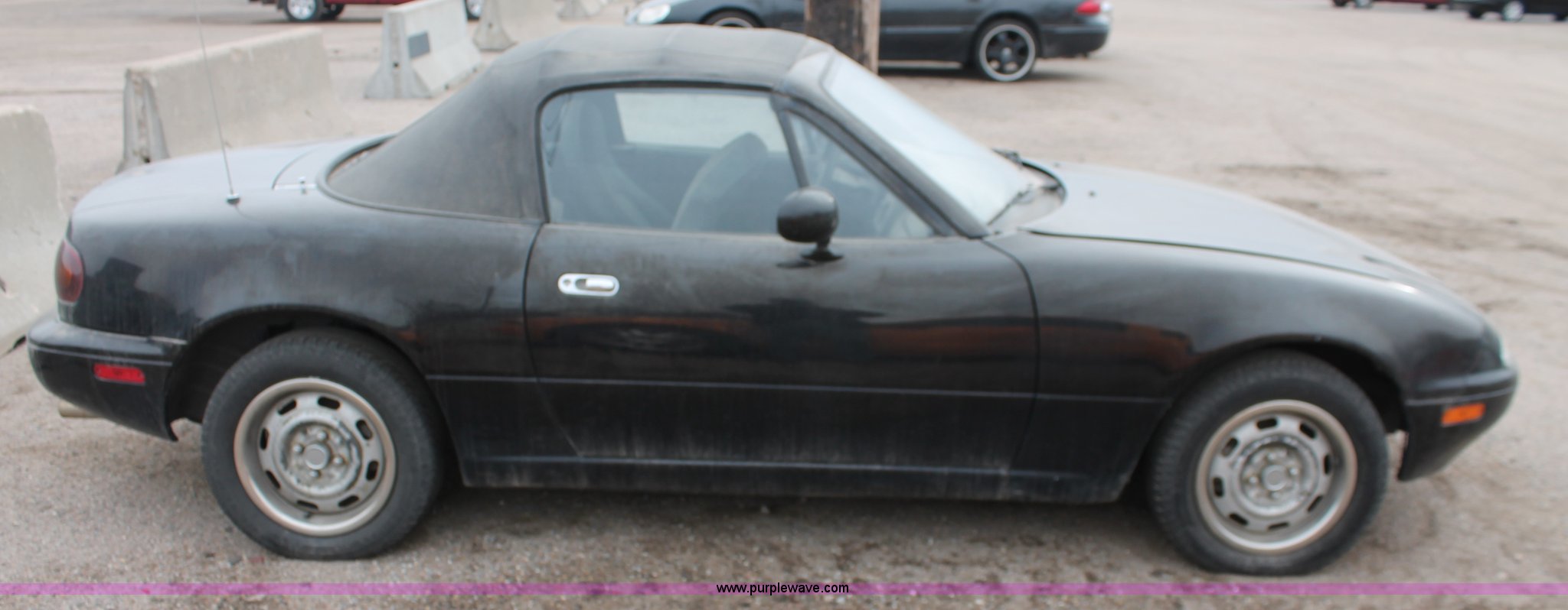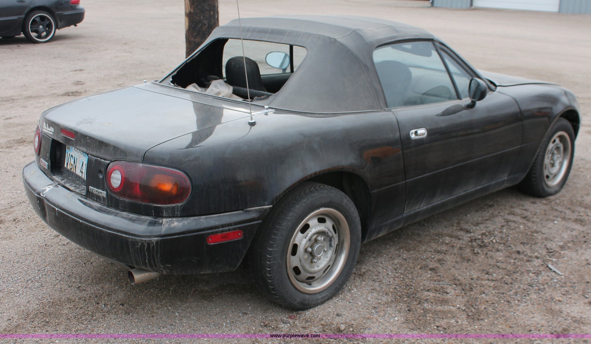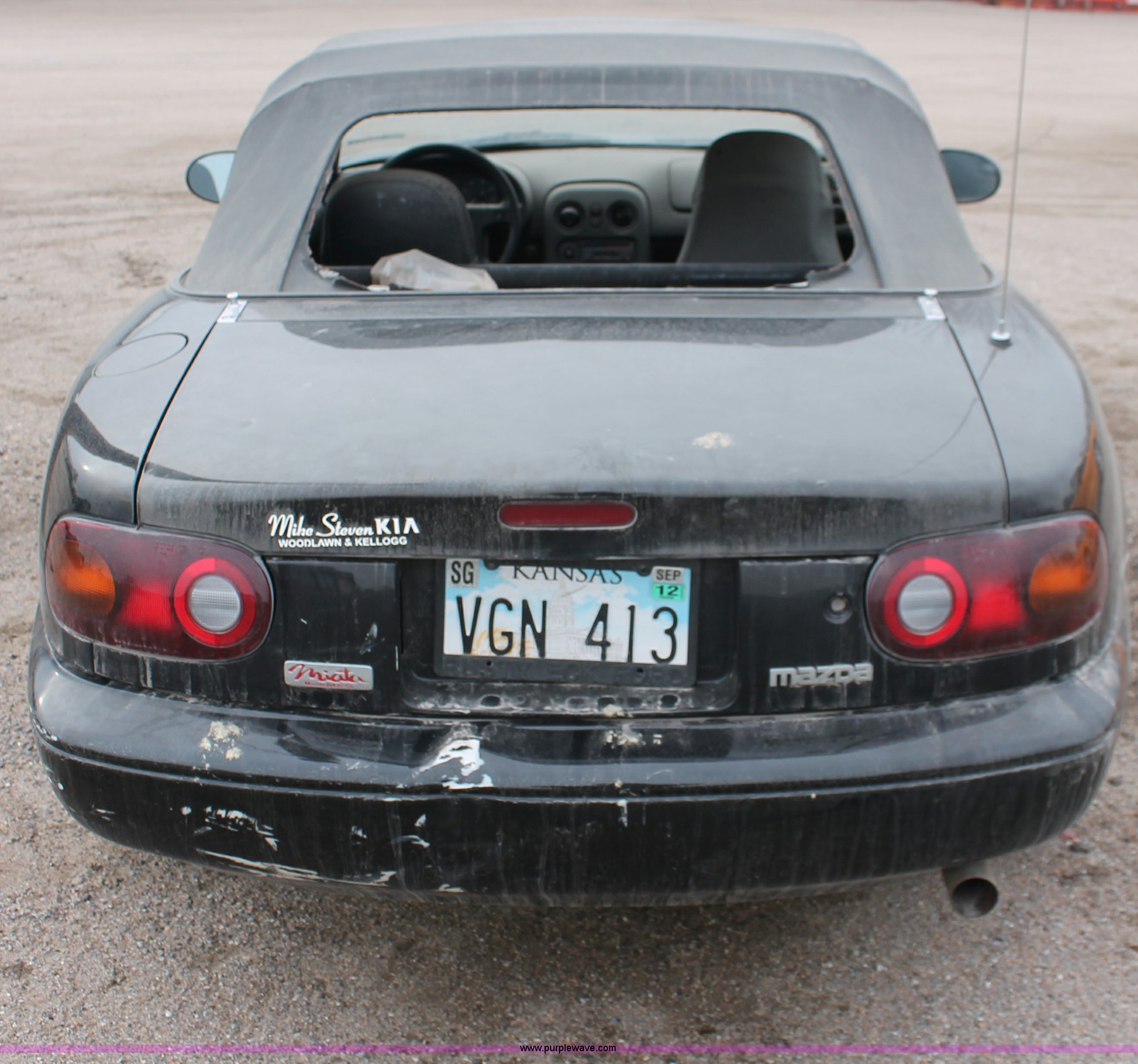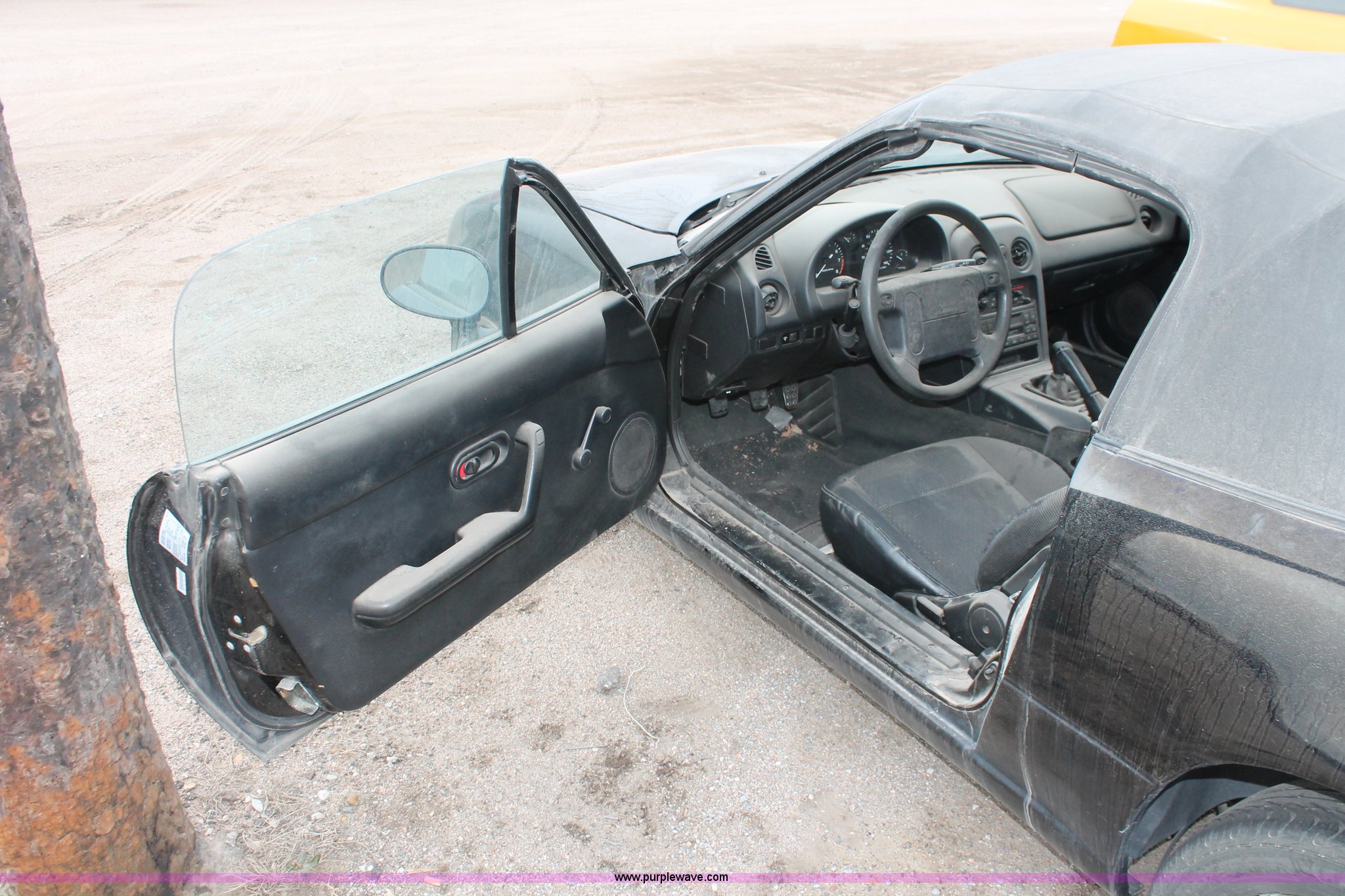 Purple Wave is selling a used Wrecked and Abandoned in Kansas. This item is a 1996 Mazda MX-5 Miata convertible with the following: 118,407 miles on odometer, 1.8L L4 DOHC 16V gas engine, Five speed manual transmission, AC and heat, Tilt, Cruise, AM/FM/cassette, Manual windows and locks, Cloth interior, Manual soft top, 185/60R14 tires, Vehicle starts, Rear window missing, Driver's side dents, Unknown driving condition, Keys, Case # 12C066095
