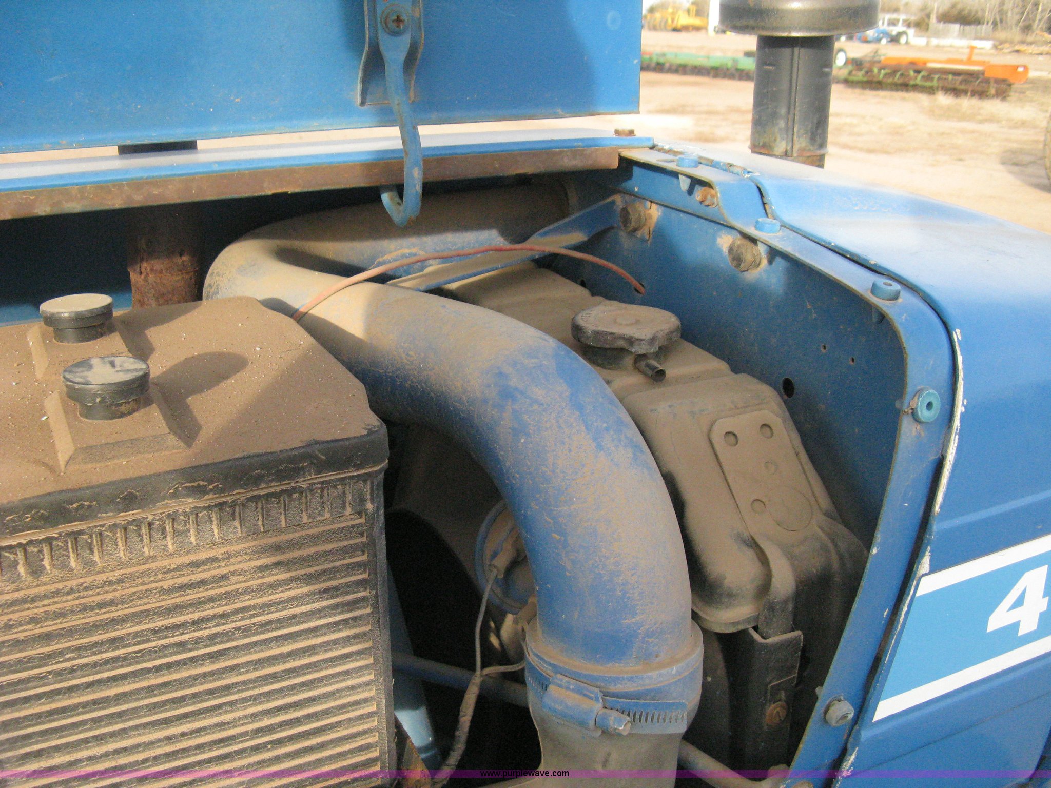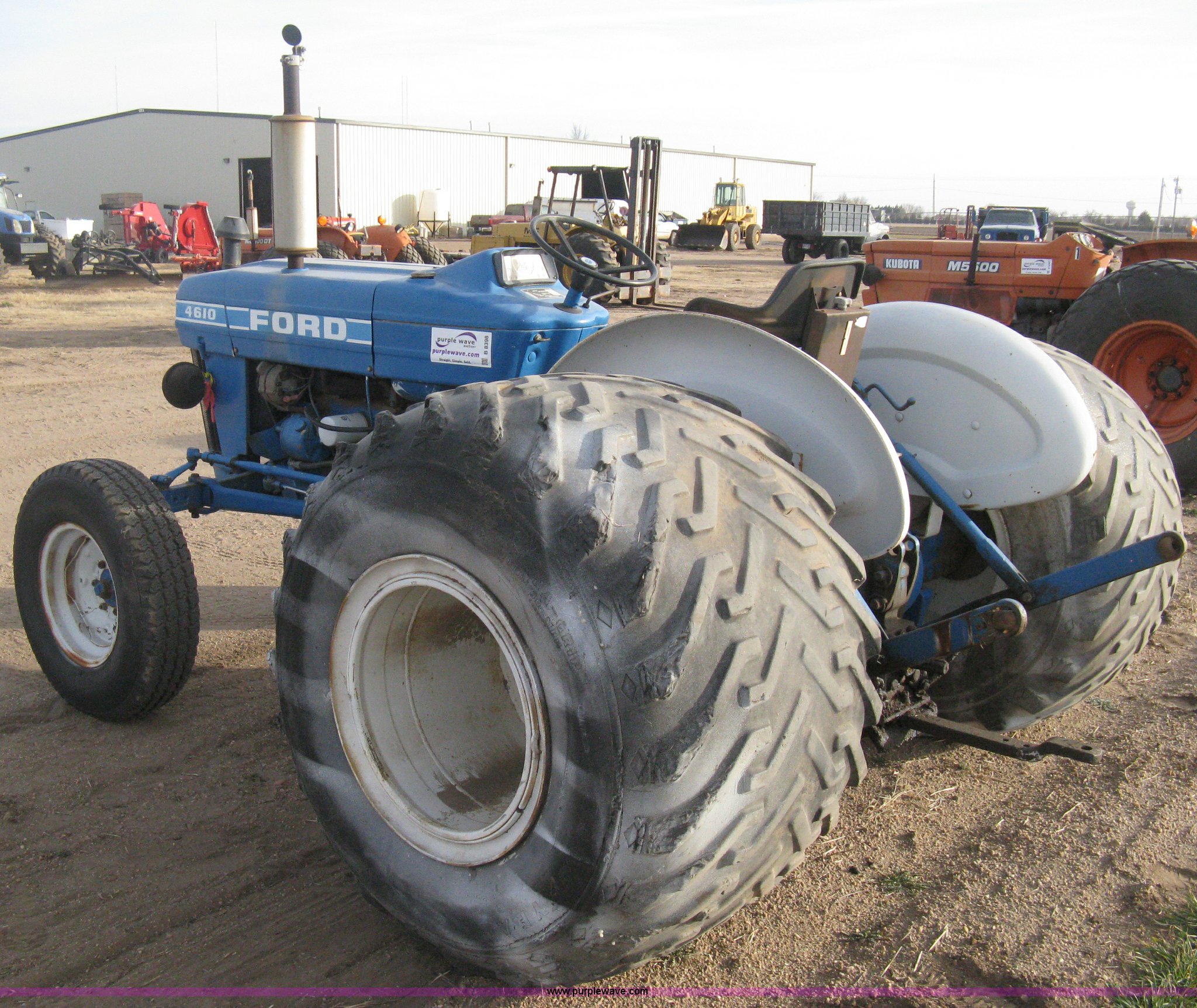 Purple Wave is selling a used Tractor in Kansas. This item is a Ford 4610 tractor with the following: 4,403 hours on meter, Ford T7 three cylinder diesel engine, Manual transmission, 8F-2R gears with Hi/Lo, Foot and column throttle controls, Three point, Draw bar, 540 PTO, Single rear hydraulic remote, LT235/85R16 front tires, 48 x 31.00-20 rear floater tires, Battery is dead, Serial 1702831