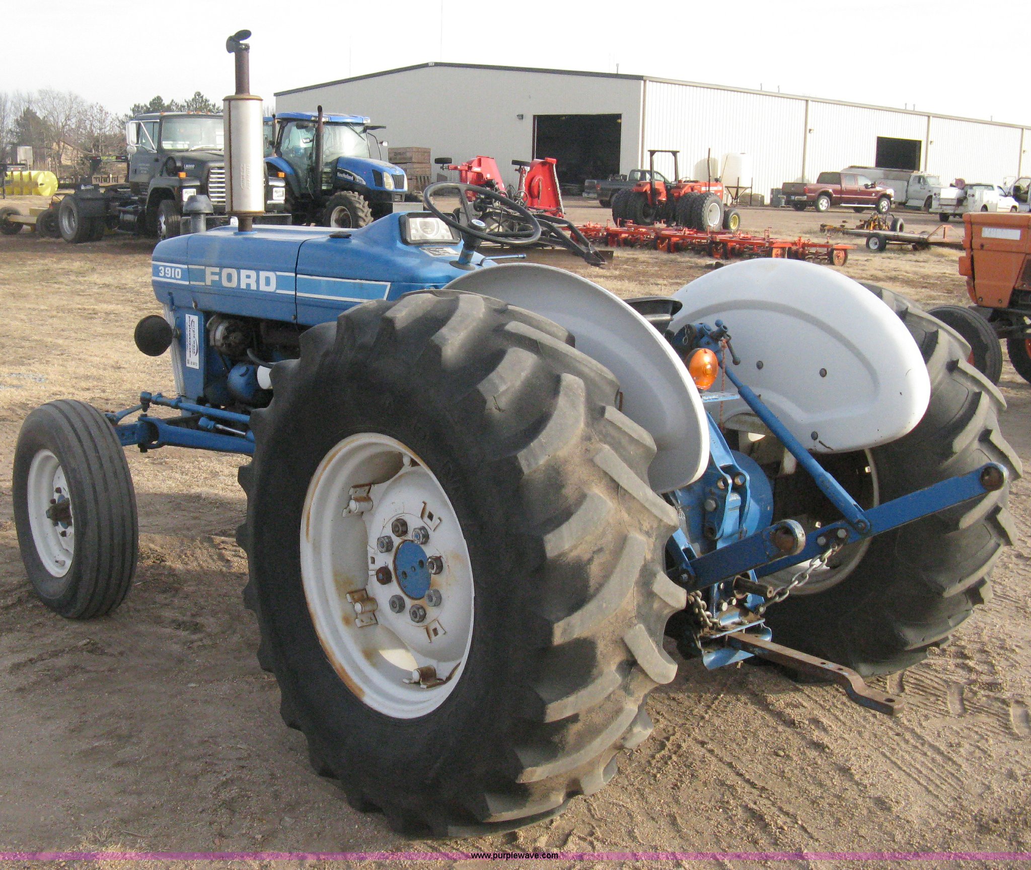 Purple Wave is selling a used Tractor in Kansas. This item is a Ford 3910 tractor with the following: 4,585 hours on meter, Ford T7 three cylinder diesel engine, Manual transmission, 8F-2R gears with Hi/Lo, Foot and column throttle controls, Three point, 540 PTO, Singe rear hydraulic remote, 9.5L-15 front tires, 16.9-24 rear tires, Serial 02058311