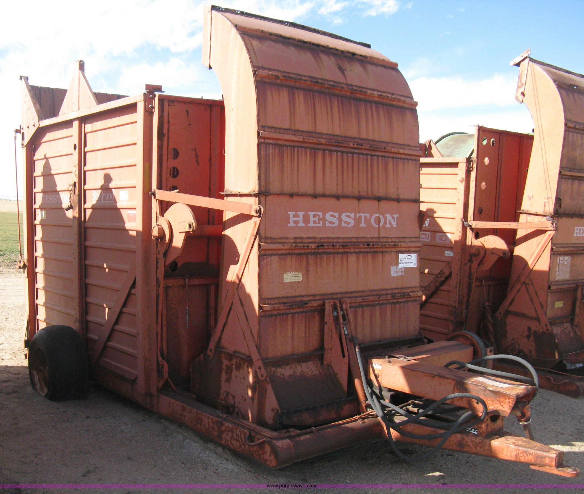 Hesston Stakhand 10. 3,000 lb max load, 60"W pickup chute, Hydraulic and PTO driven, 15" tires Flat/damaged, Damaged hydraulic hoses, No PTO end shaft, Drive belts damaged, Rust damage to floor, Operating condition unknown. Shipping quotes available. 6121 N. 119th Street W.. Maize, KS 67101
