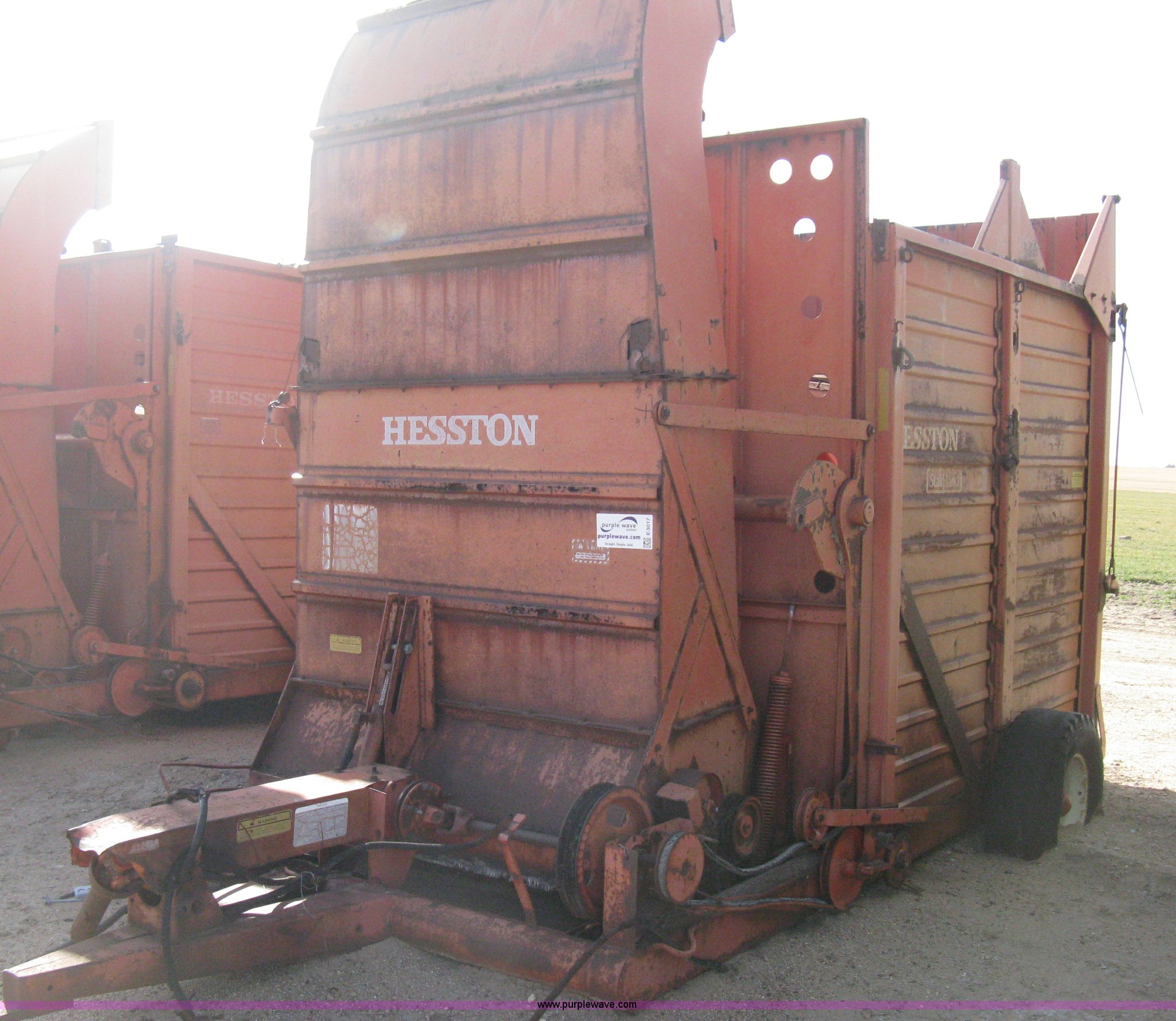 Hesston Stakhand 10. 3,000 lb max load, 60"W pickup chute, Hydraulic and PTO driven, 15" tires Flat/damaged, Damaged hydraulic hoses, No PTO end shaft, Drive belts damaged, Rust damage to floor, Operating condition unknown. Shipping quotes available. 6121 N. 119th Street W.. Maize, KS 67101