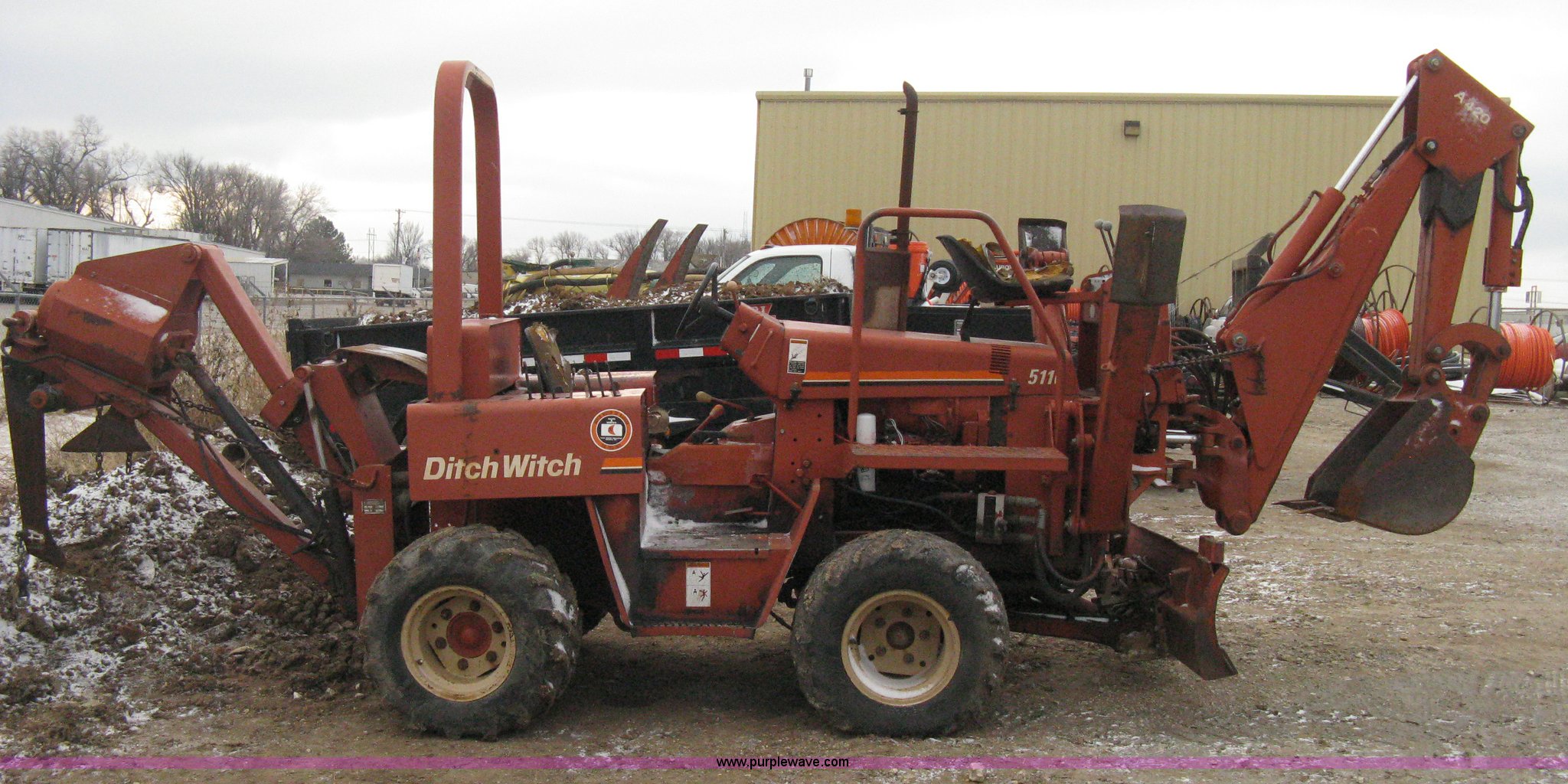 Purple Wave is selling a used Trencher or Rock Saw in Kansas. This item is a 1992 Ditch Witch 5110 trencher with the following: 6,884 hours on meter, Model 5110DD, Three cylinder diesel engine, Four speed transmission, Four wheel drive, Right angle drive, Ditch Witch A420 backhoe attachment, 18" toothed bucket, Hydraulic outriggers with dirt pads, 6' push blade, Serial 1J1208, Ditch Witch A430 vibratory plow, 24" feed blade, 31x15.50-15NHS tires, Serial 5J0318